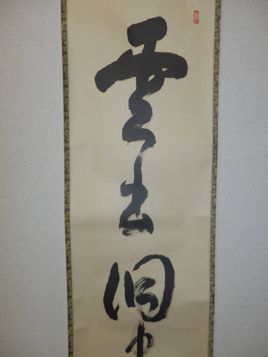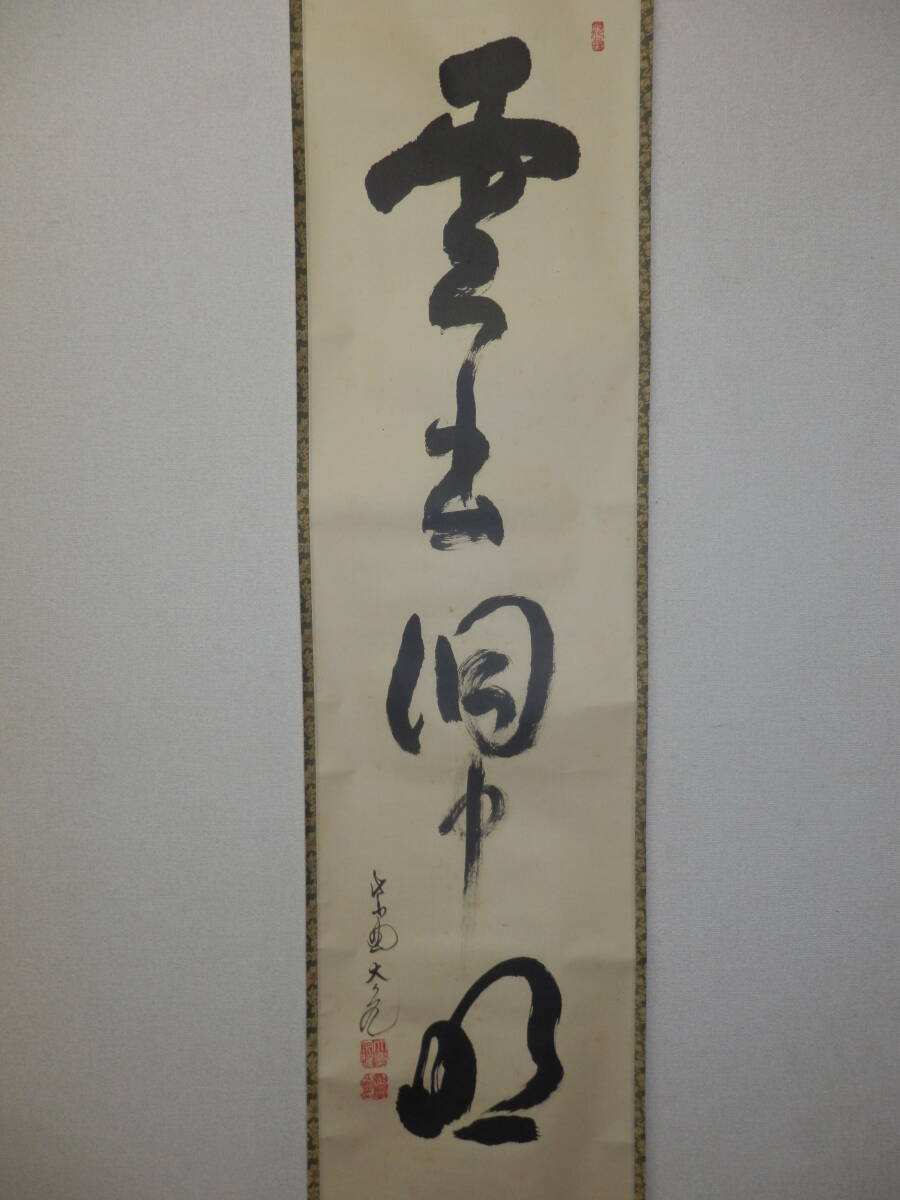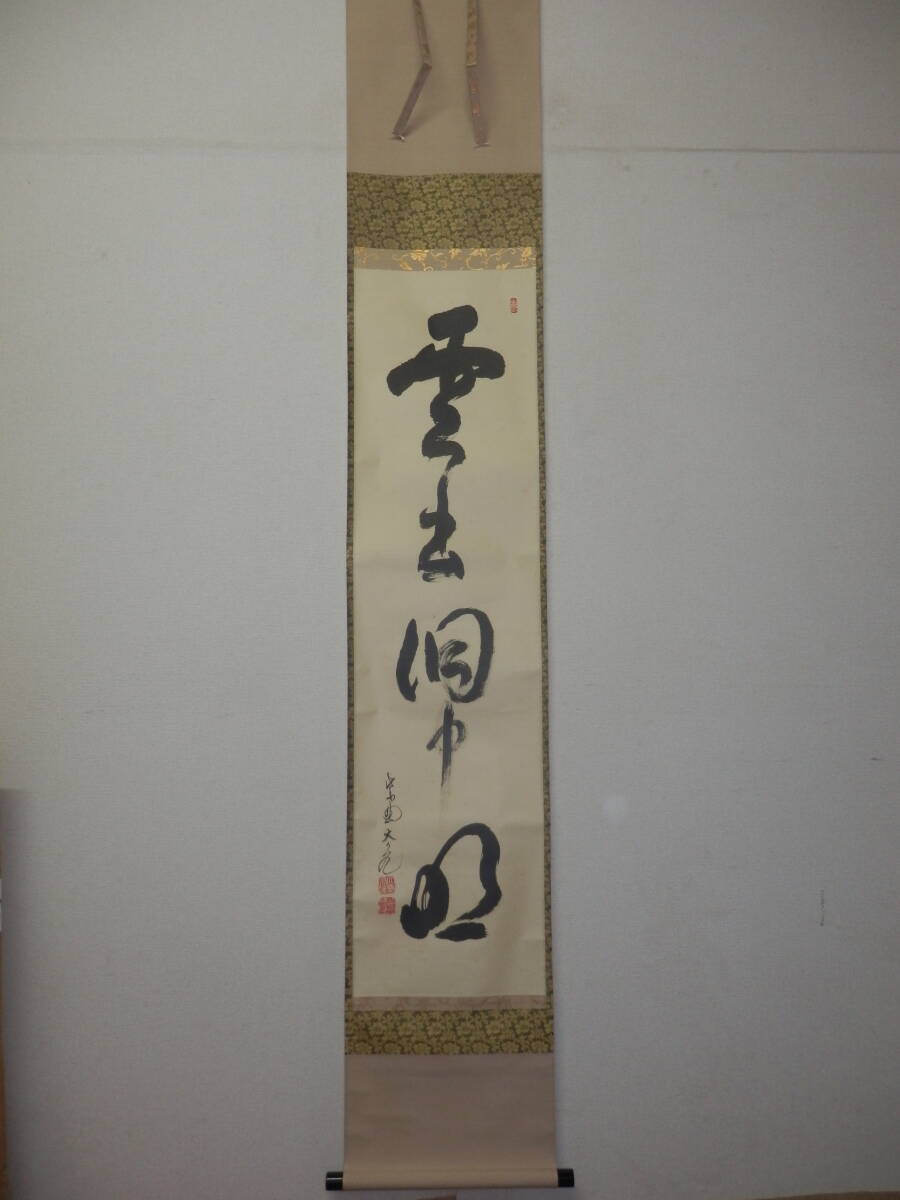 「中古品・掛軸」 大徳寺の如意庵の立花大亀師筆の一行書の掛軸です。「雲出洞中明」です。 シミ、折れ等有。 軸幅約37cm 長さ約193cm 桐共箱「ヤケ、シミ等有」。 『真作保証・真作でないと証明された場合は返品を承ります』。どうぞ宜しく。