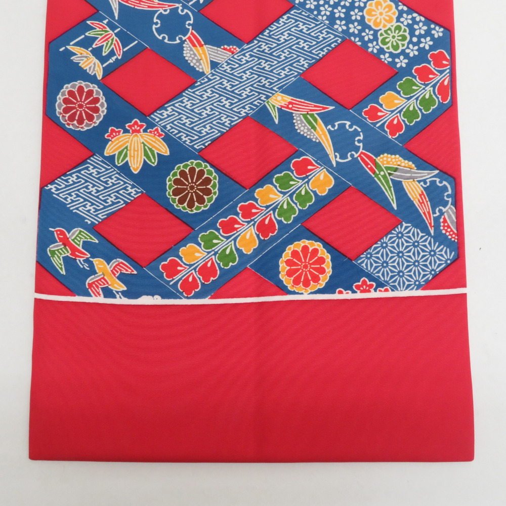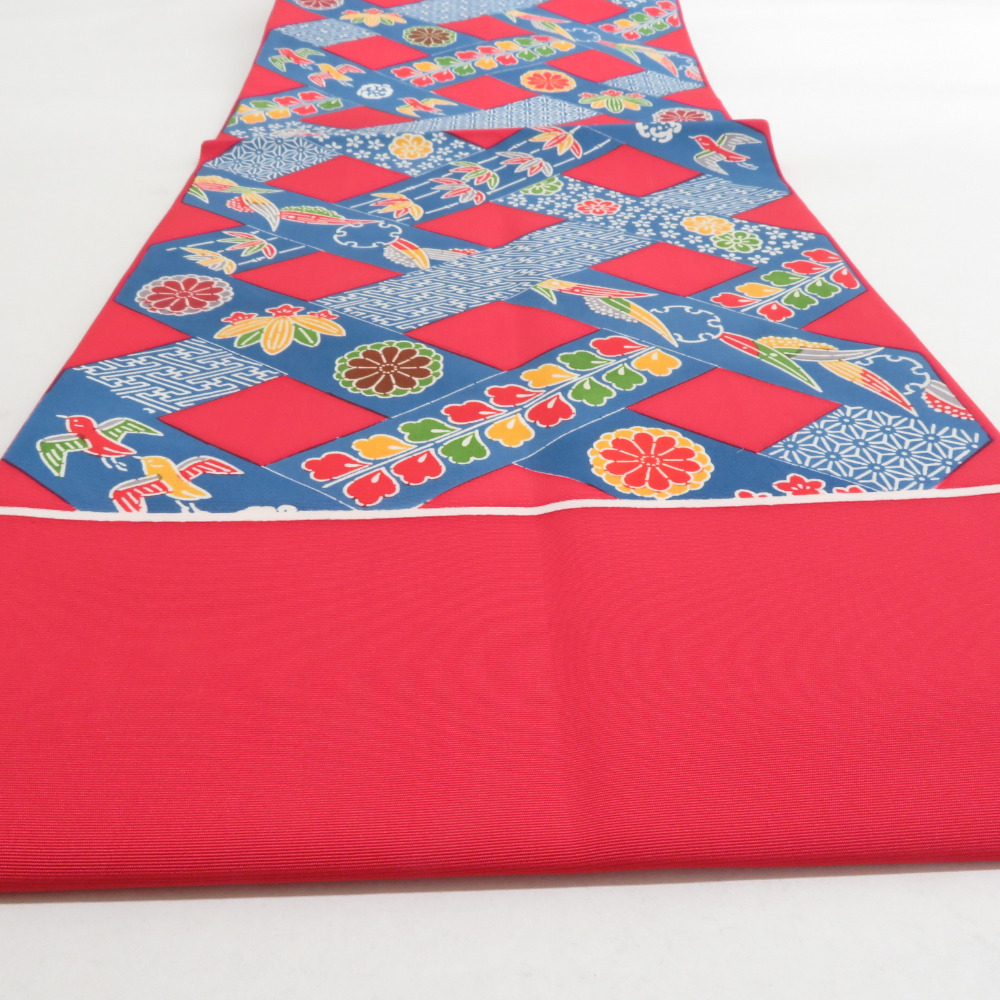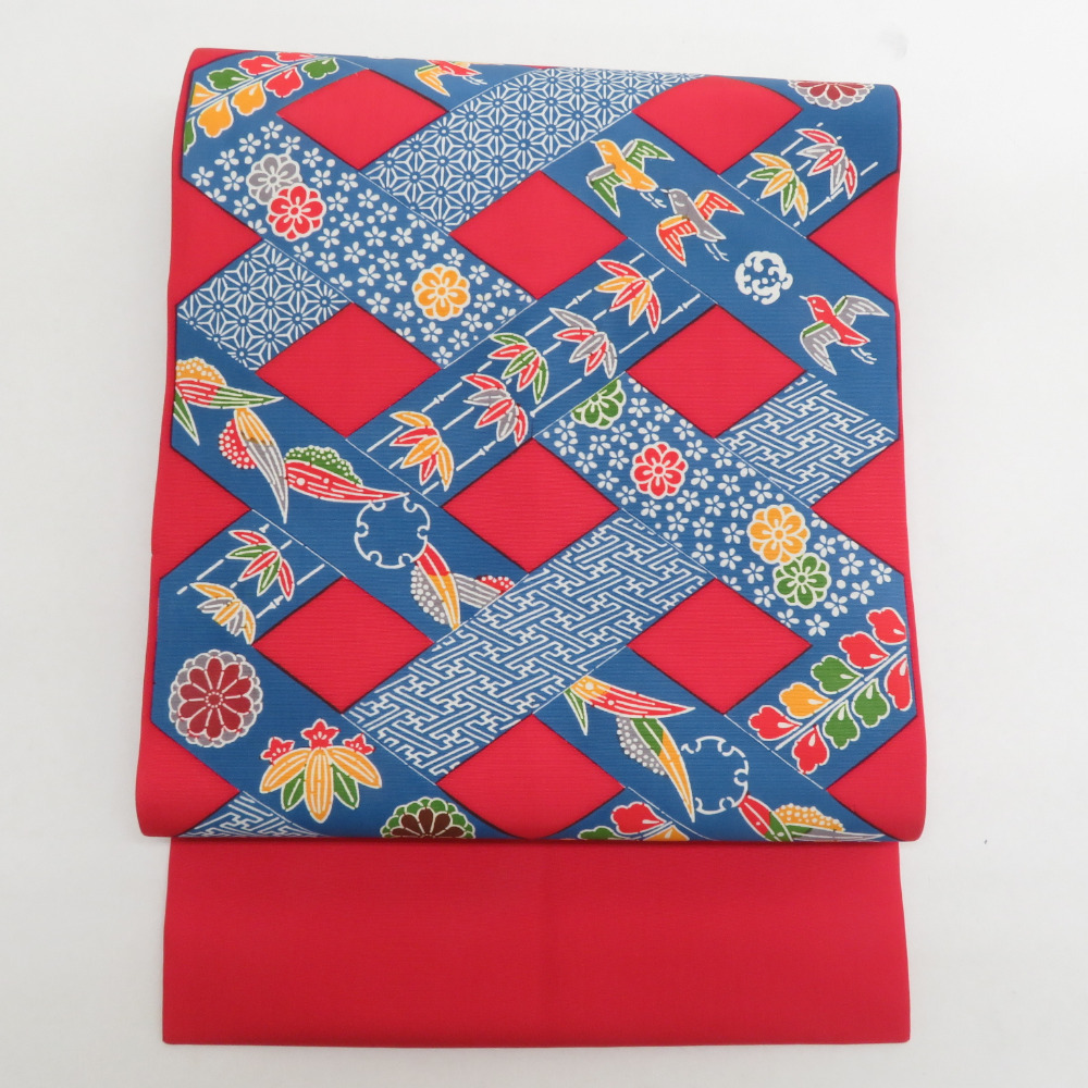 | 名古屋帯 正絹 型染め 塩瀬 赤色x青色x多色 カラフル 幾何学模様に鳥と花々模様 全通柄 カジュアル 仕立て上がり 着物帯 長さ368cm |