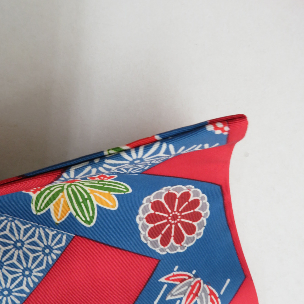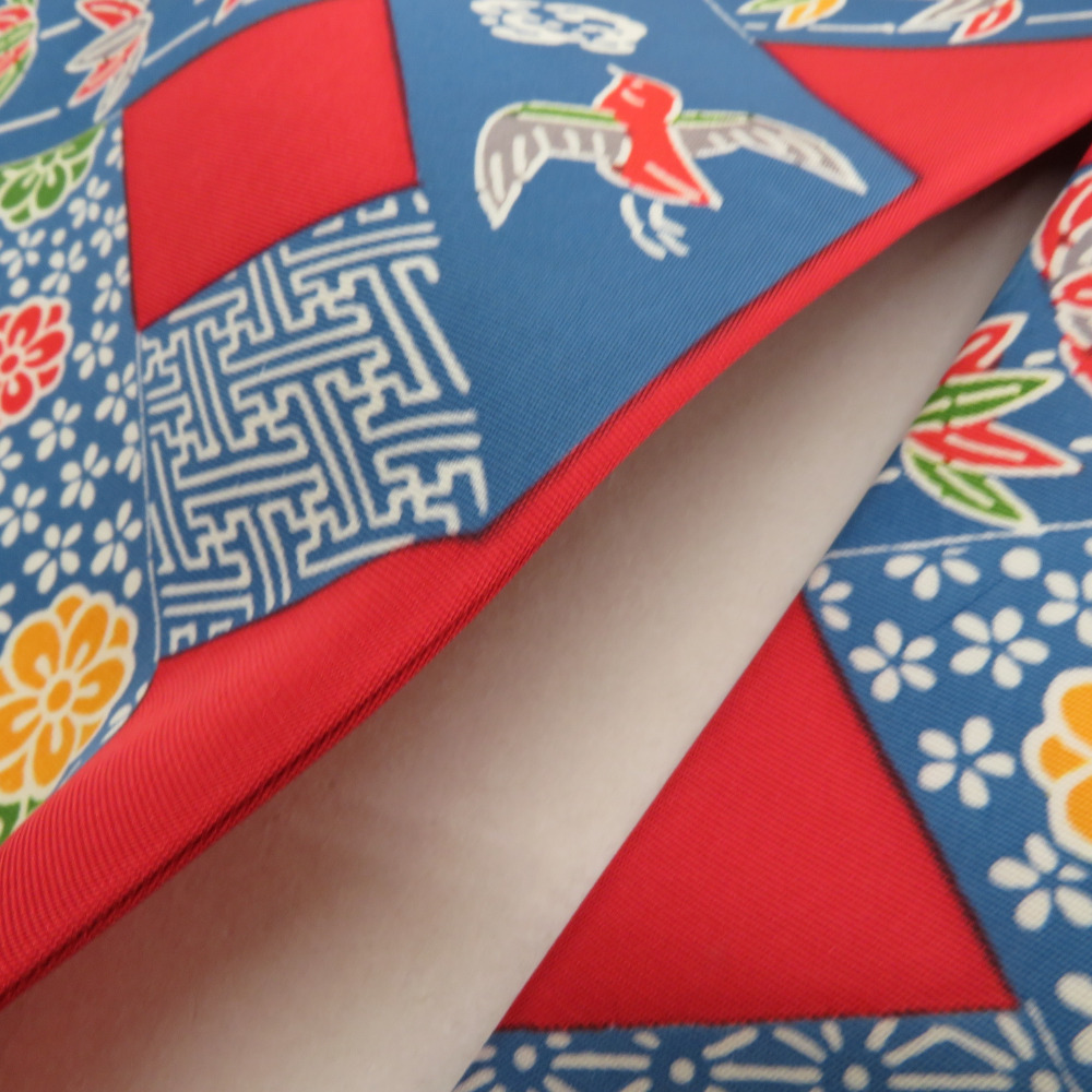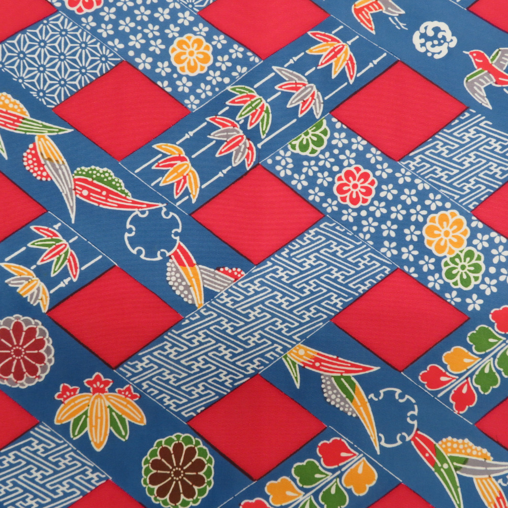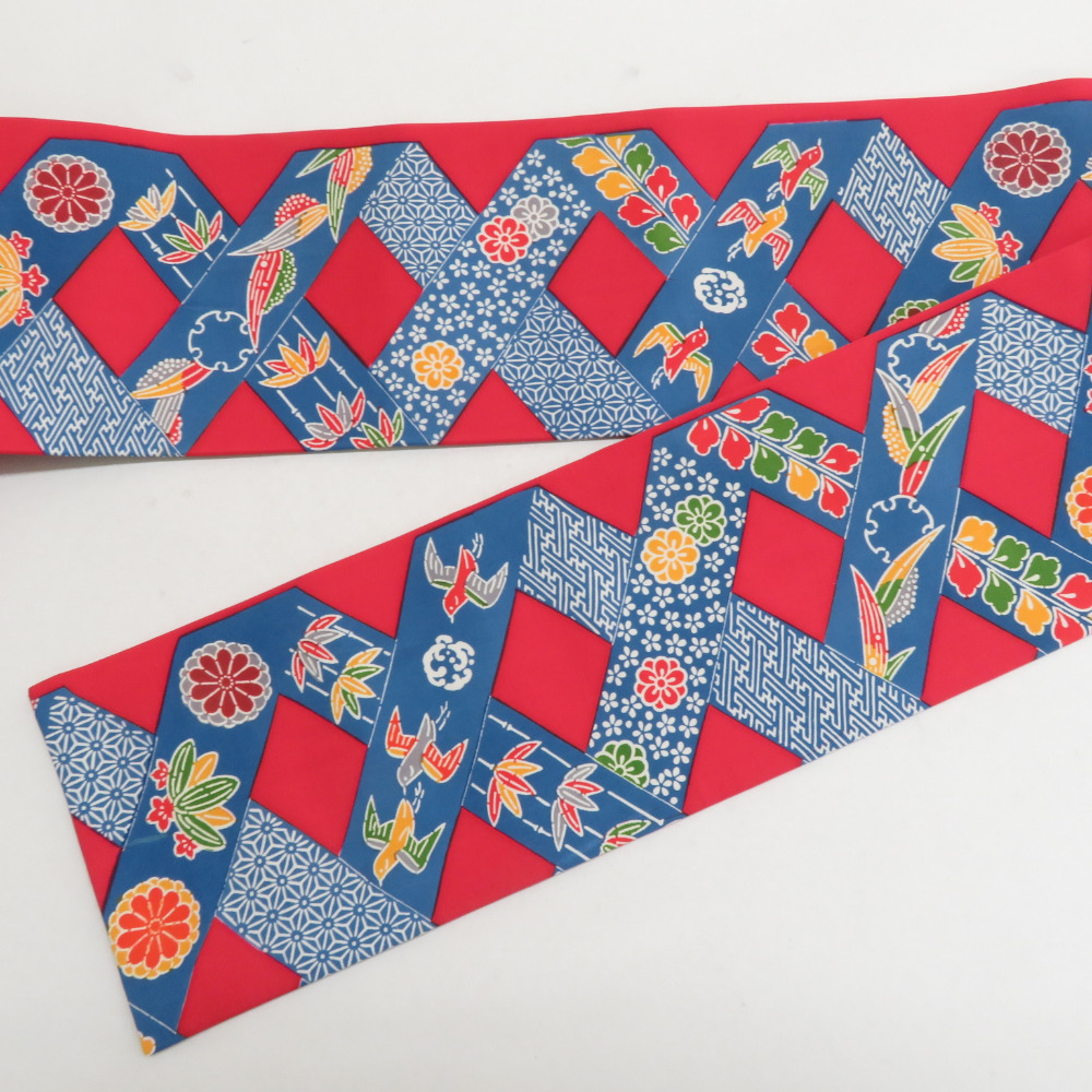 | 名古屋帯 正絹 型染め 塩瀬 赤色x青色x多色 カラフル 幾何学模様に鳥と花々模様 全通柄 カジュアル 仕立て上がり 着物帯 長さ368cm |