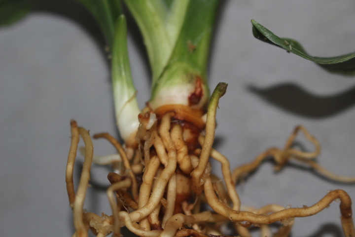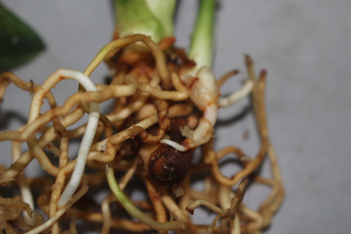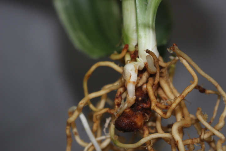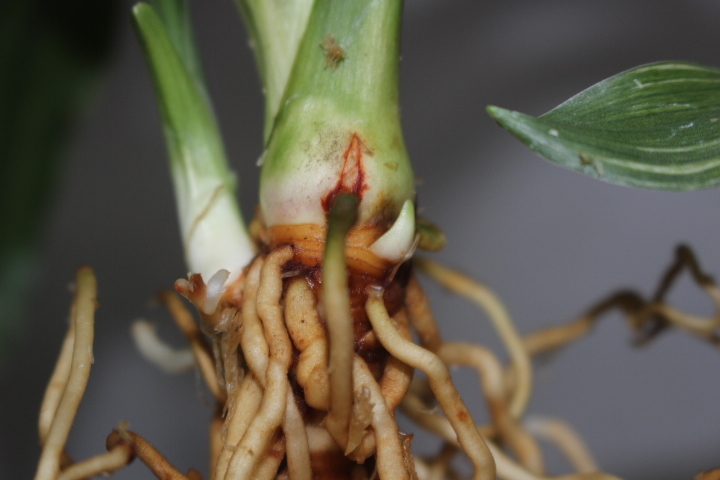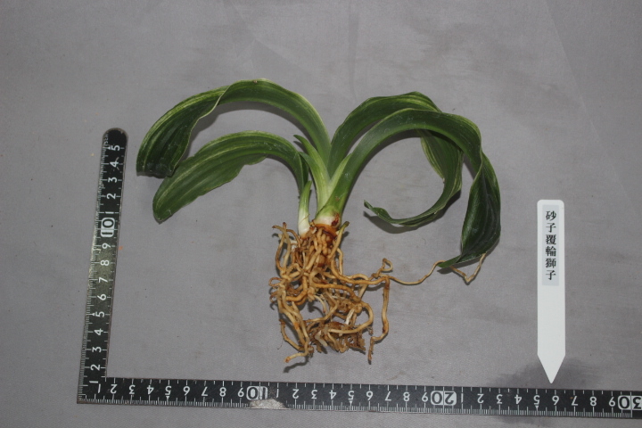 砂子覆輪獅子の1本子付きの2本立ちです。  伸びて来そうな芽が1本と芽アタリがあります。  イモは良い状態です。     撮影日  10月 9日     写真をよく見て、ノークレーム・ノーリターンでお願いします。