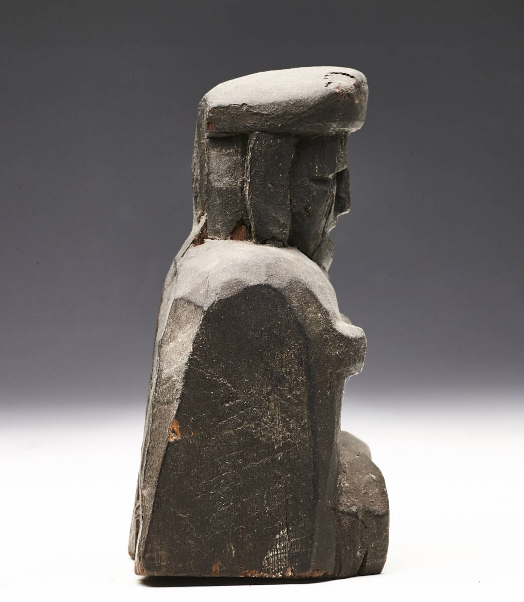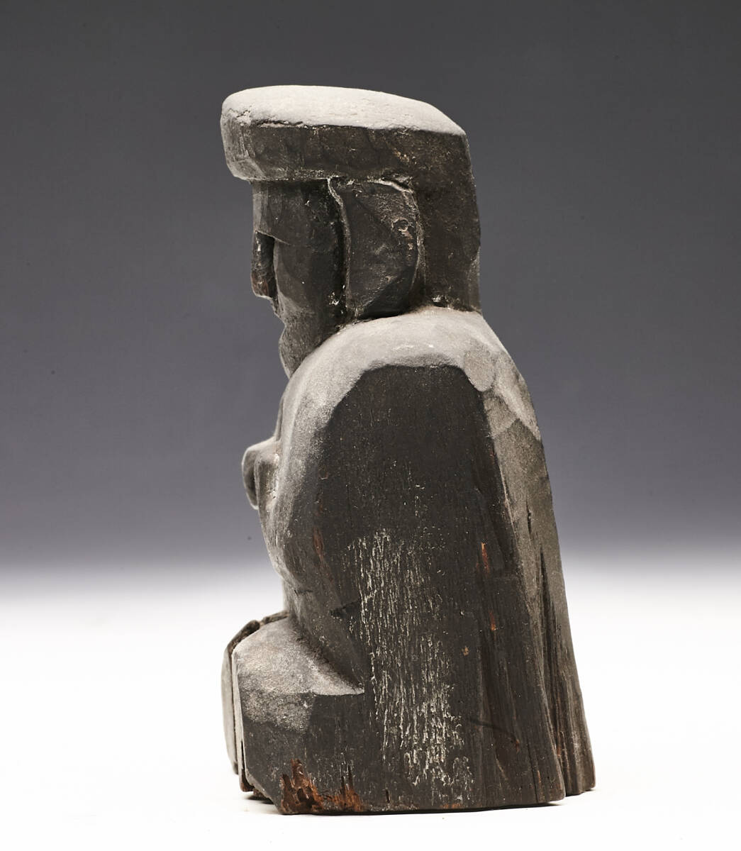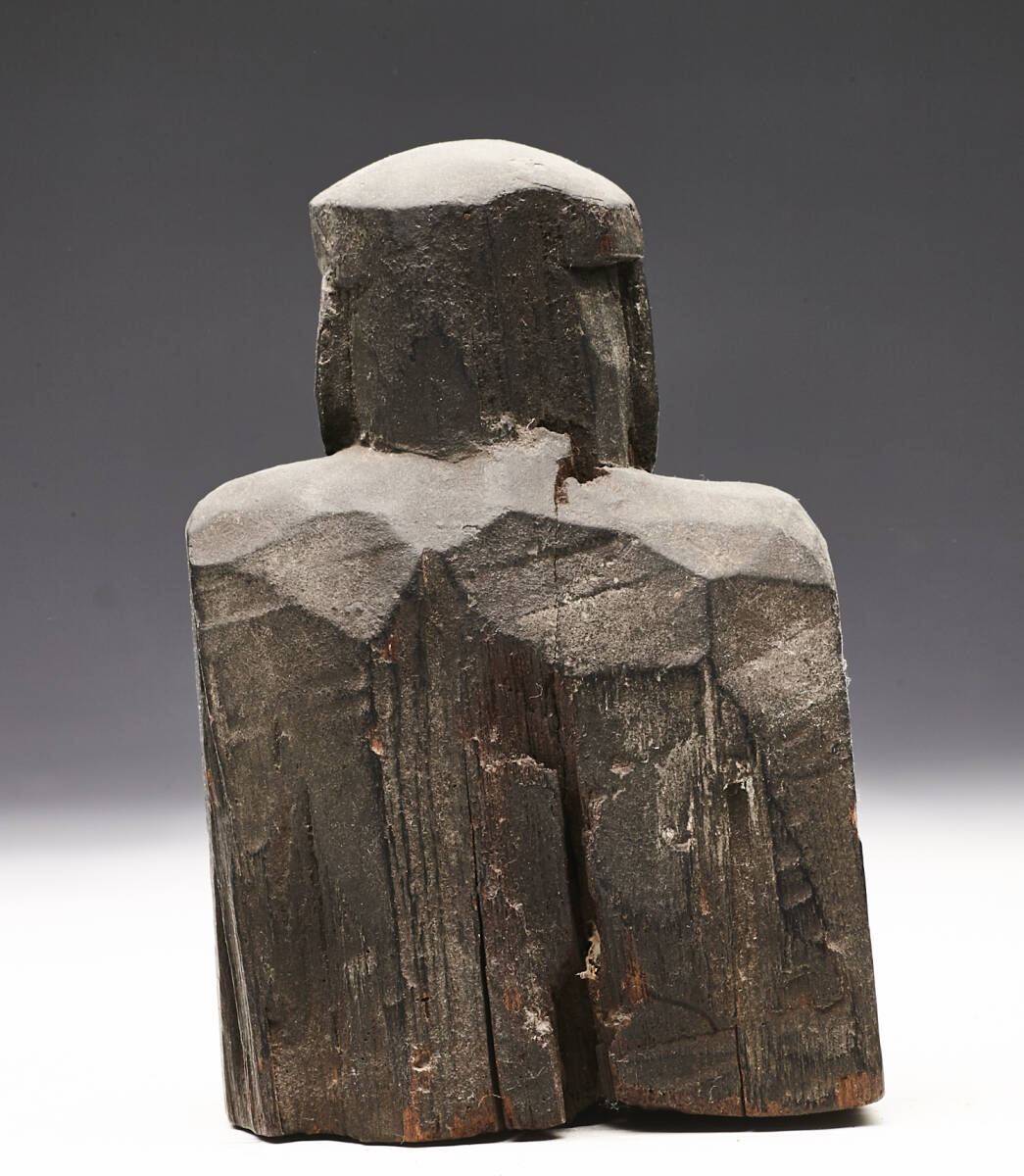 あわただしさが日増しに募る現代、私たちの心を落ち着かせてくれるのは、時の流れに左右されない者たちです。それは、人生で一番大切なものは、何かを私たちに気づかせてくれるものたちです。恵比寿大黒様は、室町中期に福の神として親しまれるようになりましたが、江戸時代になると庶民の願いごとも多くなり、どの家も家の内をひっそりと見守るように祀られました。貧しくて笑うことの少ない日々の暮らしの中で、精一杯微笑みを忘れないという日本人特有の性格は、この時に微笑の造形佛の造形と共に育まれてきたものと思われます。近代となっても恵比寿大黒さま、庶民の商いや事業を成功させる願いを叶えます。たとえば、馬越恭平という人物は、ビールなる飲み物を日本中に普及する事業に取り組みいまにみるように楽しい空間を作ることに情熱を捧げました。また御木本幸吉という人物は、世界中の女性の首をしめて貴婦人に変えてしまう事業を興し成功させました。ご両人とも、のちに富豪と呼ばれましたが、実は、恵比寿大黒様の信望者で、その熱心なコレクターとなって、長寿の生涯を過ごされたことは、もっと知られていてもいいでしょう。その恵比寿大黒様が、幾多の地震や大火をくぐり抜けて今ここに姿かたちを現した強運のものたちです。長い年月へっついの湯気と煤にまみれて古色経年を帯び黒光りする様は、恵比寿大黒様にこそ許されるものです。この個性豊かな表情で、笑みを湛え穏やかなパワーを放つお姿をぜひ評価していただければ、幸いです。この作品は、造形作家の60年におよぶ個人コレクションからの出品となります。恵比寿大黒様は【日本の民族彫刻】としての造形に相当すると考えます。