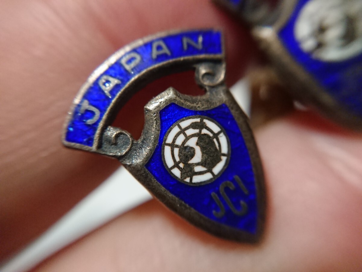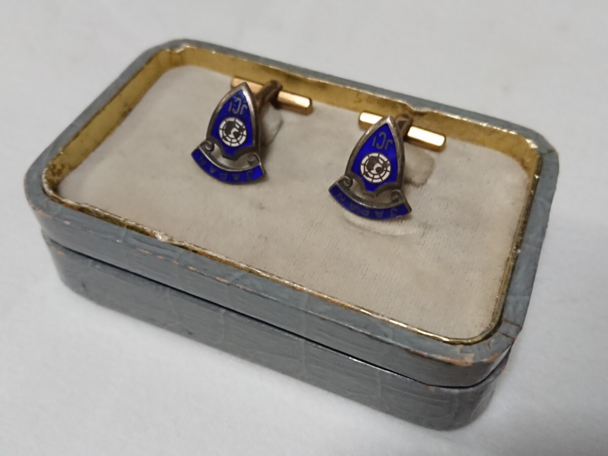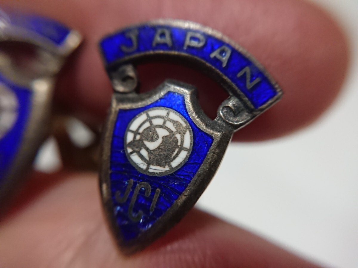 昭和期頃のカフスボタンでボックス付きです。【JAPAN JCI】‥(国際青年会議所(Junior Chamber International: JCI)の日本組織物かと思います。エナメル加工がされている裏側に【SILVER】刻印がみられますが留め部分側までシルバーかはわかりません。