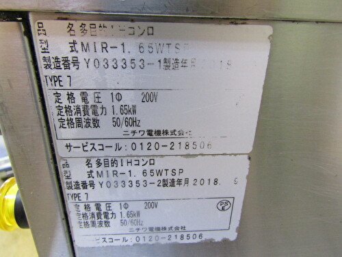 【IH多目的コンロ】MIR-1.65WTSP ニチワ  2018年製 中古