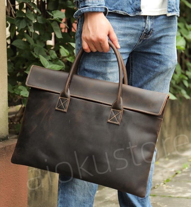 美品☆高級本革 厚手牛革 メンズバッグ ブリーフケース ビジネスバッグ 手作り トートバッグ 14PC対応 A4書類 通勤 出張 鞄##C054