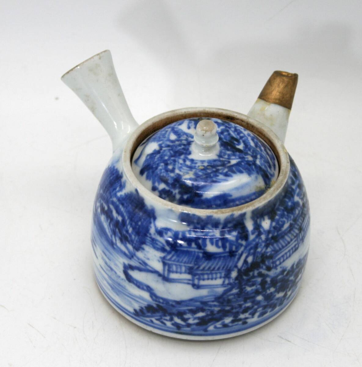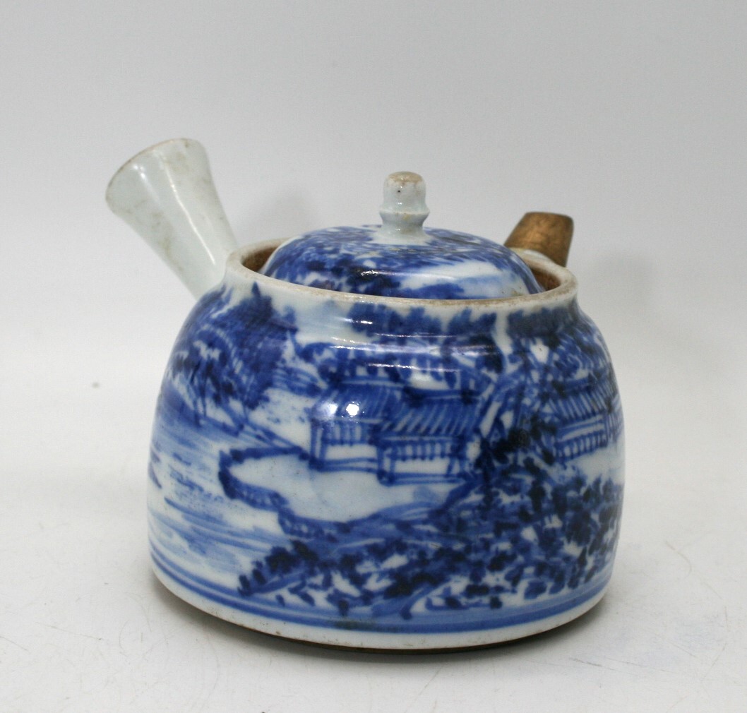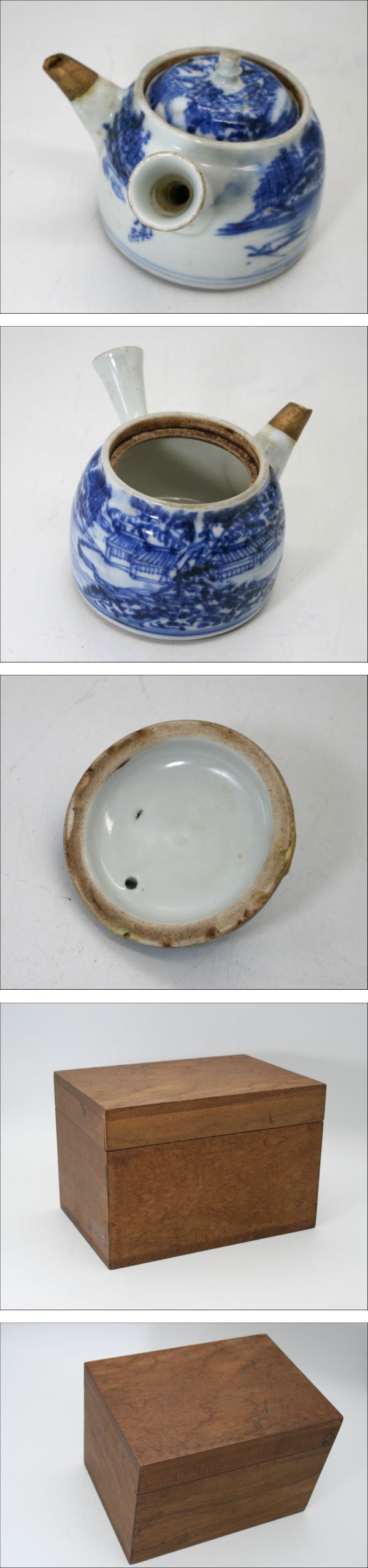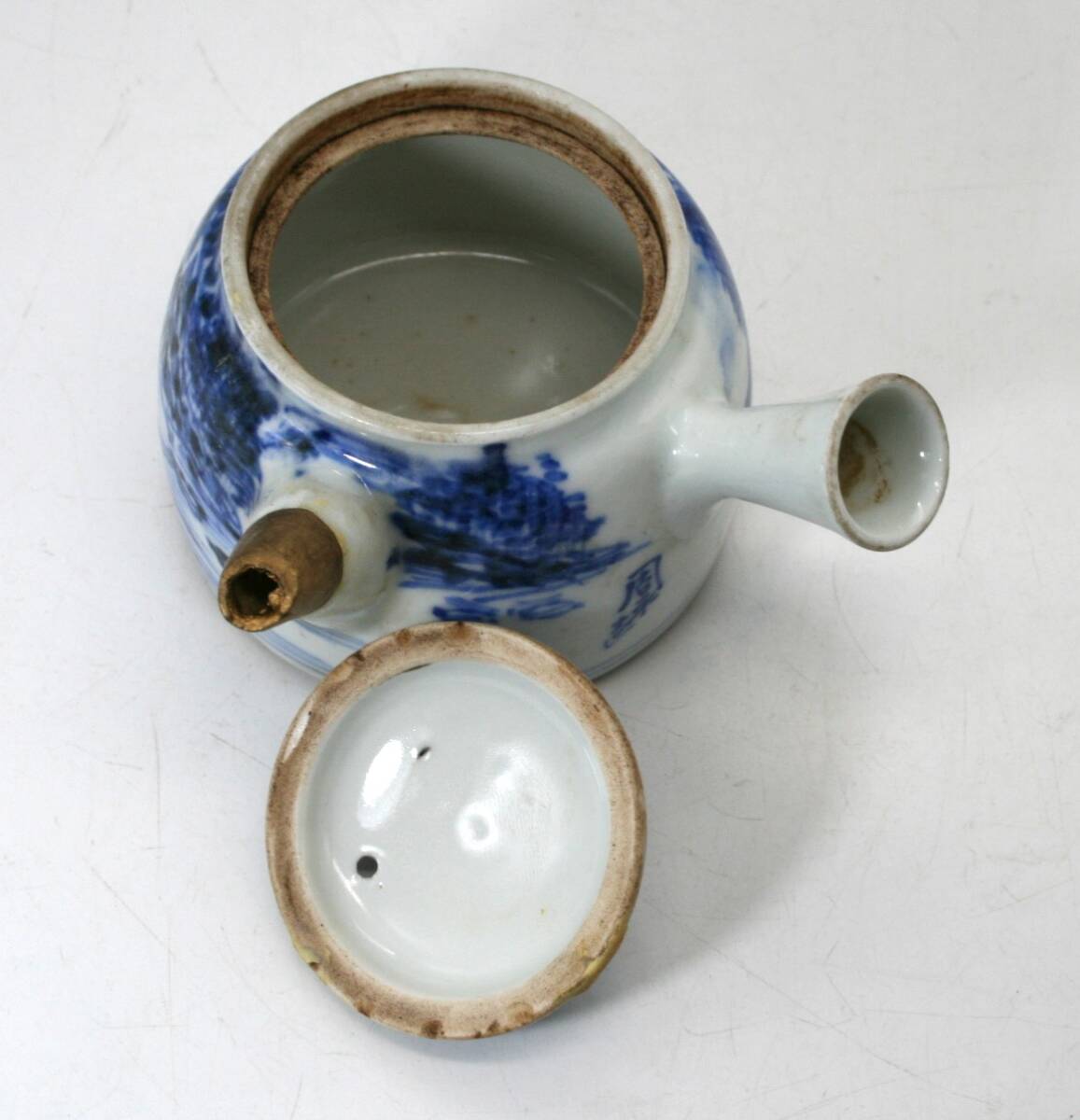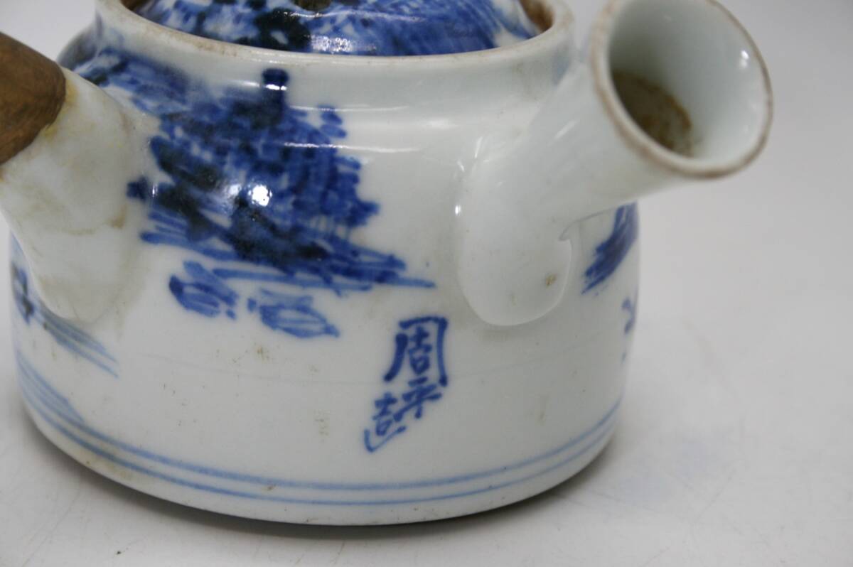 『周平造』染付 楼閣山水風景図 急須 在銘 直径8㎝ 高さ7.2㎝ 合わせ箱付 横手急須 注ぎ口金継ぎ直しあり | |||