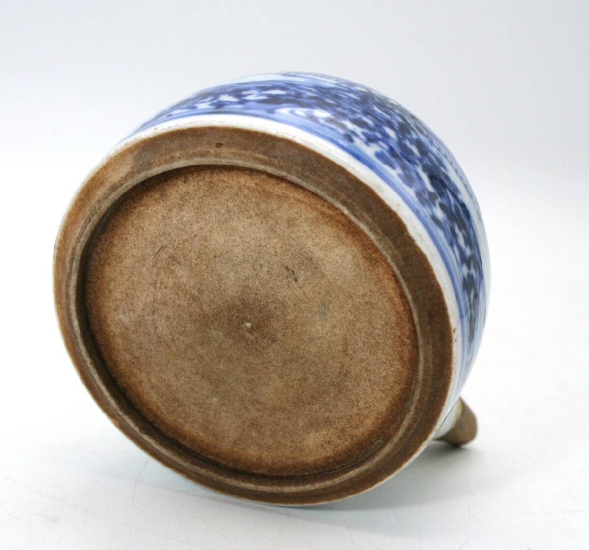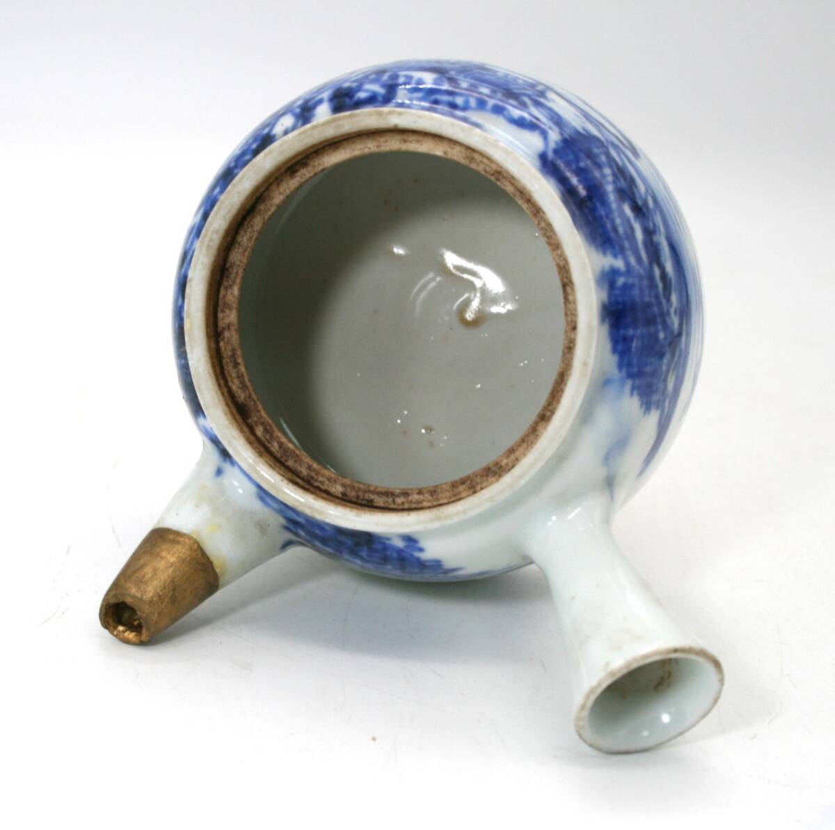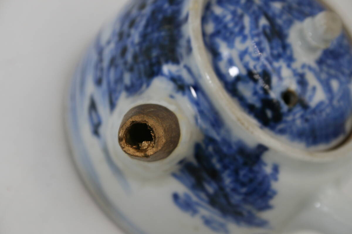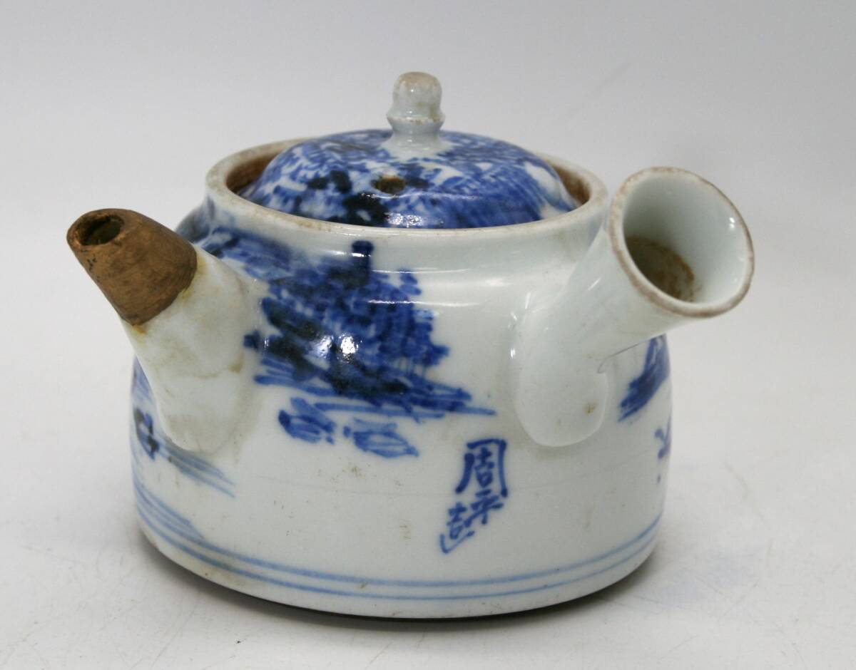『周平造』染付 楼閣山水風景図 急須 在銘 直径8㎝ 高さ7.2㎝ 合わせ箱付 横手急須 注ぎ口金継ぎ直しあり | |||