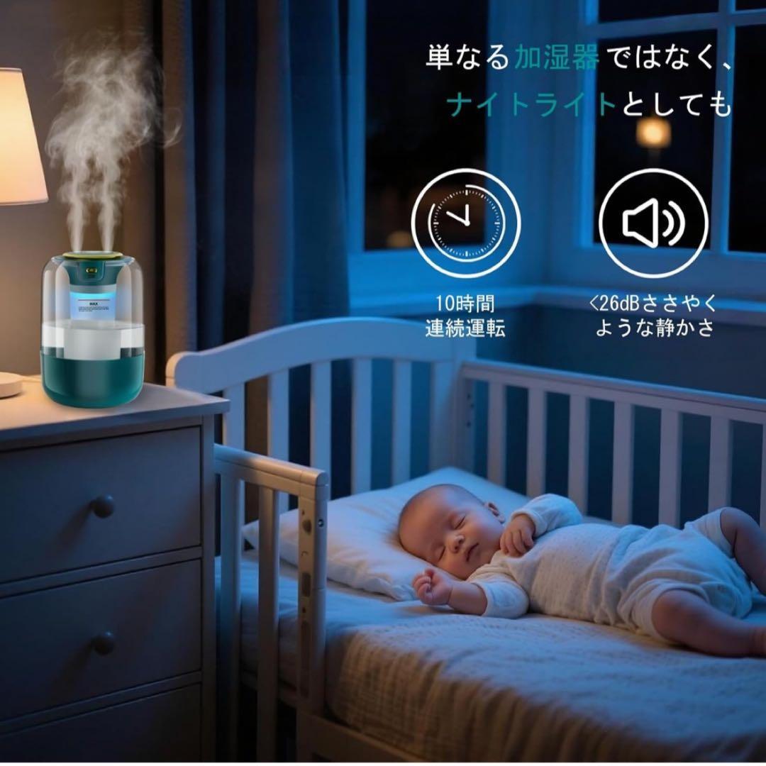 「超音波式静音設計・省エネ」超微細冷霧加湿、小さいお子さんやペットがいるご家庭でも安心して使えます。28dBの低騒音設計で、雪の降る音のように静か。会社や就寝中でも安心してお使いいただけます。タンクの水がなくなると自動停止する。消し忘れたり寝ている間に水がなくなっても心配ありません。消費電力は低く、毎日気軽にお使いいただけます。