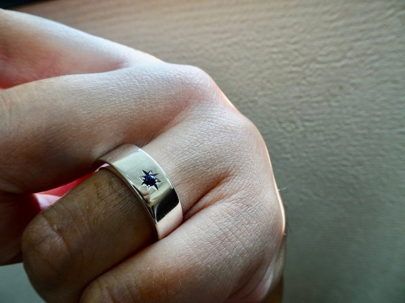 ■ ■ 商品名: 『一つ星2.5mmサファイヤ、幅7mm、平打リング』 ■ ■ |