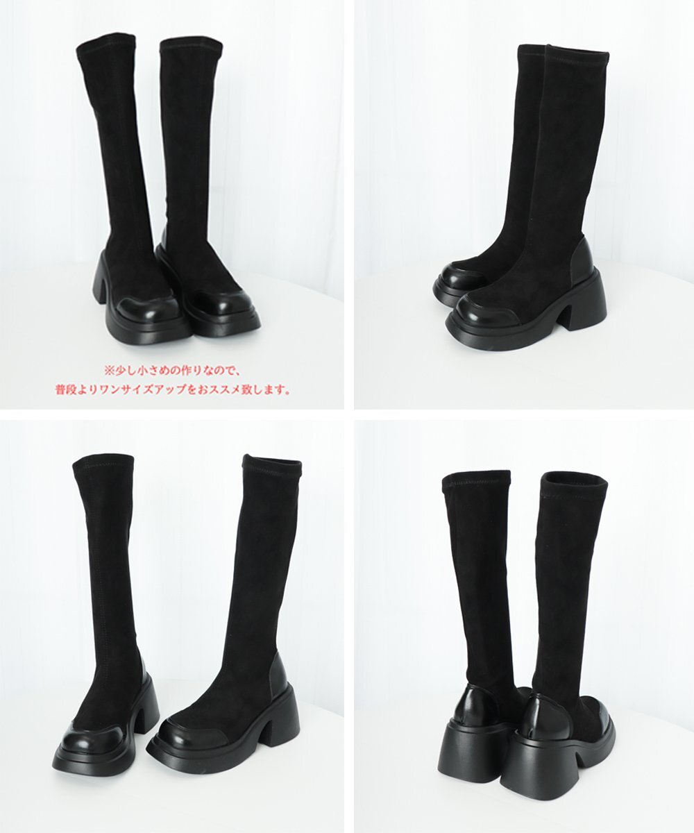 異素材をミックスして個性溢れるデザインの厚底ロングブーツ。