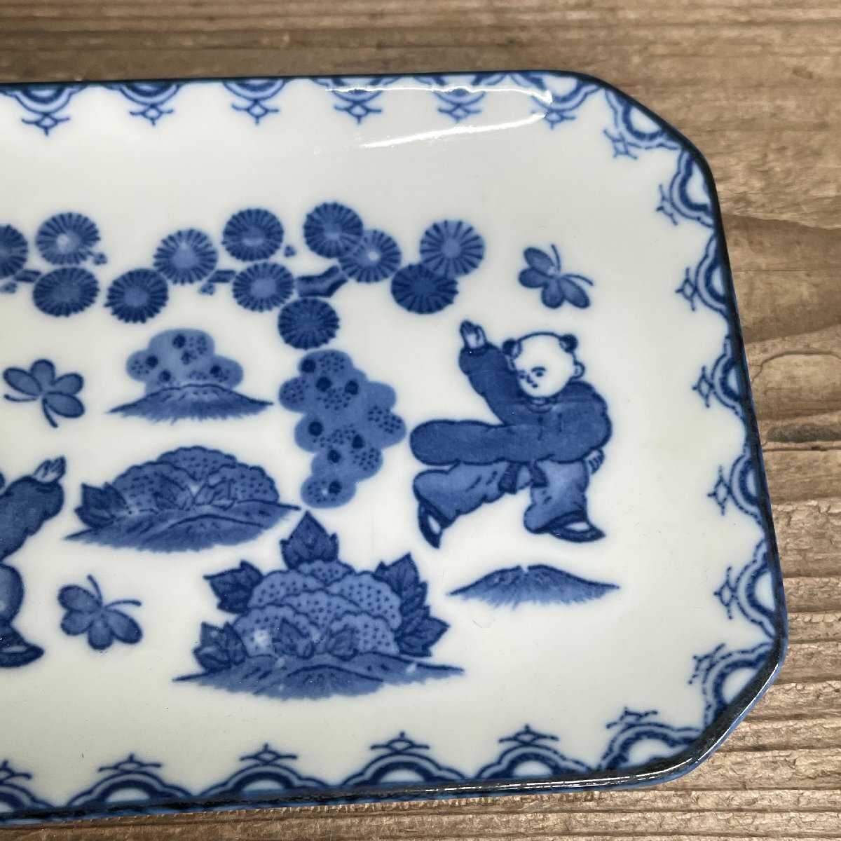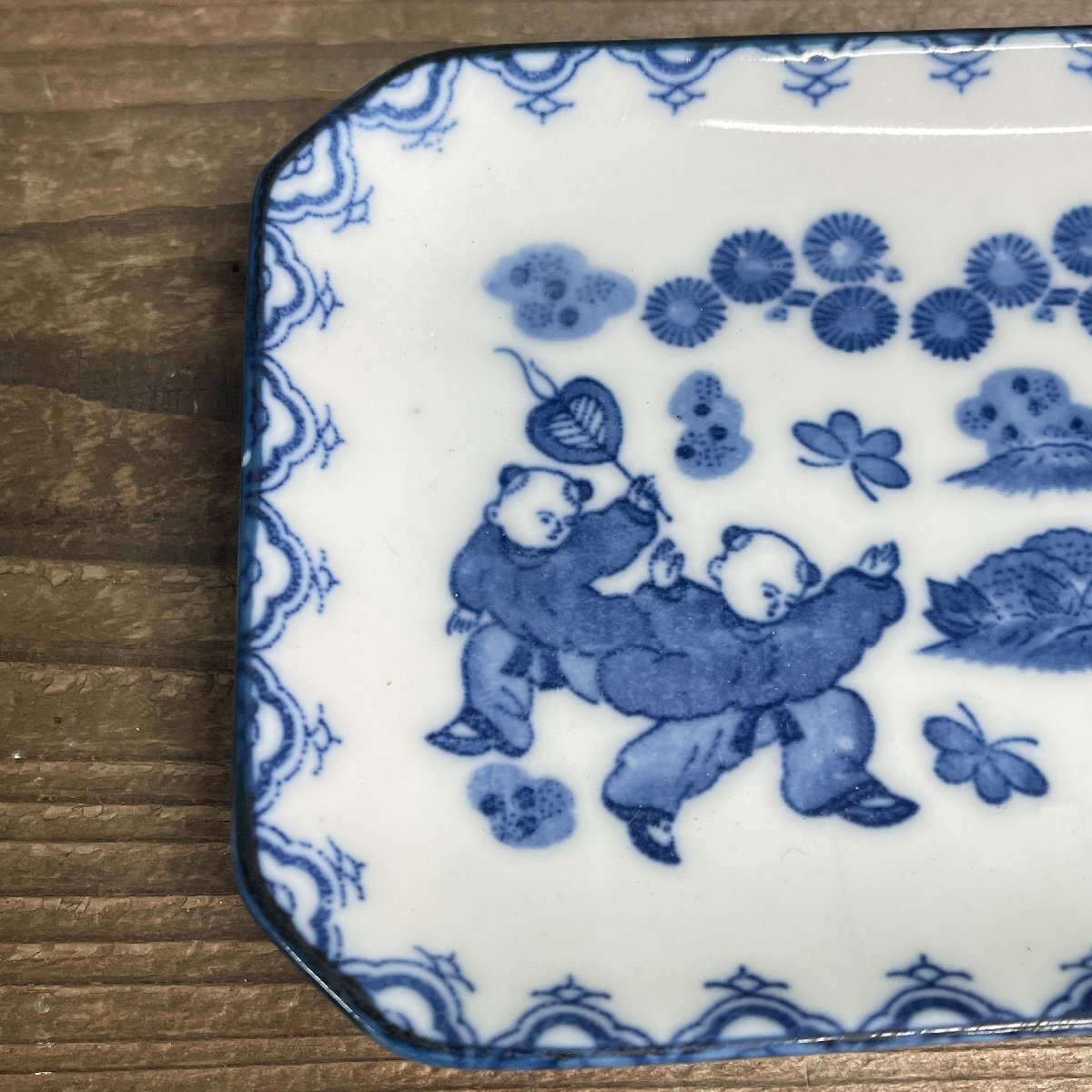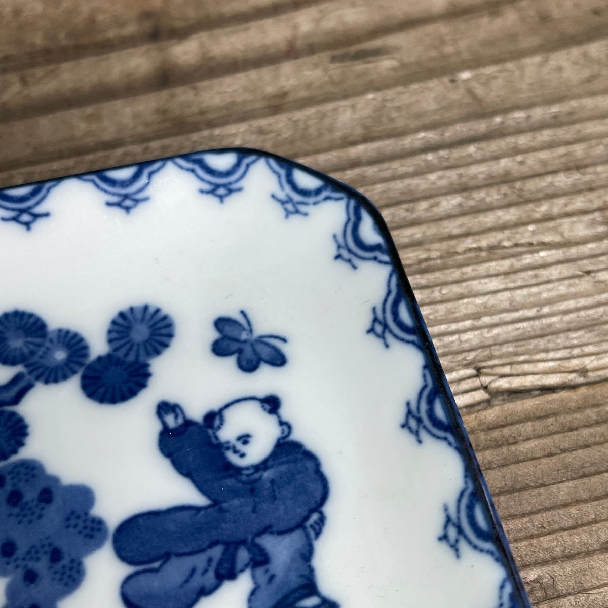 中古 有田焼 人物画 子供の絵 中国画 白磁 陶器 茶器 茶じゃわん 四角皿 2客 昭和レトロ