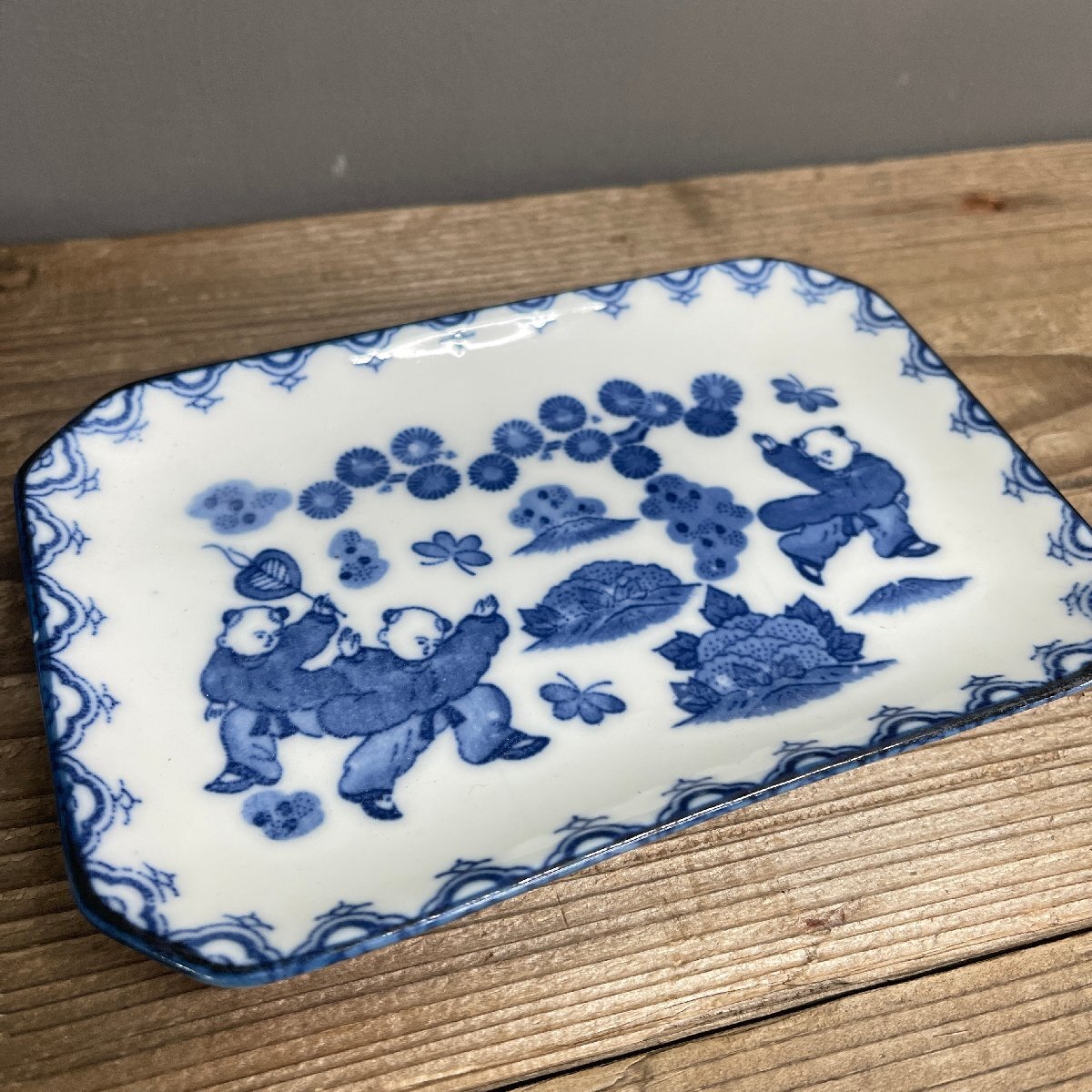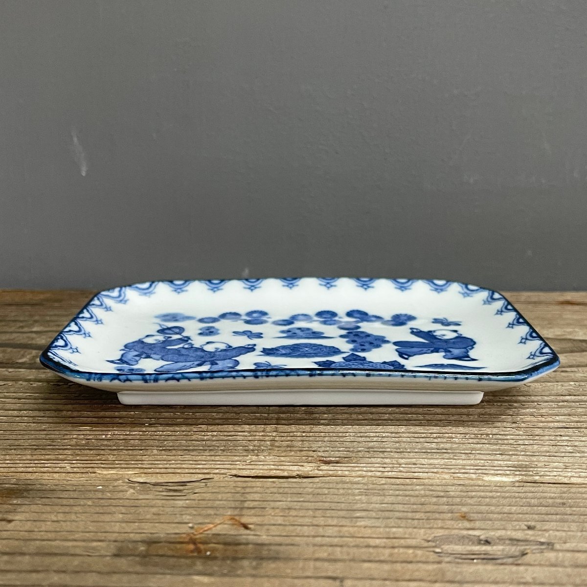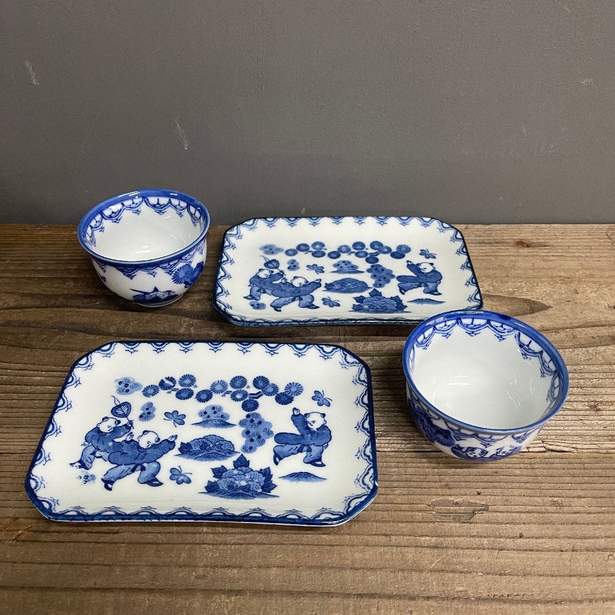 中古 有田焼 人物画 子供の絵 中国画 白磁 陶器 茶器 茶じゃわん 四角皿 2客 昭和レトロ