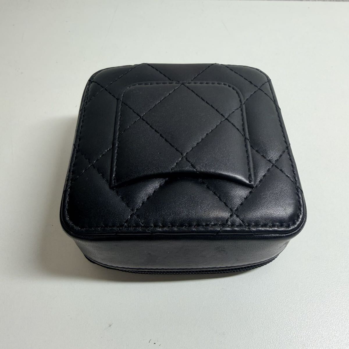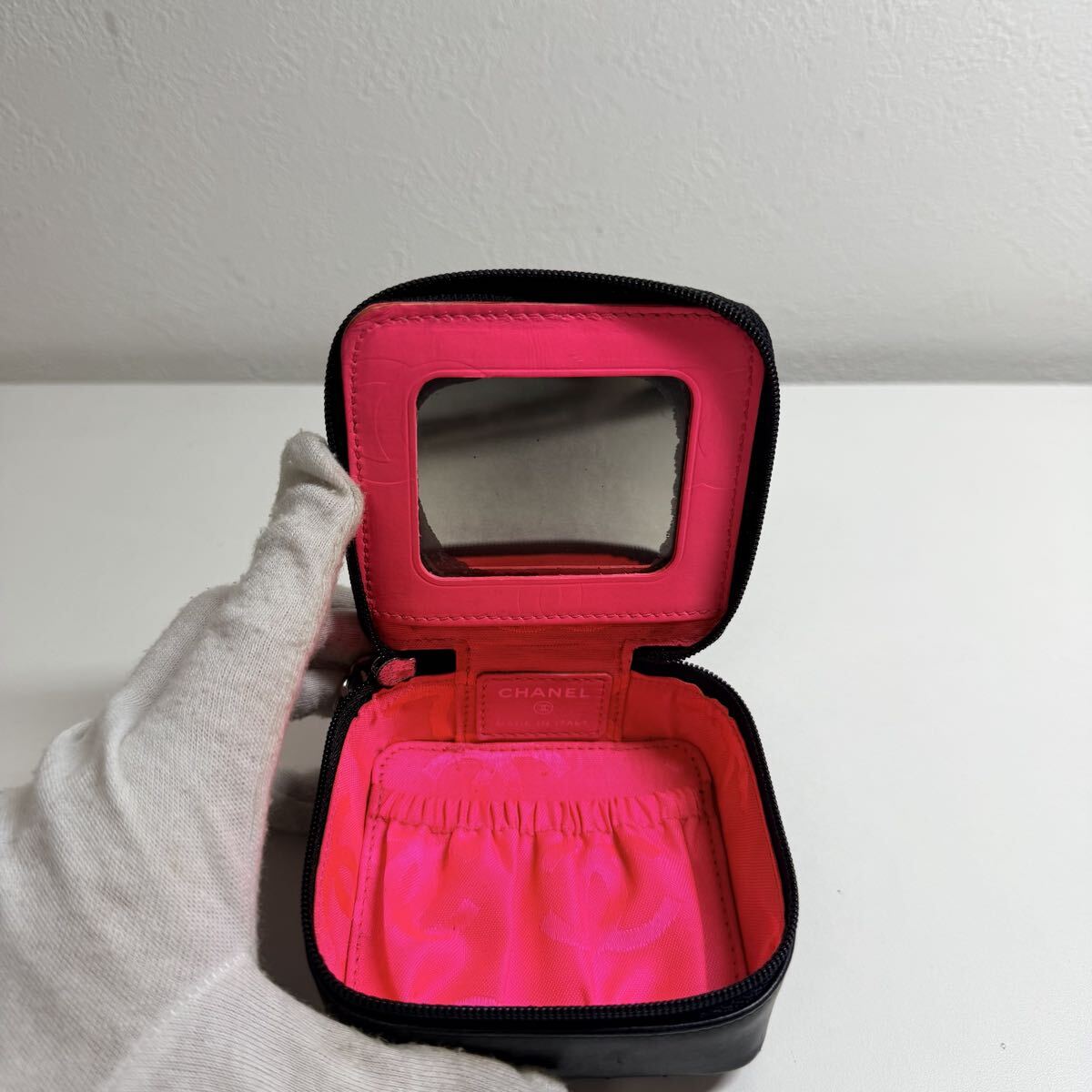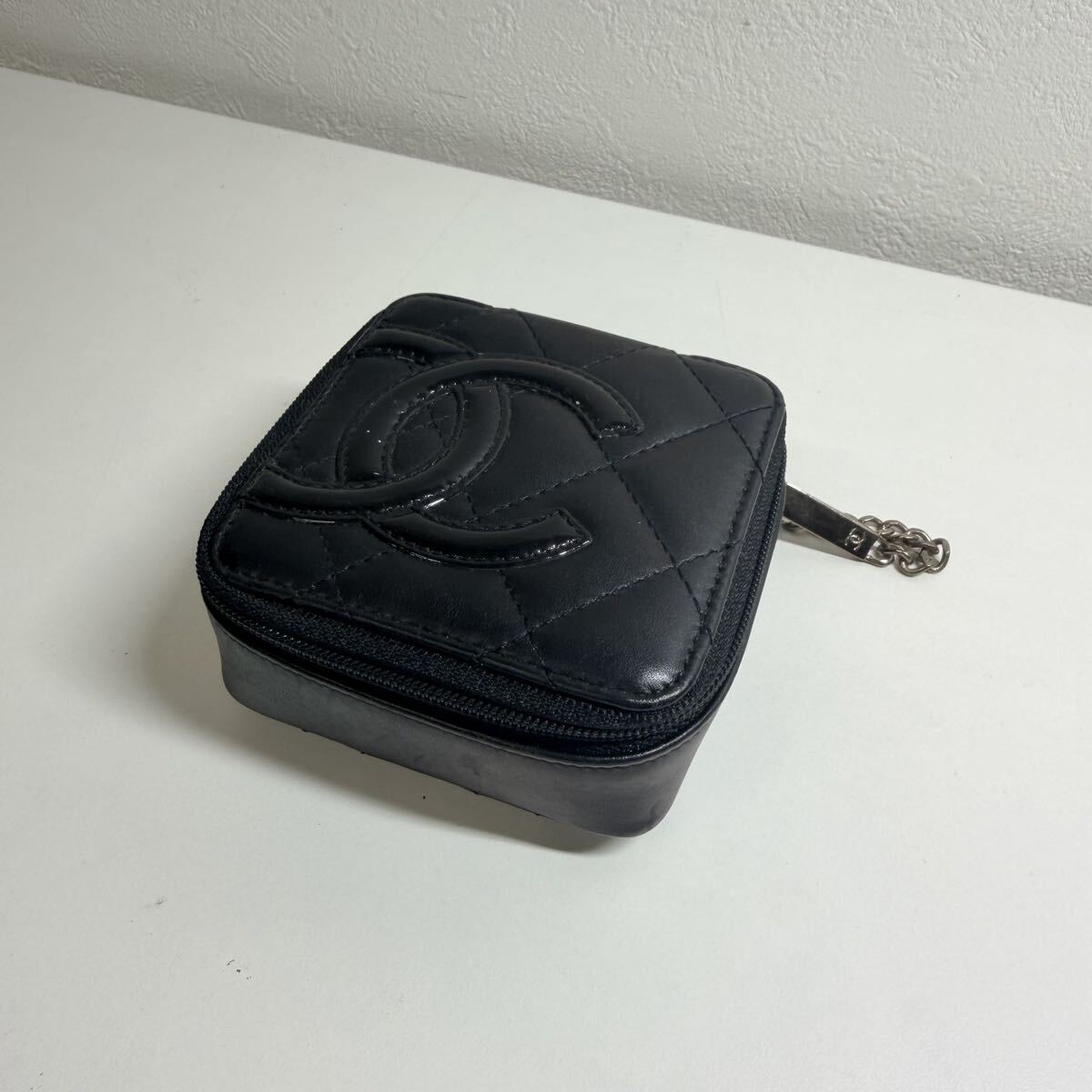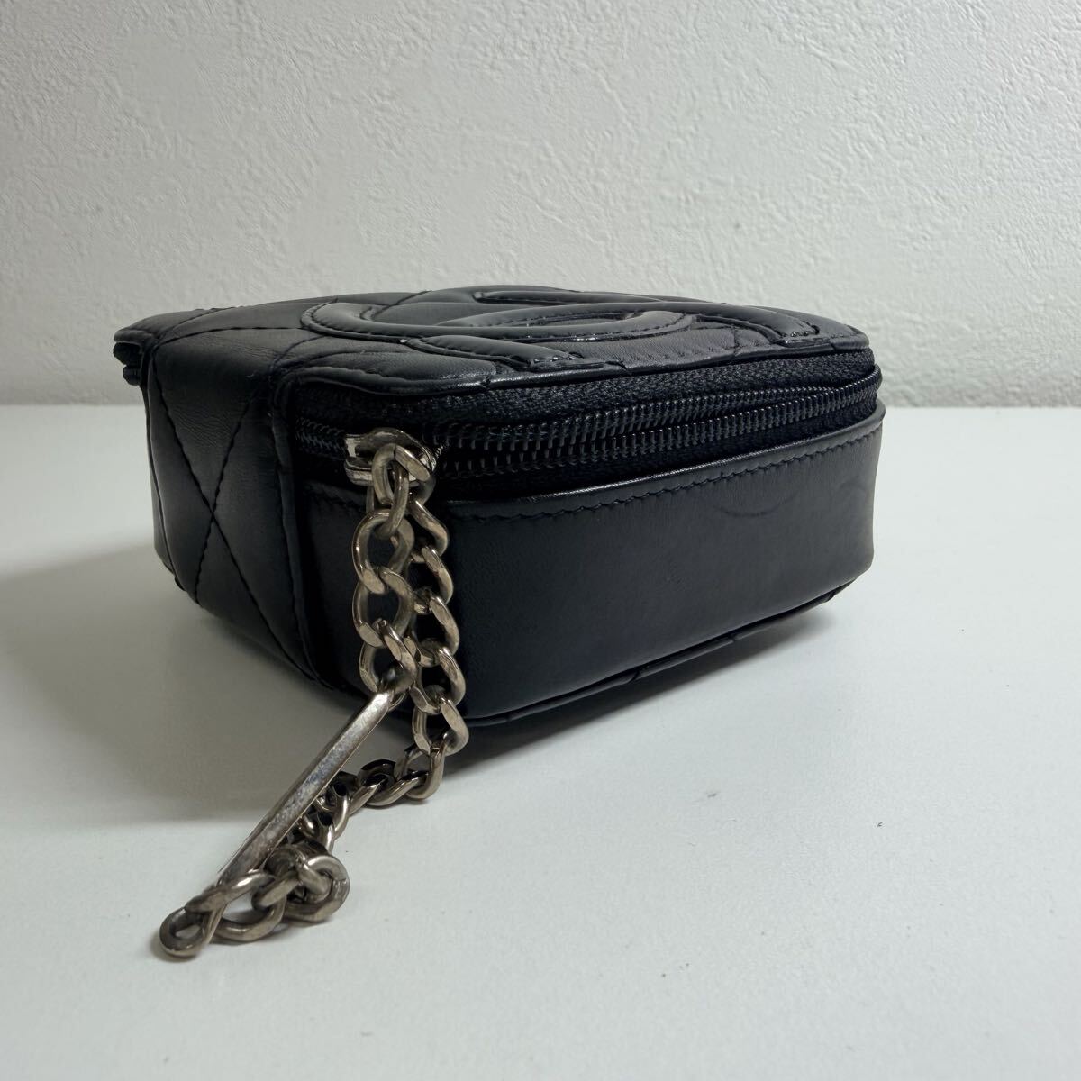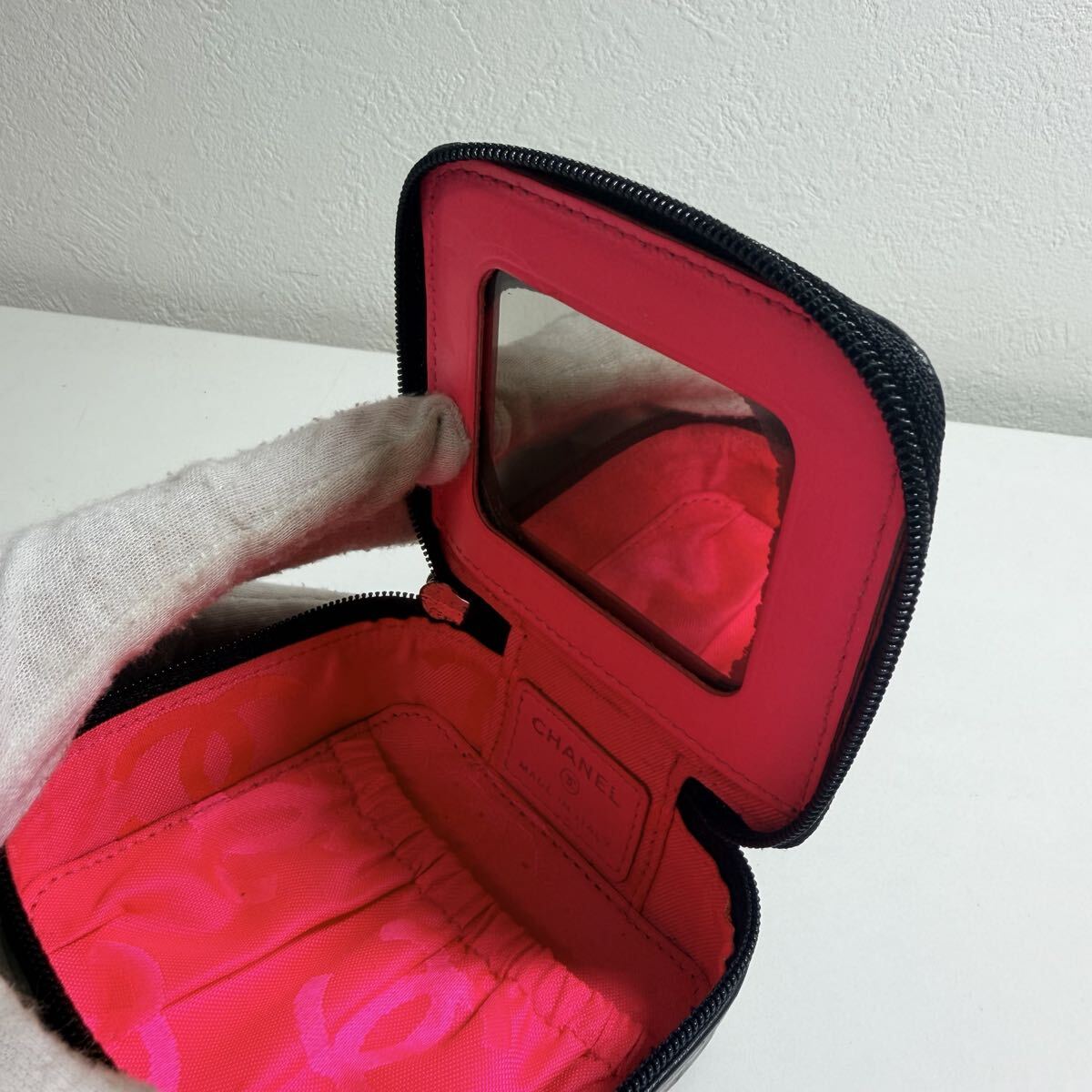 CHANEL(シャネル)の人気ライン「カンボンライン」より、ミラー付きコスメポーチ A29806 のブラックモデルです。