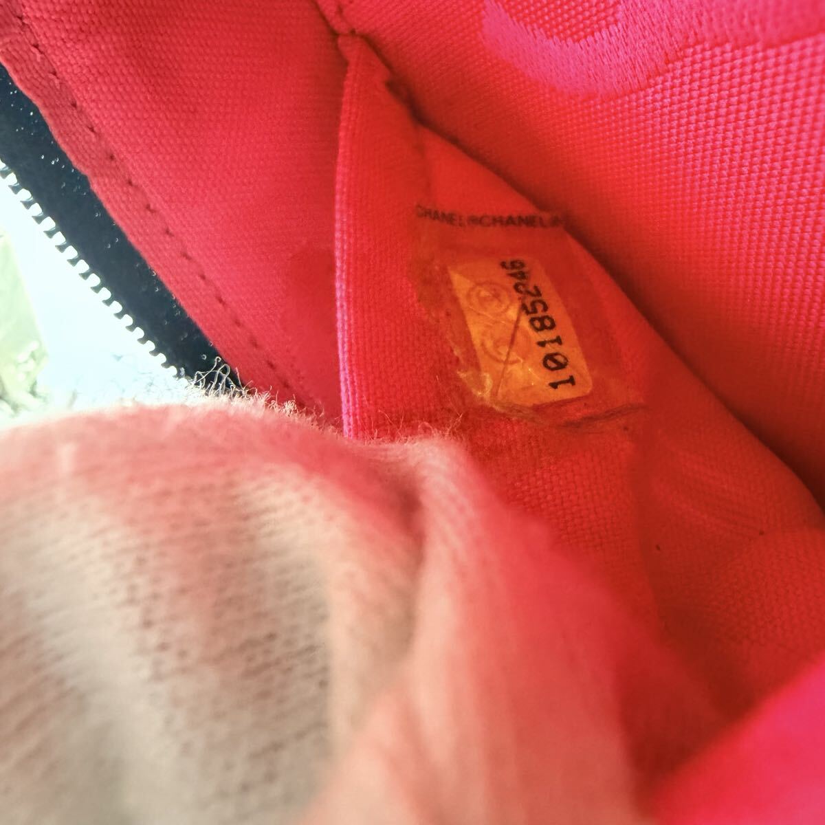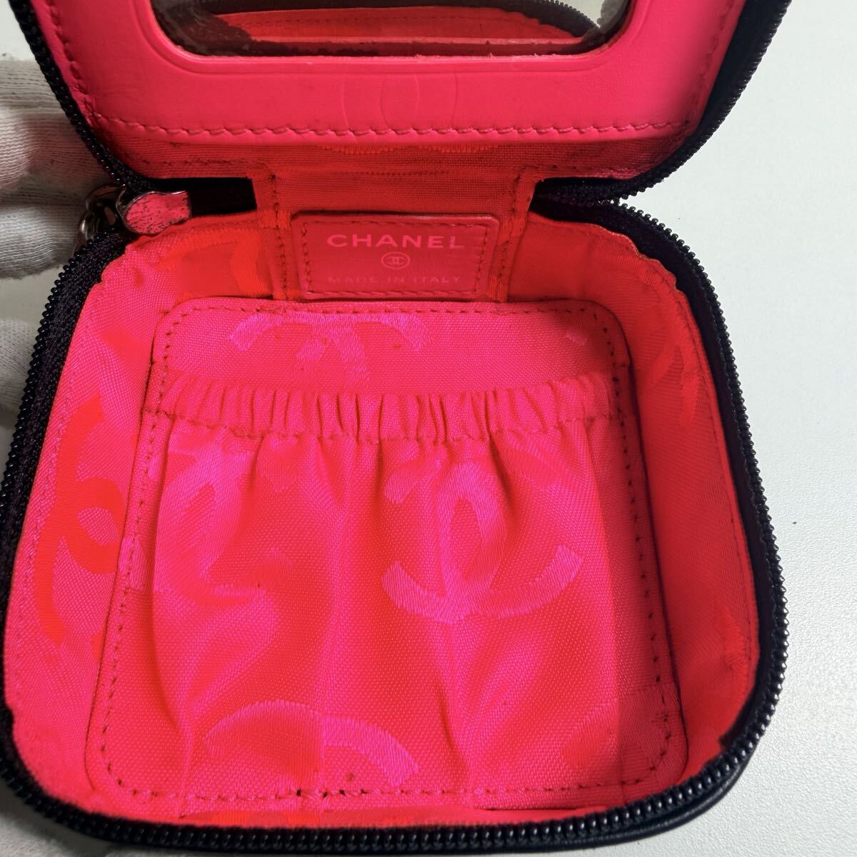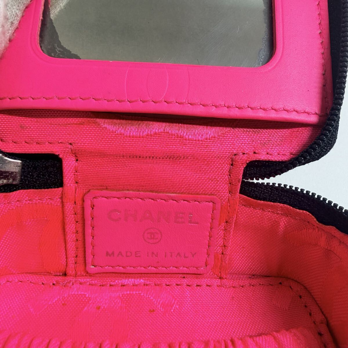 内側はネオンピンクのCHANELロゴ入りライニングで、とても華やか。