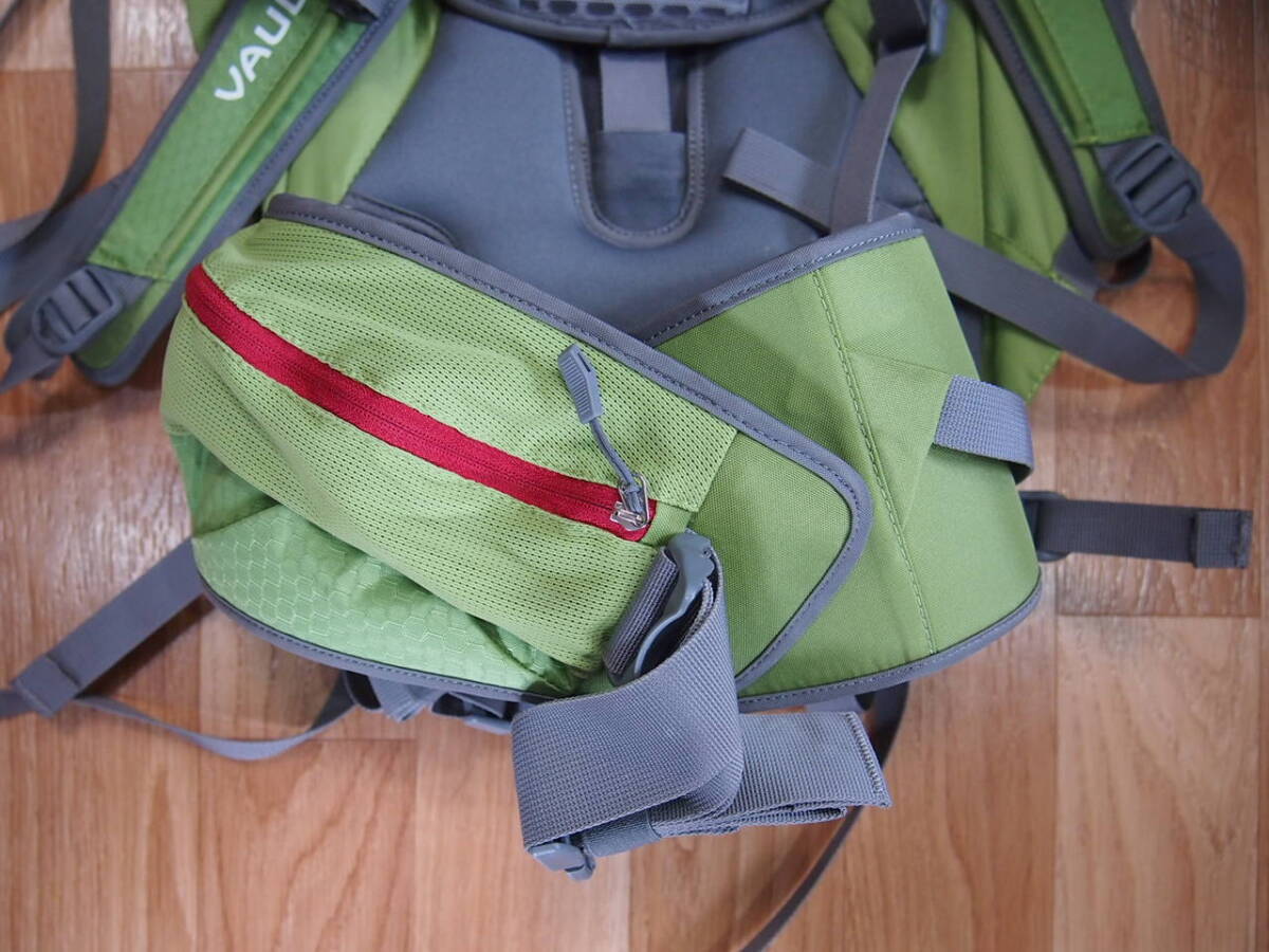 ウェストベルト左側には小物入れ(ジッパー、伸縮生地)