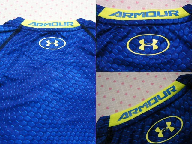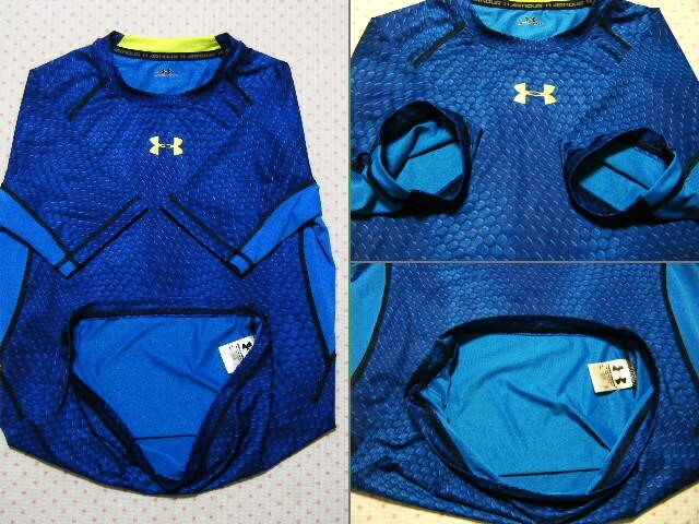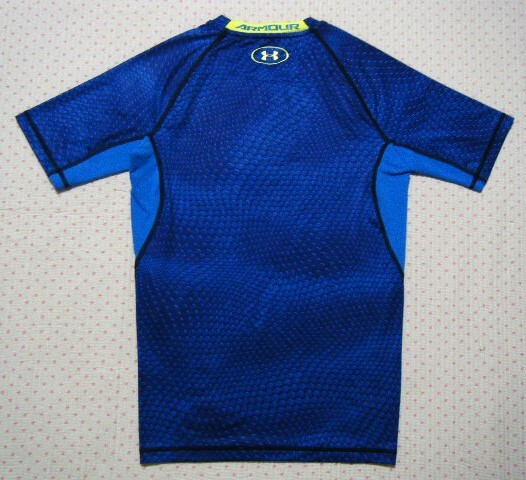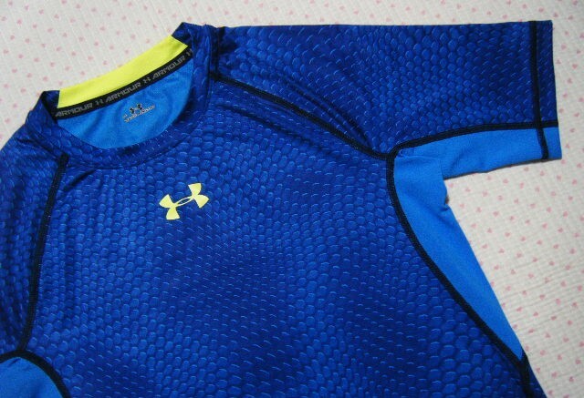 本体は軽量ポリエステル、ポリウレタン素材。     ツルっとした通気性と涼感性のあるストレッチ生地で、サイドはより通気性のあるメッシュ生地を配置し、吸汗速乾、防臭、UVカット、通気機能を持ち合わせ、アスリートのパフォーマンスを最大限引き出すトレーニング用高機能コンプレションTシャツ。       コンプレションフィットモデル。      @ サイドに切り替えがあり、鱗のようなグラフィックデザインが特徴的なアイテム。      HEATGEAR/ヒートギア。        モデル名  アンダーアーマー  ヒートギア  コンプレッション  ショートスリーブ  クルーネック         カラー   ブルー系