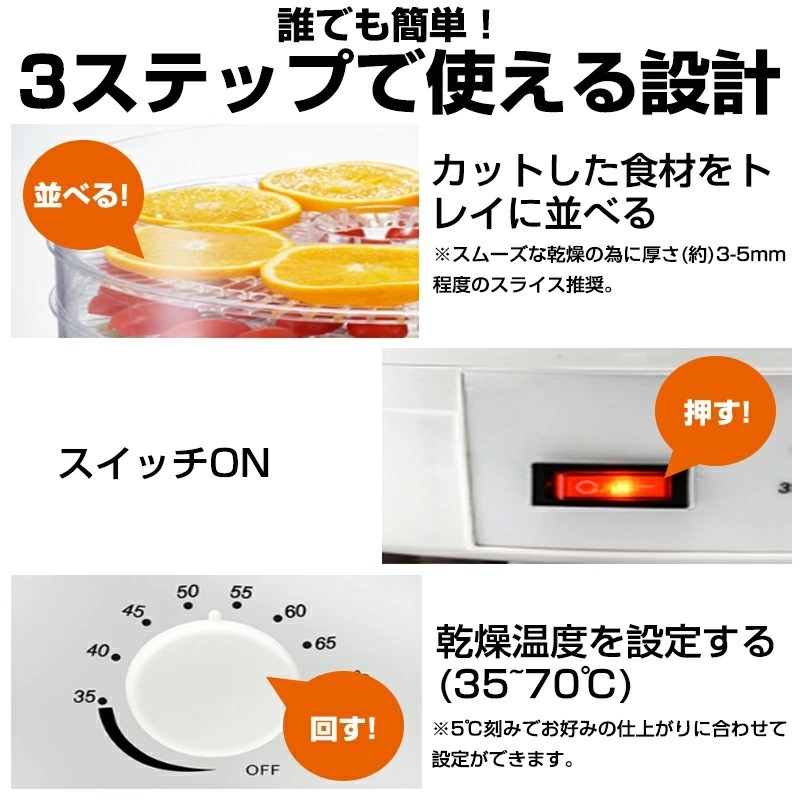 回転式トレイ&360度温風循環構造により、すべての食材に均一に熱が届き、ムラなくしっかり乾燥。短時間で効率的に仕上げたい方にもぴったり!