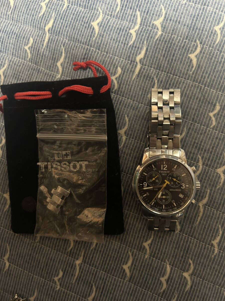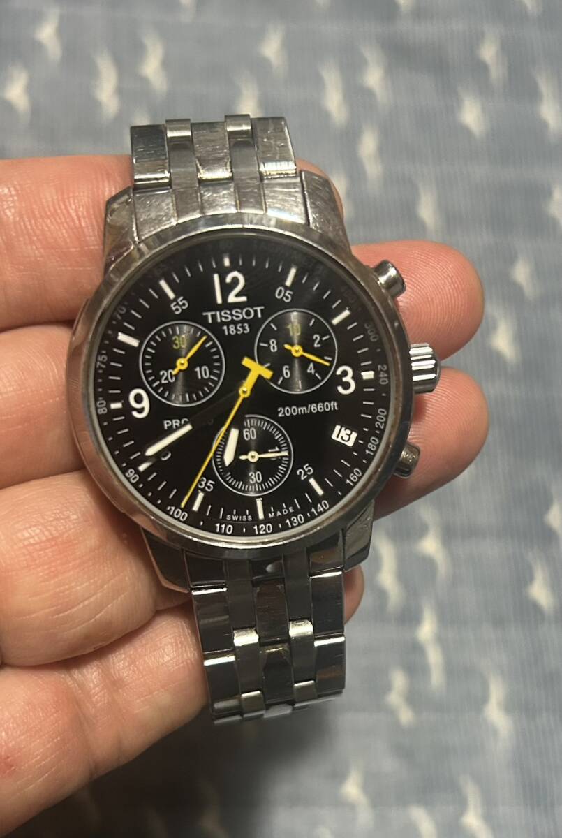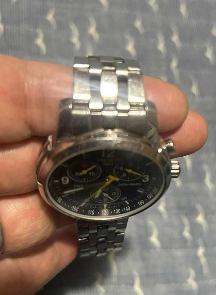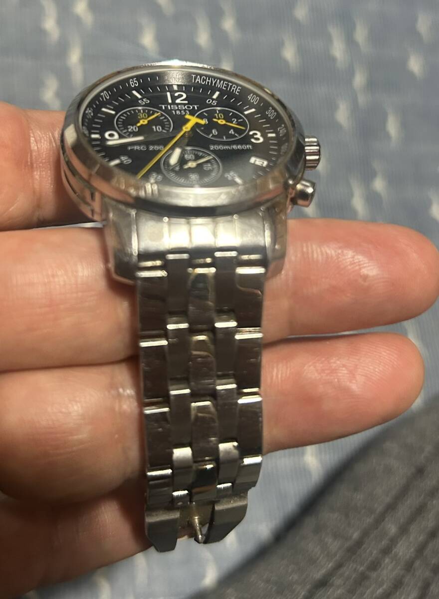ケース、ベルトに写真ではわからないキズがあります。クロノメーターの上スイッチが固着して動きません。ケースサイズ39mm。あまりコマ一つあります。自分の腕まわりが17cmですが、指1本入る余裕があります。