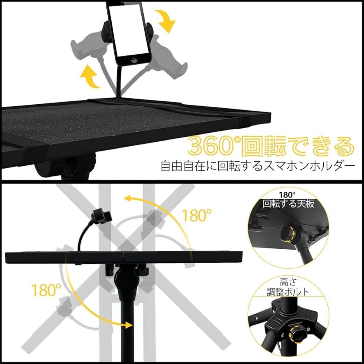 【180度回転&耐久性】天板は180度に回転可能、喋る方に合わせて角度を変更するのに便利。弾性バンド付き、ブックや楽譜など簡単に固定できます。ものを落下することをしっかりと防止。保護スポンジが付いているため、プロジェクターやパソコンへのダメージを低減されます。体はアルミ合金を採用しております。アルミ素材特有の軽量性を持ちながら、強度も大幅に高められます。表面に黒染め処理を施されたため、防錆性が良く、耐摩耗性・耐食性は一層に向上。