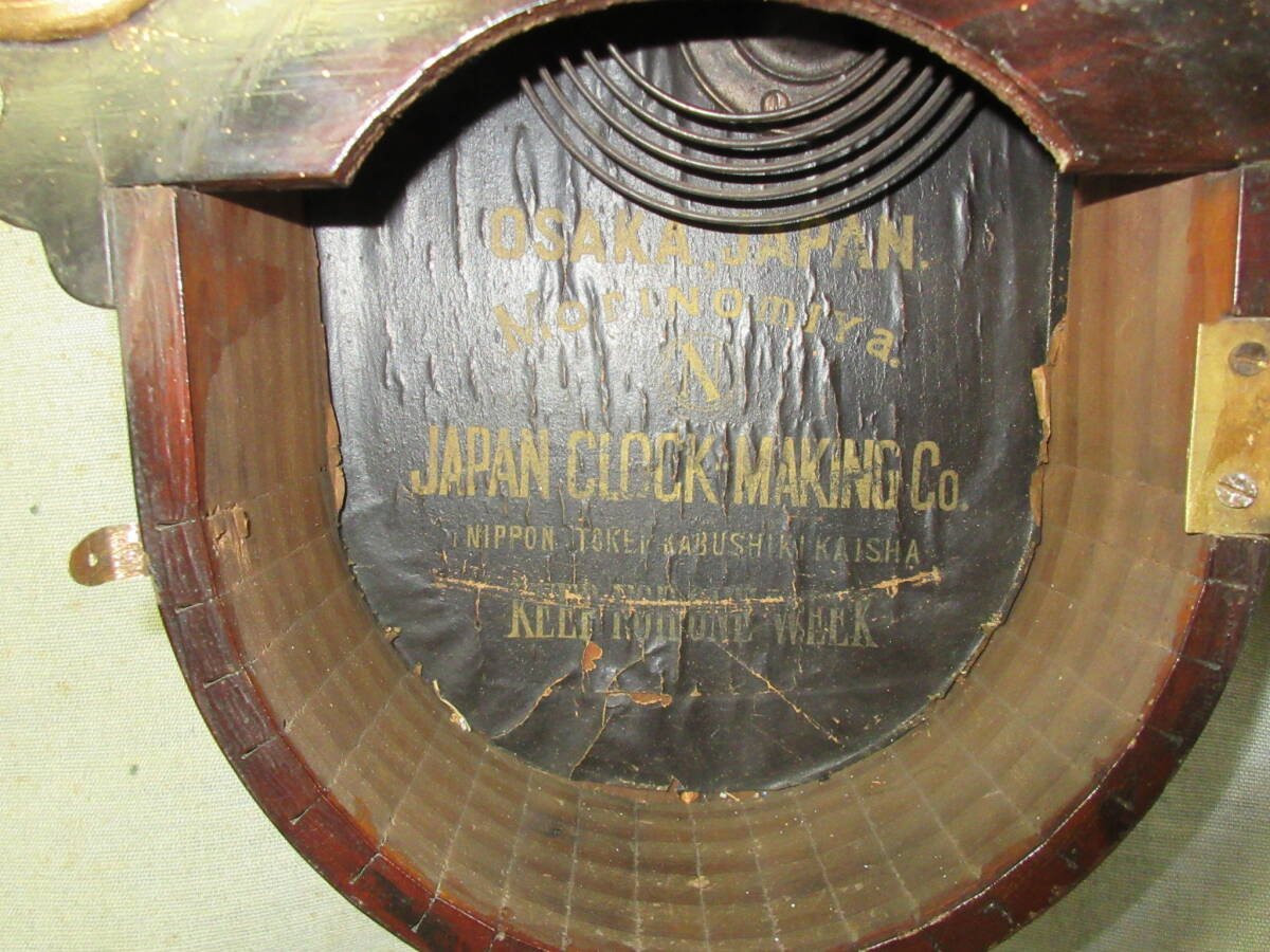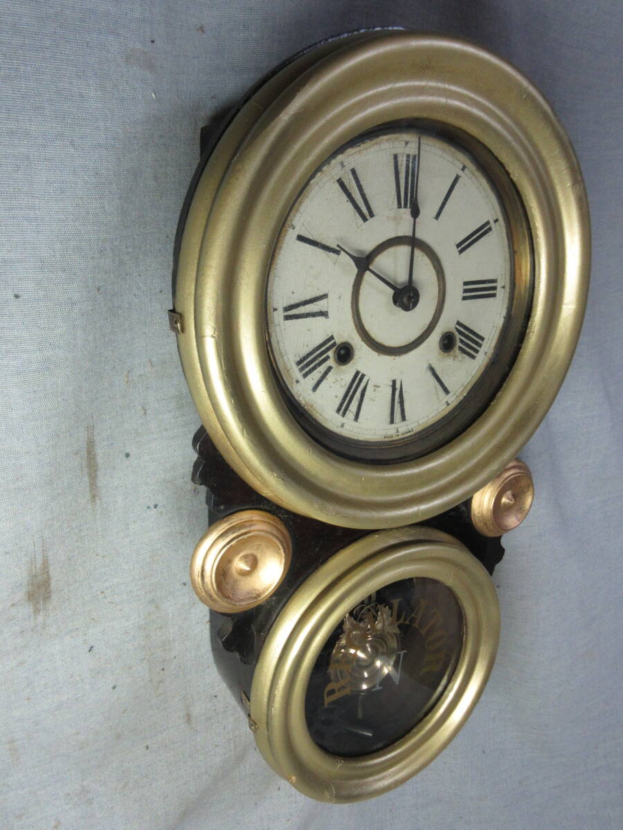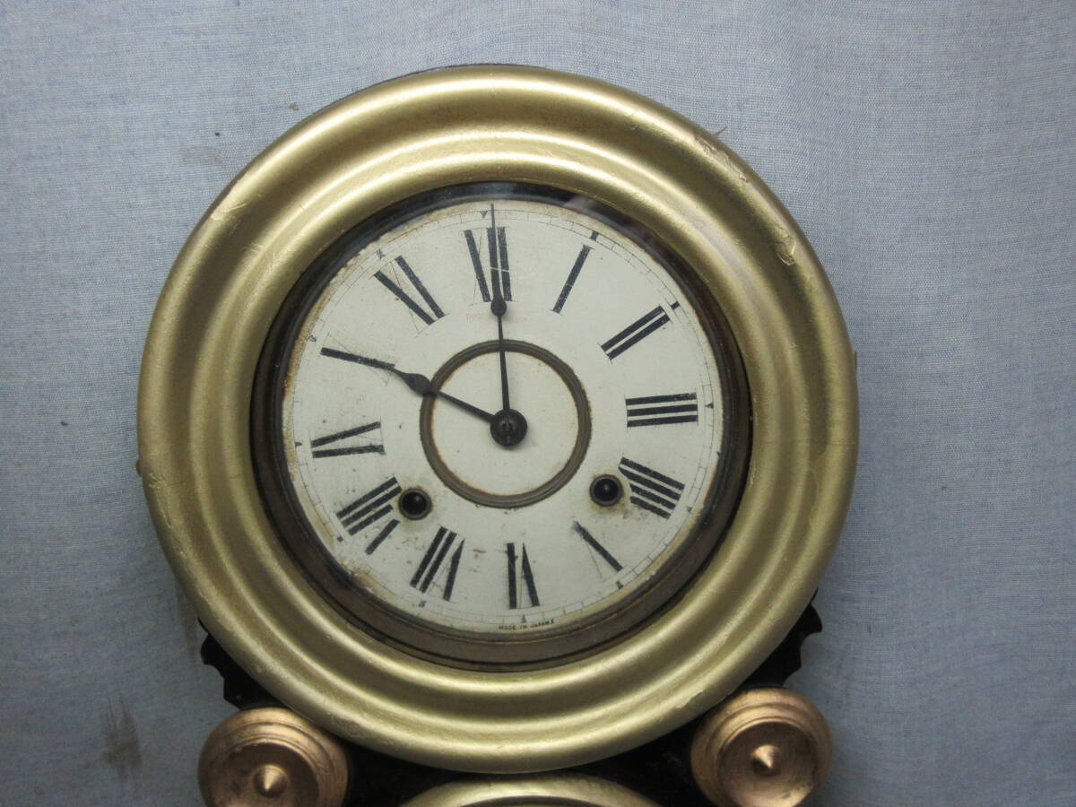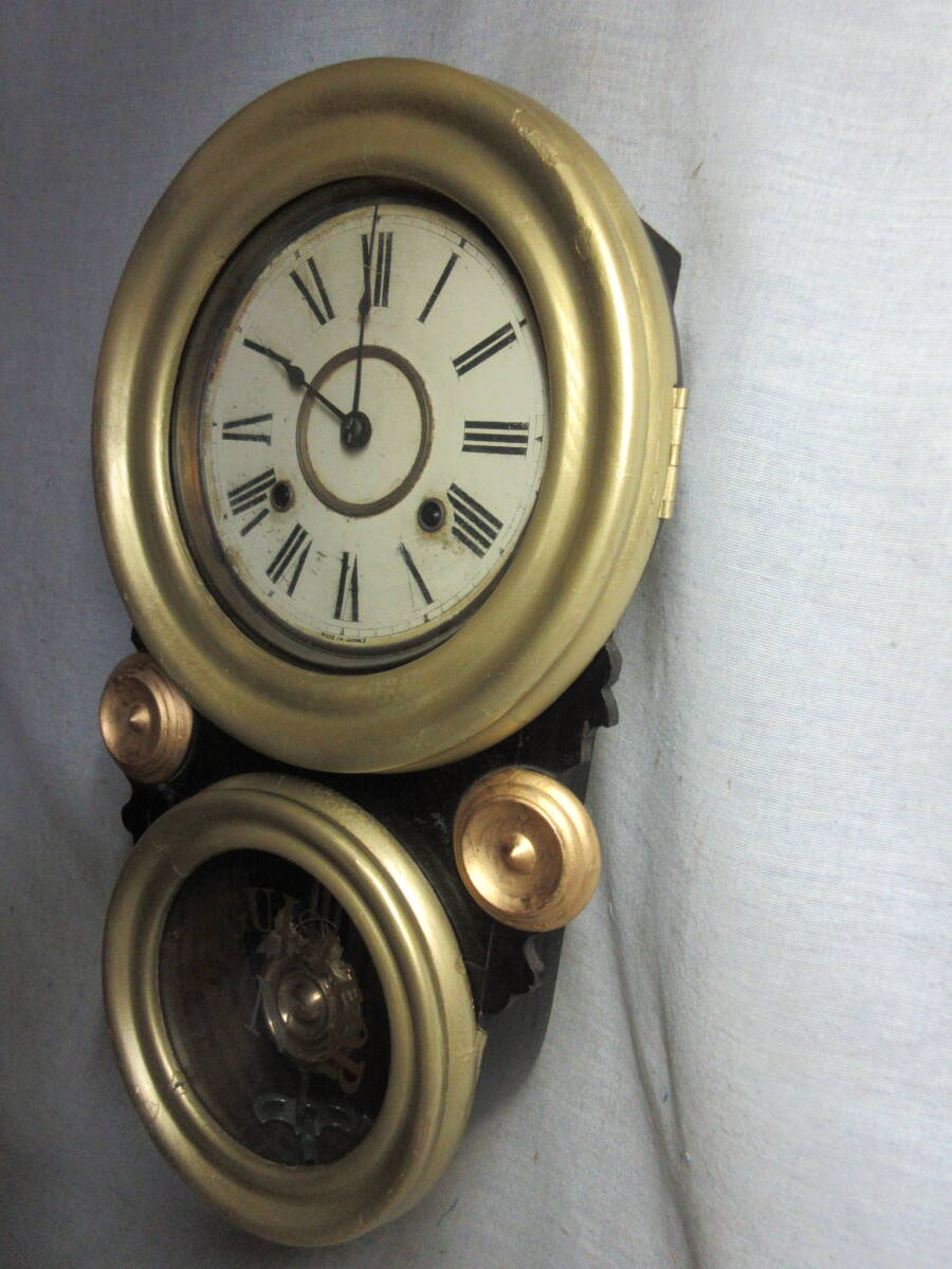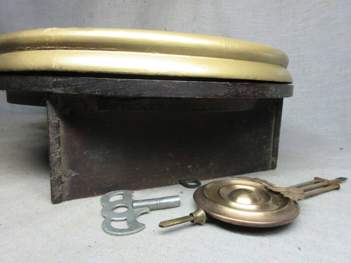 全長 49.5㎝、幅 28.0㎝、奥行 10.5㎝、明治時代、ペイント文字盤(オリジナル)、8日巻、カギ付き、前面の金は上塗りしてあります、上ガラスは変っていますが下ガラスはオリジナルです、機械は動いていたので注油のみです。