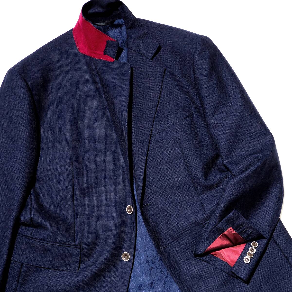鈍い艶を放つ英国製ダークネイビー色の上質な通年向けウールを贅沢に使用