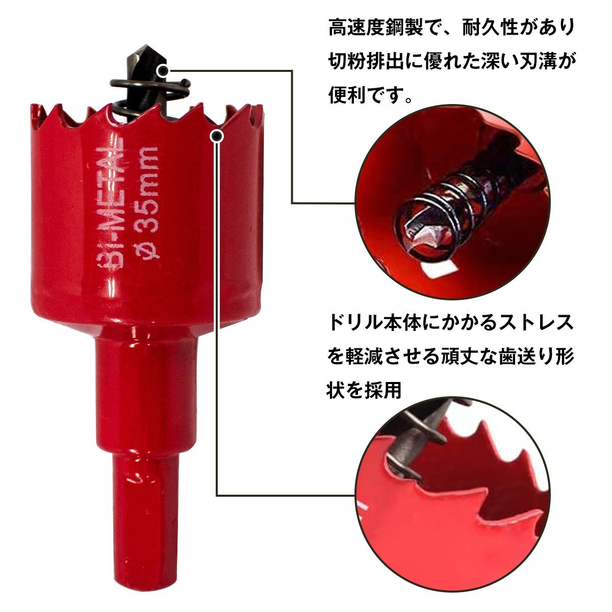 のこぎりの様なギザギザになっている丸い刃が、センタードリルと共に回転することで壁や配管・波板・鉄板などに、どなたでも簡単に正円を空けることが出来ます。