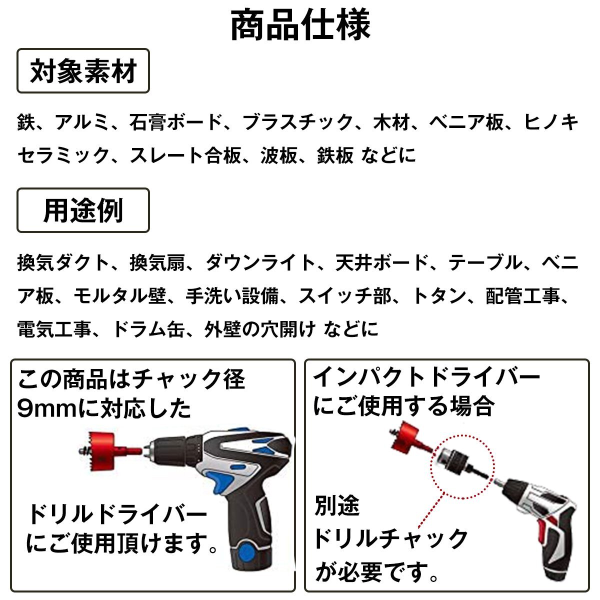 ある程度以上の大きな穴を空けることに特化した工具で、電動工具を使い始めたDIY初心者の方でも簡単にお使いいただくことができます。