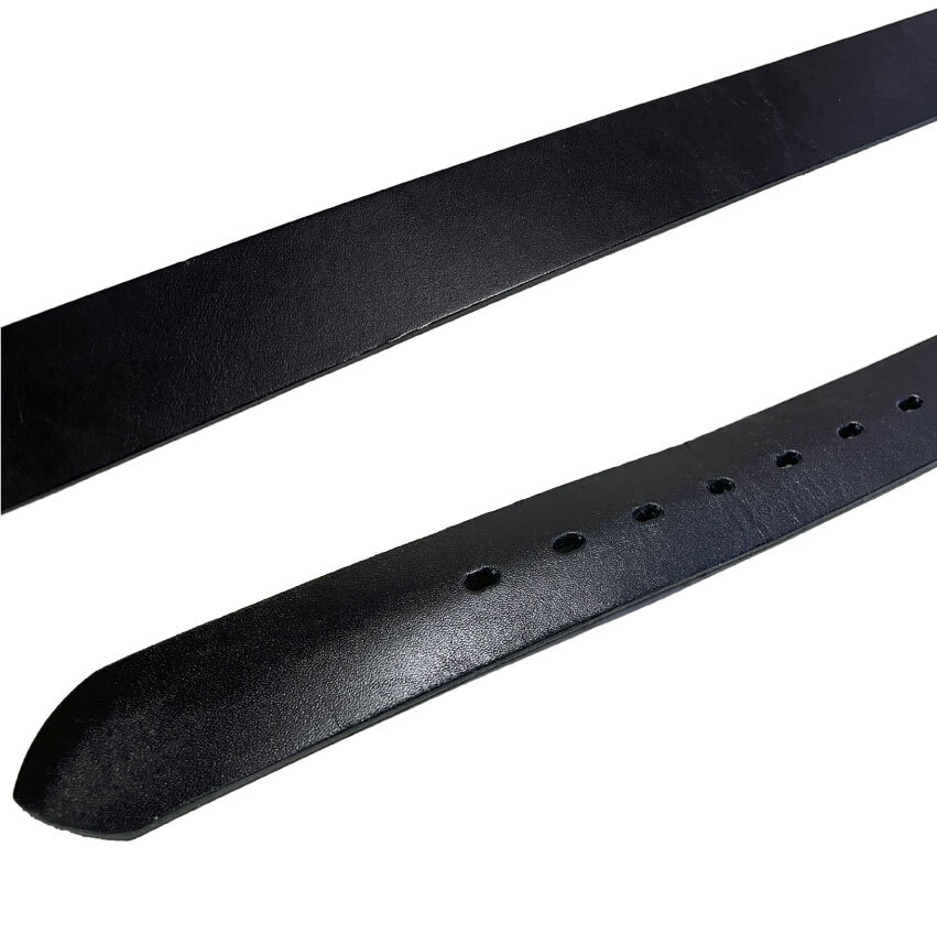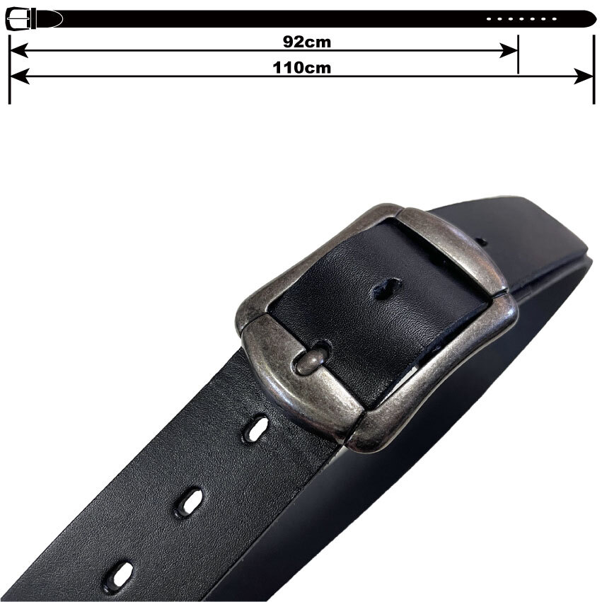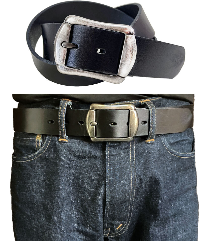 数量限定ですのでお見逃し無く。極厚(最厚部=4.1mm)な姫路レザーの1枚革を使用した、38mm幅の国産ベルトです。Aランクの皮革を使用致しておりますが、フルグレインレザー(銀面付き革)ですので、画像では判別出来無い程度の凹凸や畝/色むらなど御座いまが、御使用に伴い目立たなくなってまいります。剣先部分を少し長めにしておりますので、アウトしたトップスから、少しバックルを覗かせるトレンドのウエアリングが可能です。姫路レザーは栃木レザー同様、セレクトショップにて多数採用されている高級皮革です。ベジタブルタンニングレザーは水分や摩擦に強いタフな革です。しなやかで粘りの有る質感は抜群です。バックルはアンティーク加工が施されておりますので高級感があります(微かな凹み等は、アンティーク加工によるものです)。カラーは深みの有るブラックです。