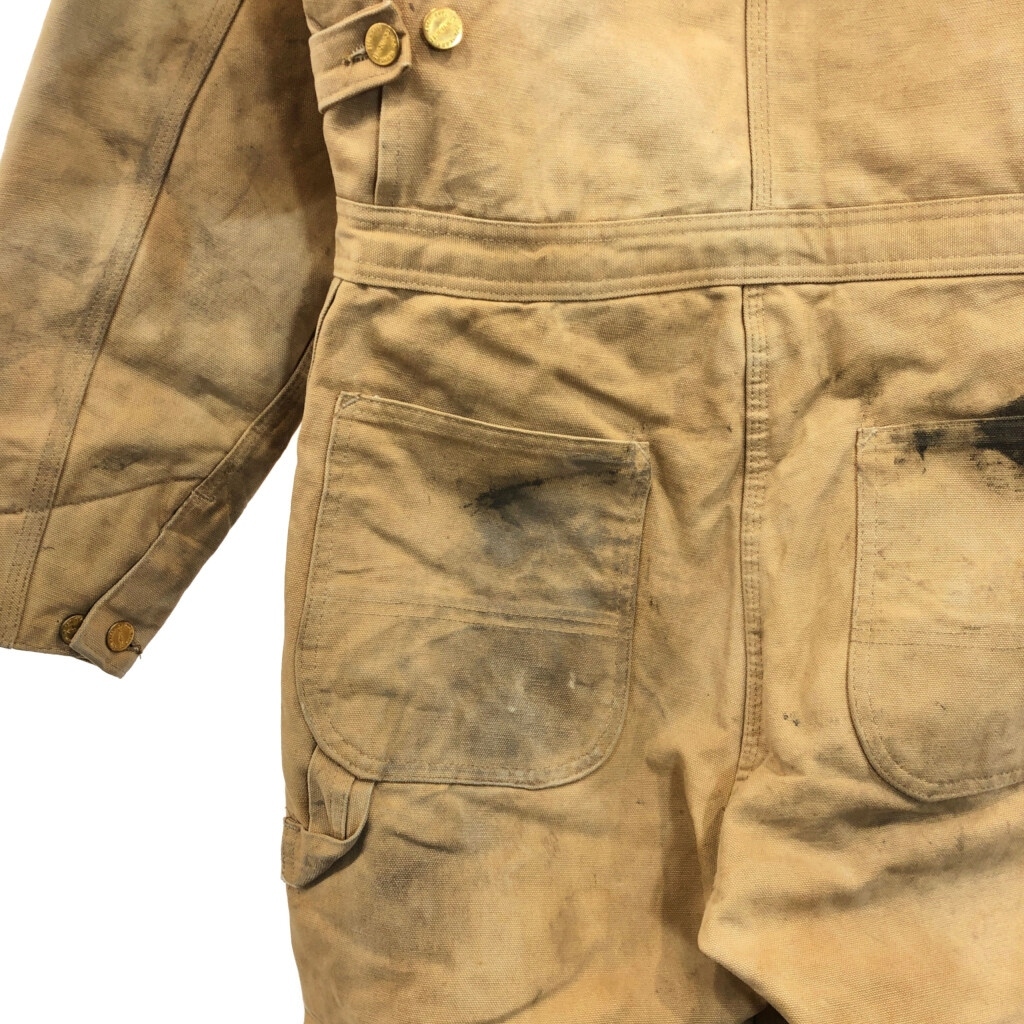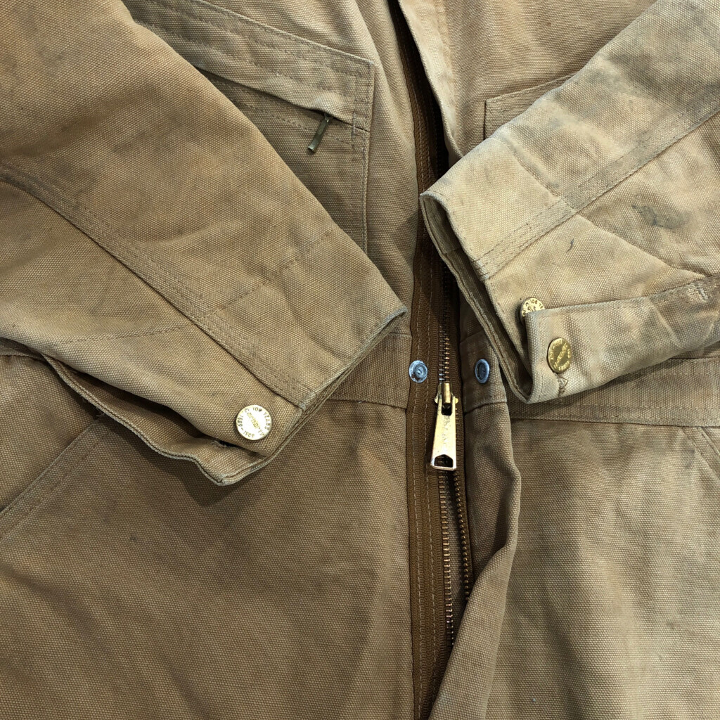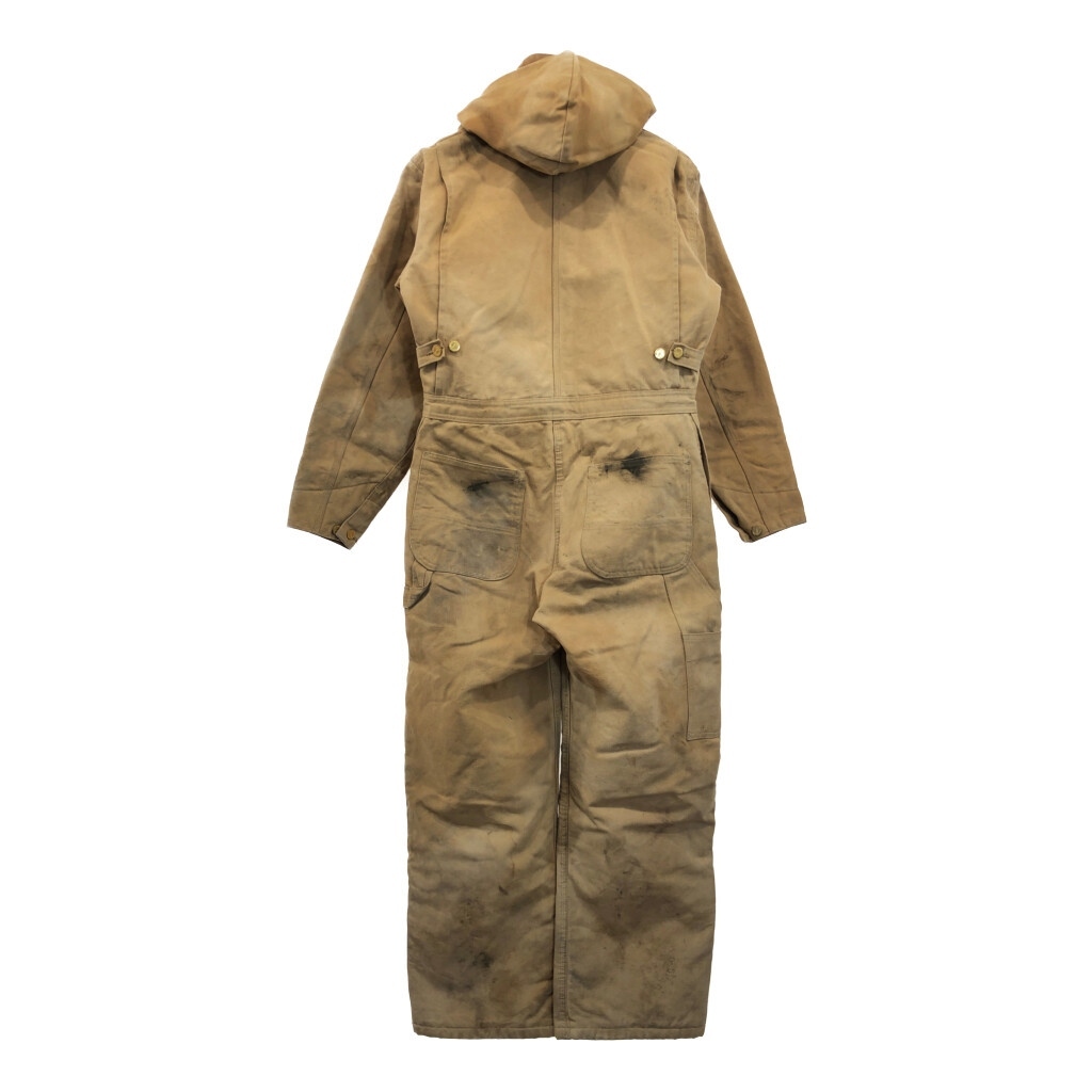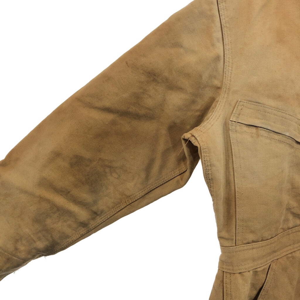 【商品管理番号】 V0731 【ブランド】 Carhartt/カーハート 【サイズ】 40相当 【実寸サイズ】 総丈:約152cm 肩幅:約48cm 着丈:約83cm 身幅:約56cm ウエスト:約92cm 股下:約69cm わたり幅:約35cm 裾幅:約25cm 袖丈:約60cm 【主な素材】 表地 : コットン 裏地 : 13848 中綿 : 13897 【色】 ライトブラウン 【仕様】 生産国 : USA製 80年代 ファー取り外し可能、裏地キルティング 100周年 【状態】 汚れ:全体、腹部裏地、背中裏地、裾裏地 特記事項:変色、色褪せ、ステッチ抜け、金具錆び |