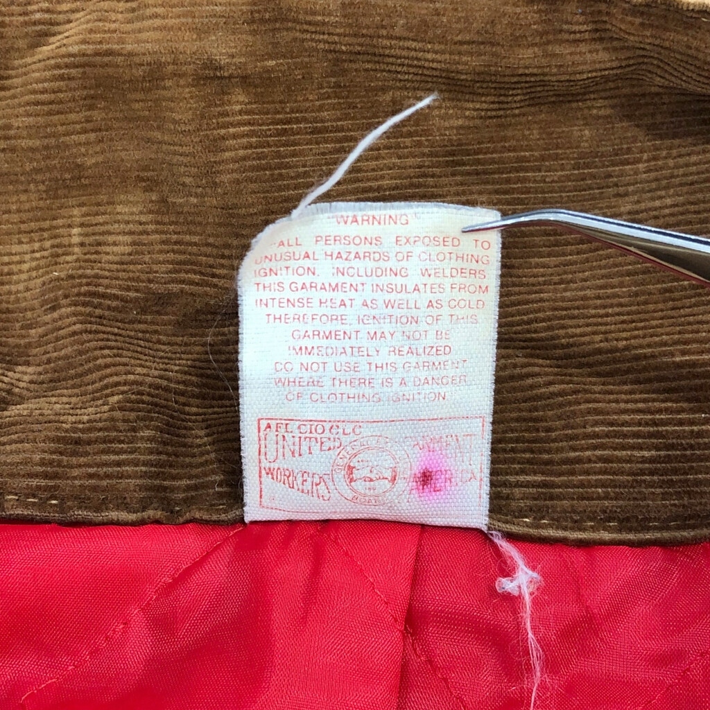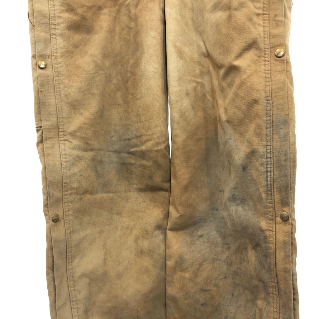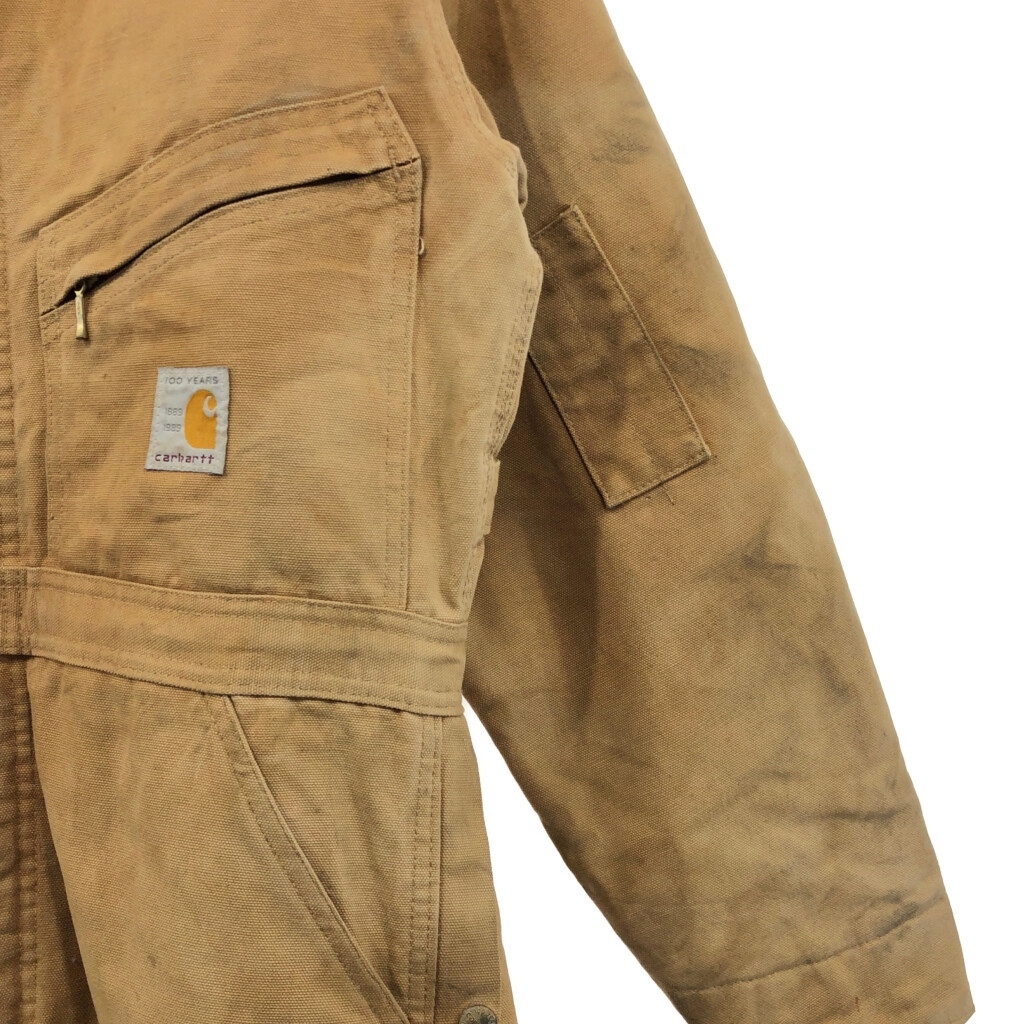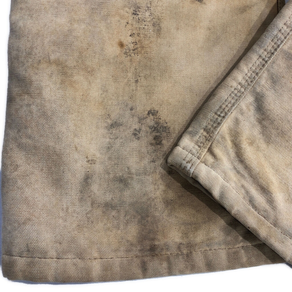 【商品管理番号】 V0731 【ブランド】 Carhartt/カーハート 【サイズ】 40相当 【実寸サイズ】 総丈:約152cm 肩幅:約48cm 着丈:約83cm 身幅:約56cm ウエスト:約92cm 股下:約69cm わたり幅:約35cm 裾幅:約25cm 袖丈:約60cm 【主な素材】 表地 : コットン 裏地 : 13848 中綿 : 13897 【色】 ライトブラウン 【仕様】 生産国 : USA製 80年代 ファー取り外し可能、裏地キルティング 100周年 【状態】 汚れ:全体、腹部裏地、背中裏地、裾裏地 特記事項:変色、色褪せ、ステッチ抜け、金具錆び |