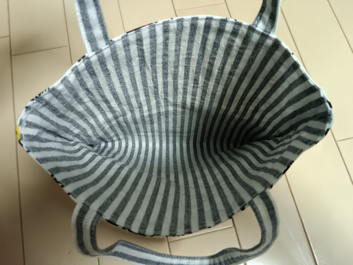 ハンドメイド  ブルー頒布生地&スヌーピー柄の小さいバッグです。中は白色&グレーのストライプ生地です。ポケットはありません。