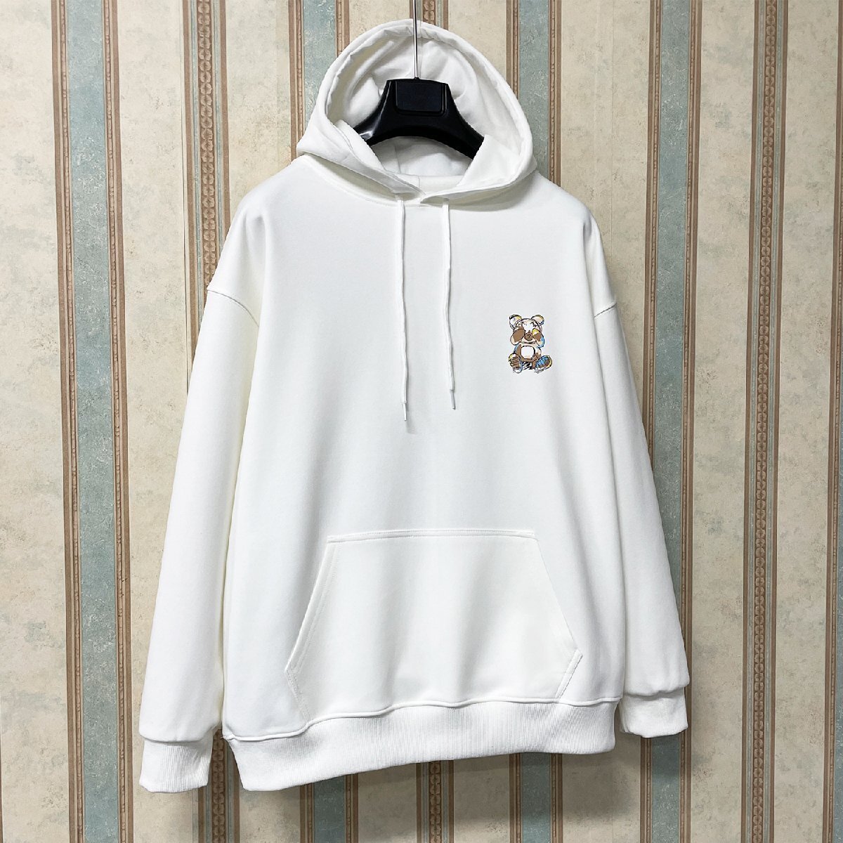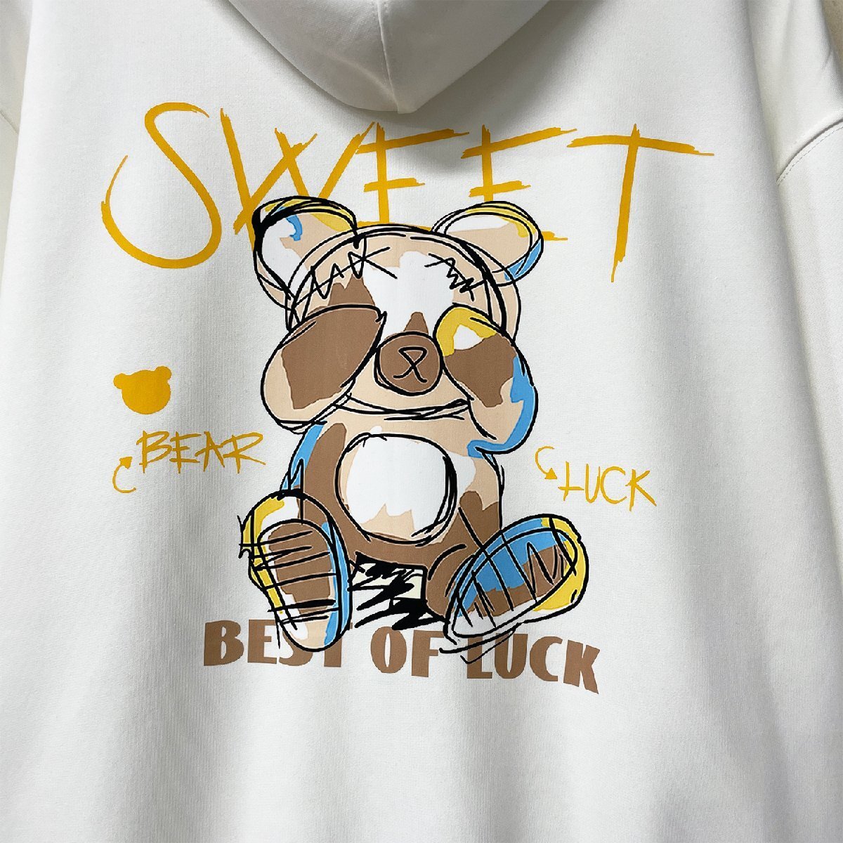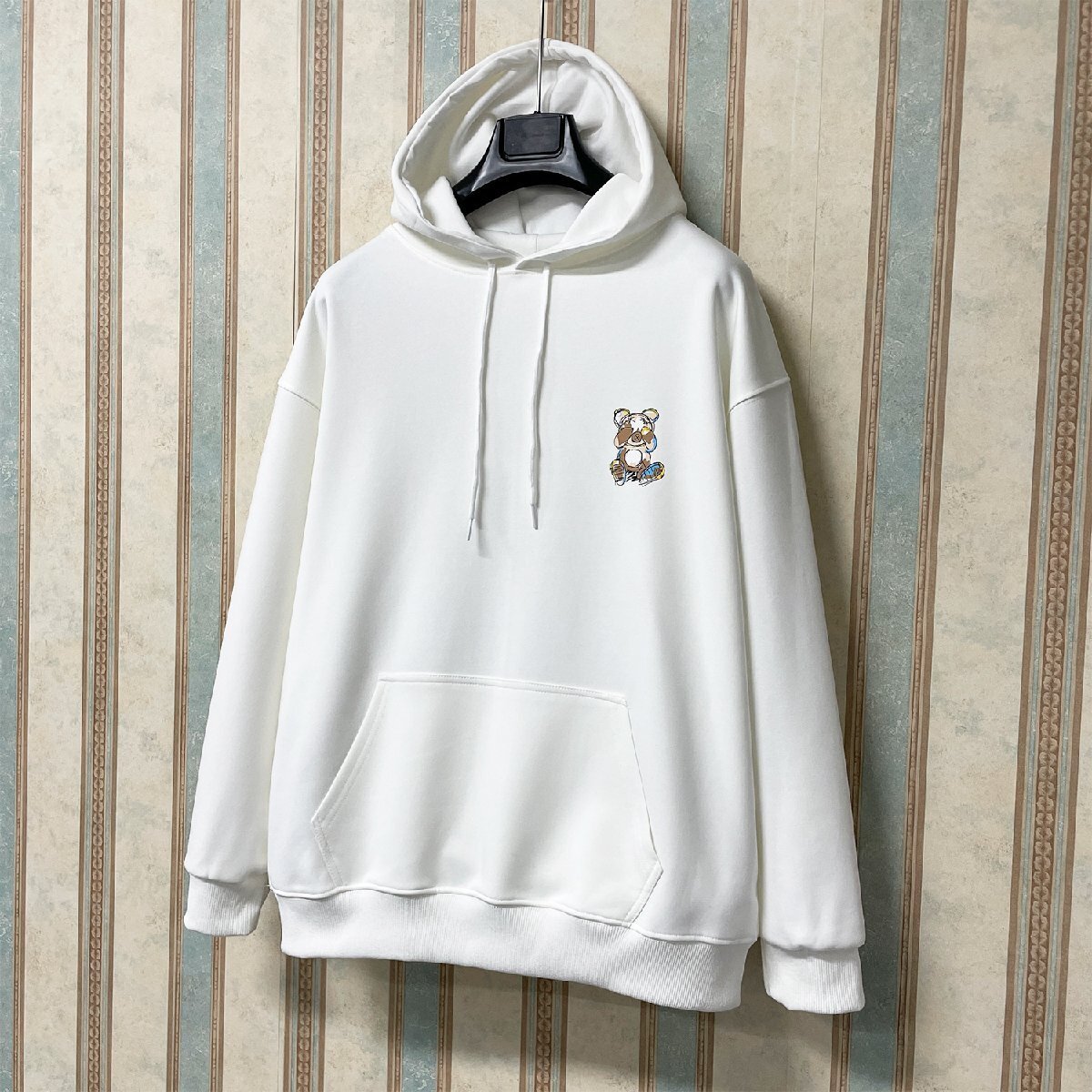 暖かいフードを付いたおしゃれなパーカーは使い勝手がよくなります。バックには遊び心あふれるクマ柄をプリントし、個性的なデザインが他のトップスとは一味違う大人の魅力を醸し出してくれます。フロントにレイアウトされた大きなカンガルーポケットも特徴、収納力が高く、手のやり場にも困らない!!また、袖口と裾にリブをつけているので、窮屈な締め付けはなく、程よくフィットする感じです。