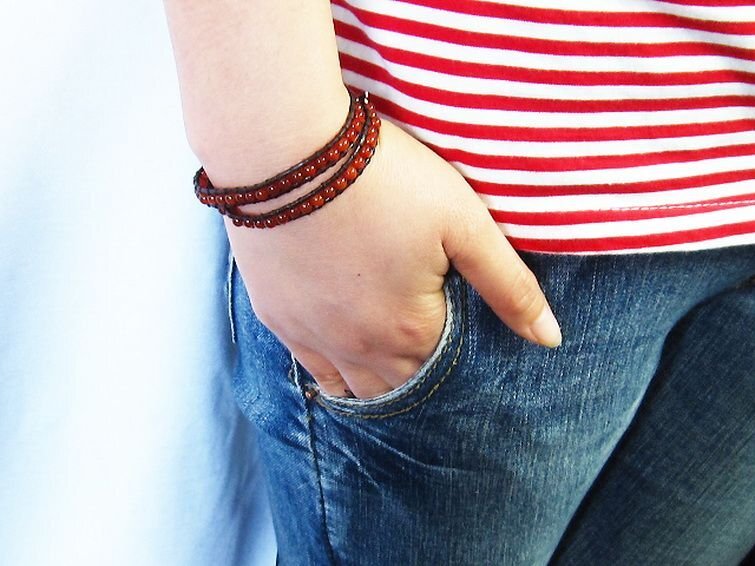 ■商品名: レッドアゲート 4mmビーズ レザー ラップブレスレット ■商品ID: L01-97-7 ■商品重量:約 10.2g ■商品サイズ:粒直径約:4mm 長約:340mm 【アゲート(瑪瑙)】 和名では瑪瑙(めのう)といい、アゲートの模様が馬の脳のように見える事からこのような名前が付けられました。 アゲートは赤、緑、青、黄、黒など、様々な色に着色されることで石本来のパワーがさらにアップするといわれており、着色により魅力を増す天然石はアゲートだけとも言えます。 さらにはアゲートを組み合わせるとペアになっているペアアゲート(トレジャーメノウ)は龍穴を生み出すとされ、風水的にも良いといわれています。 アゲートは古来より日本やインドやチベットなどで魔よけやお守りとされてきました。 失敗や不幸を遠ざけ金運や仕事運、成功運とも結び付けてくれる効果のほか、安産のお守りにも良いとされています。 さらに家庭円満や対人関係をスムーズにするなど、オールマイティな効果を持った石です。 ⇒ アゲートをもっと詳しく ◆ワンポイント情報 アゲートはカルセドニーの変種で、染色がされていなくともそれぞれの種類に多様な色があります。 ざっと仲間を挙げてみてもオニキス(黒)、サードニクス(橙色)、ブルーアゲート(青)、グリーンアゲート(緑)、イエローアゲート(黄)、ブルーレースアゲート(縞青)、モスアゲート(縞緑)、天眼石(縞黒)、カーネリアン(橙色)、ジャスパー(多様な縞)などとても多くの特徴と色合いを持っています。 |