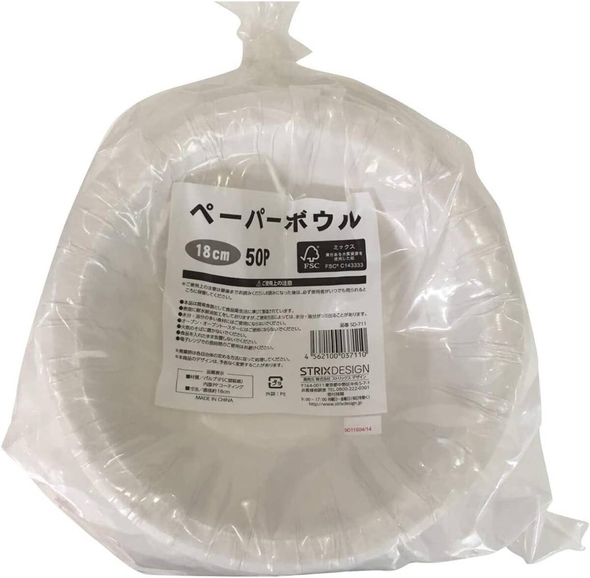 ストリックスデザイン 使い捨て 紙皿 ボウル 深皿 50枚 18cm 白 耐水・耐油加工で染みにくい レンジ対応 業務用 SD-7