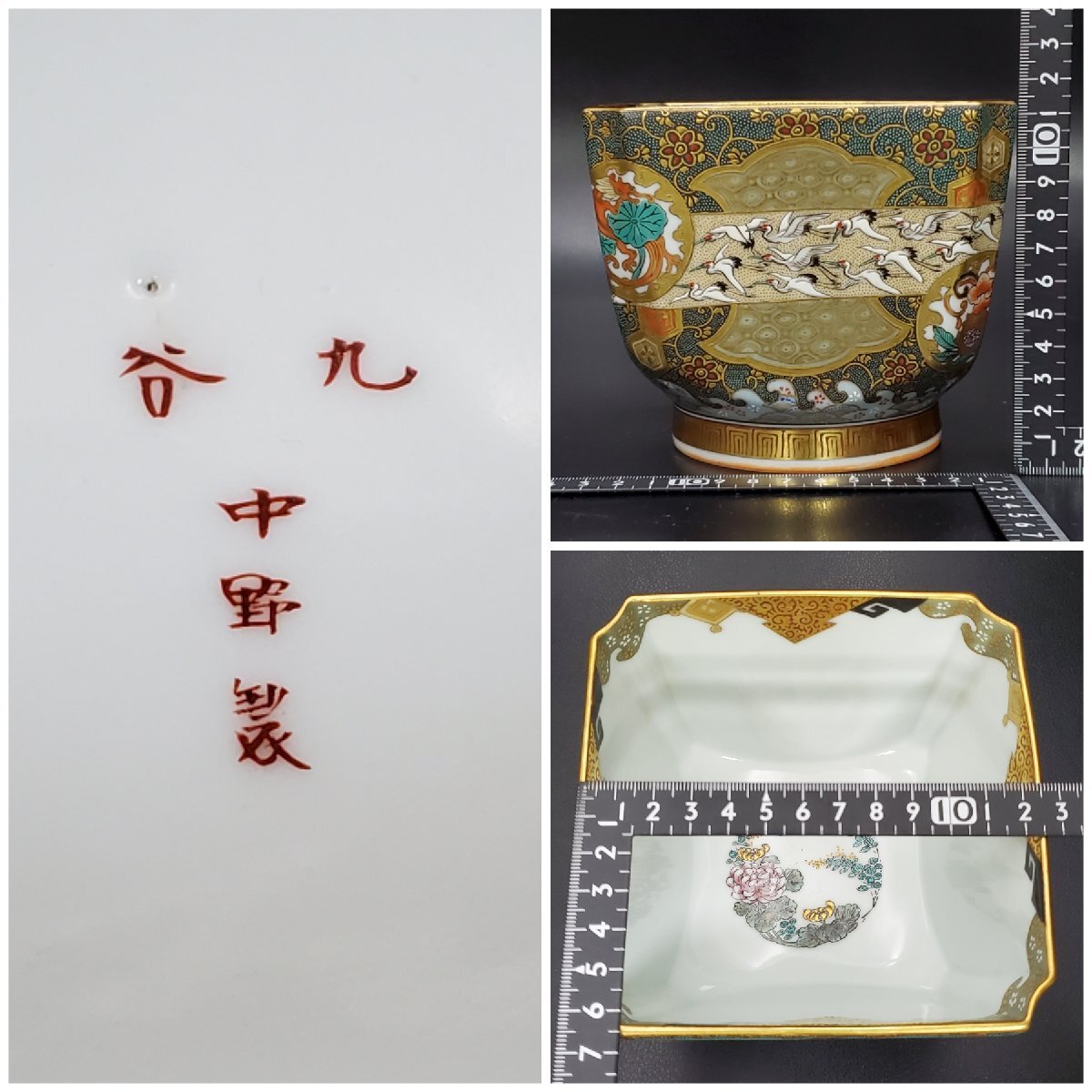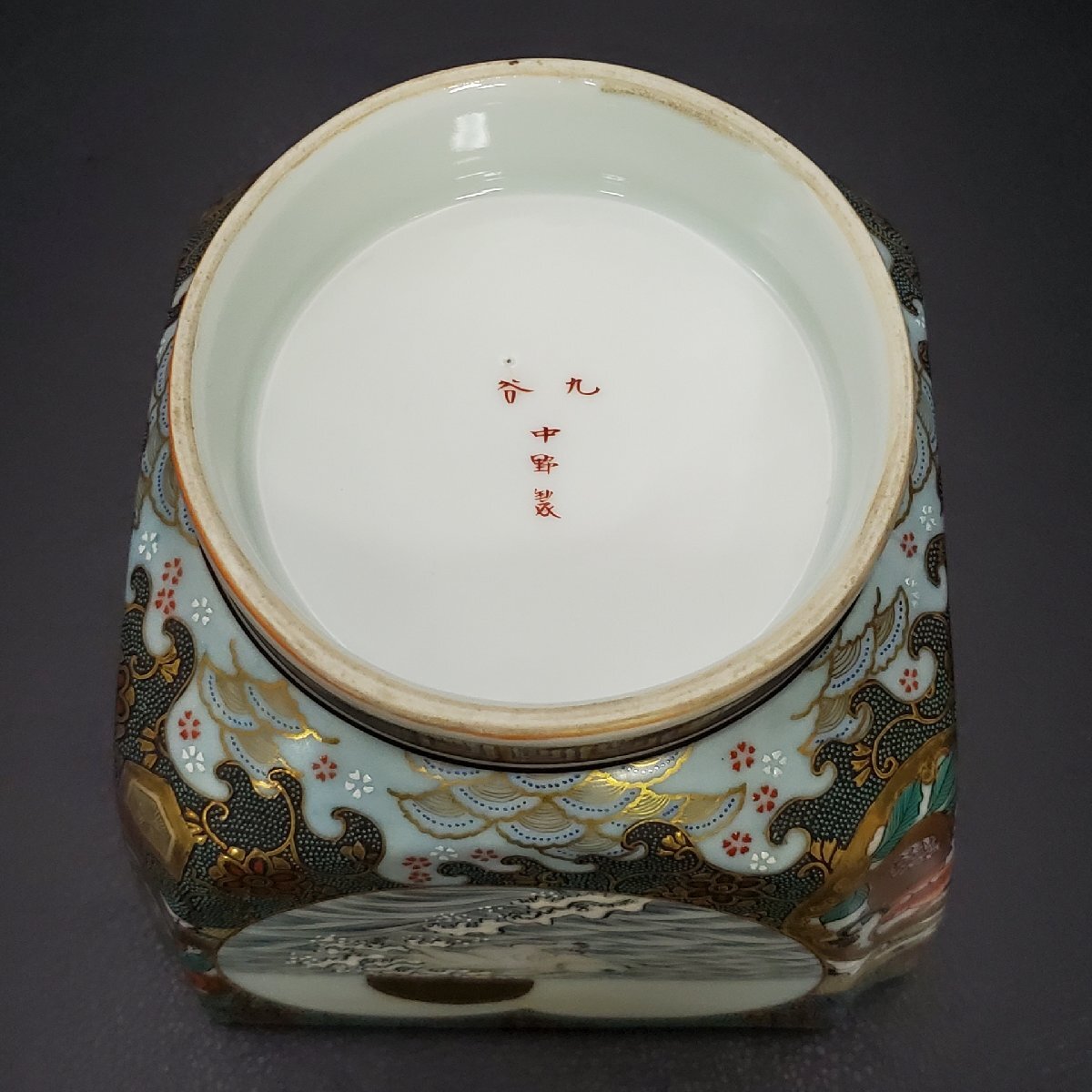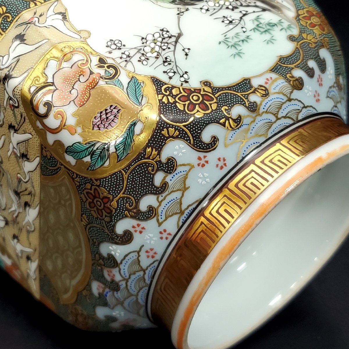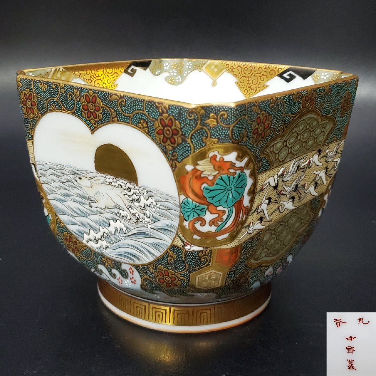 【宝蔵】九谷焼 中野製 細密絵付 豪華金彩青粒花唐草 色絵波兎梅鶯鶴群文 盃洗 杯洗 約12.5㎝ 酒器