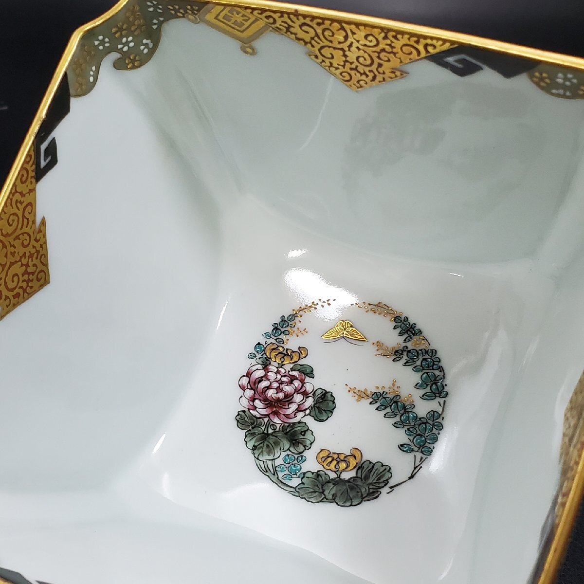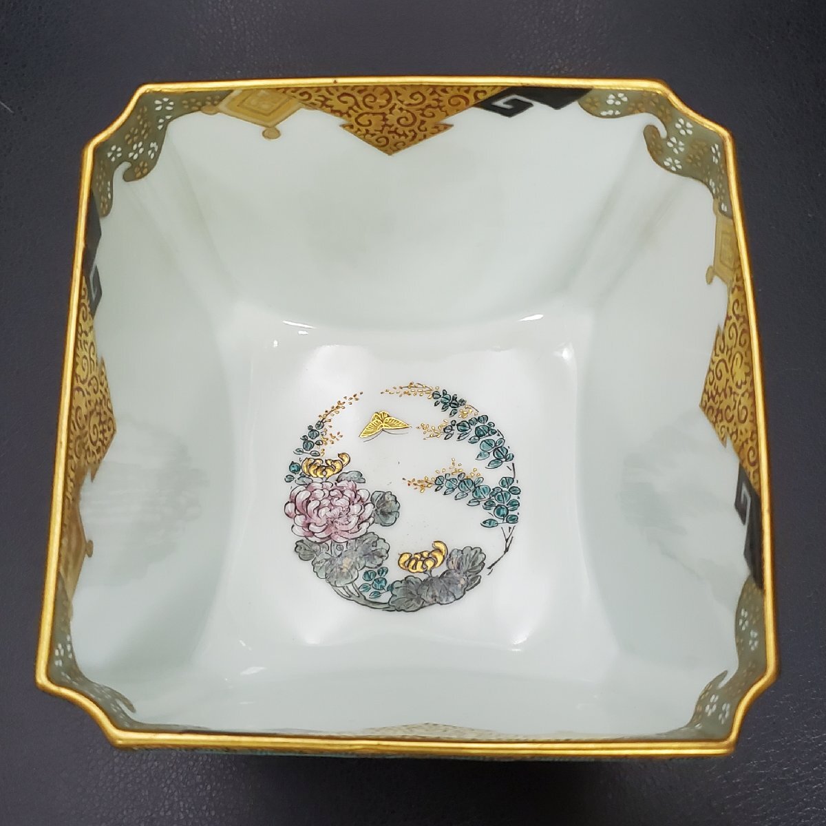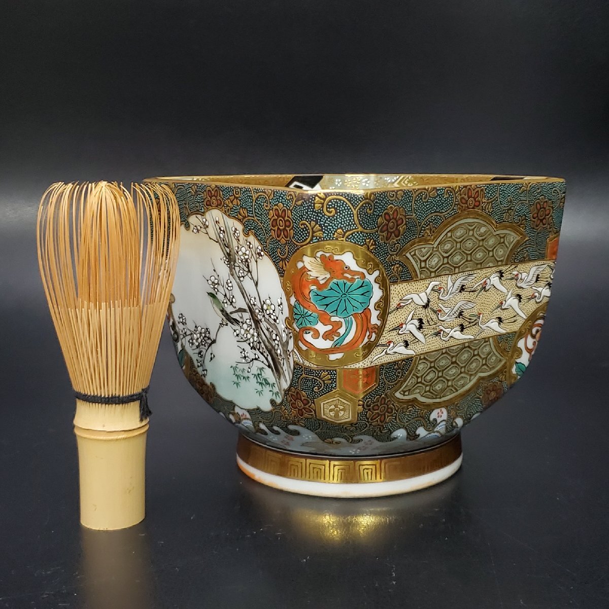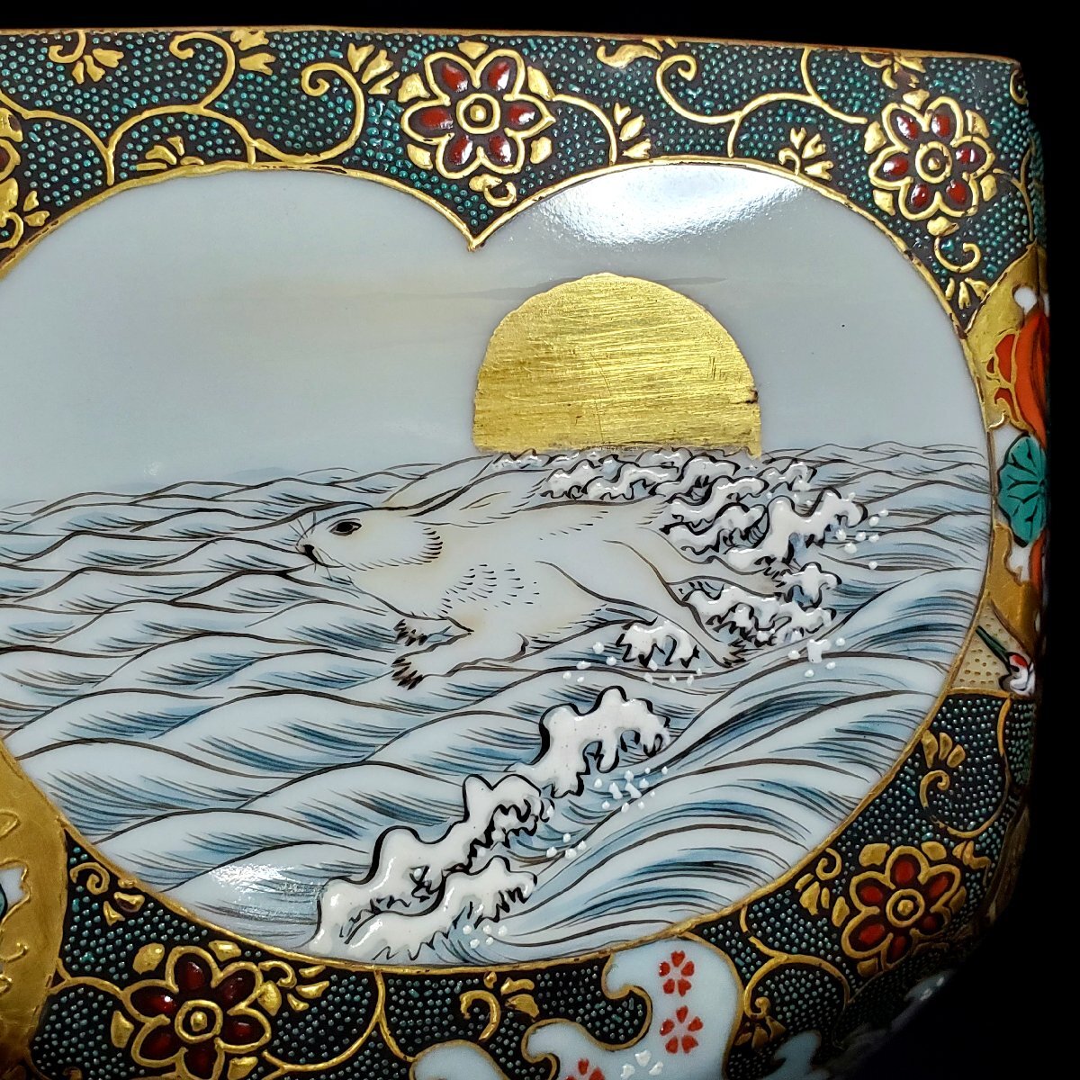 【宝蔵】九谷焼 中野製 細密絵付 豪華金彩青粒花唐草 色絵波兎梅鶯鶴群文 盃洗 杯洗 約12.5㎝ 酒器