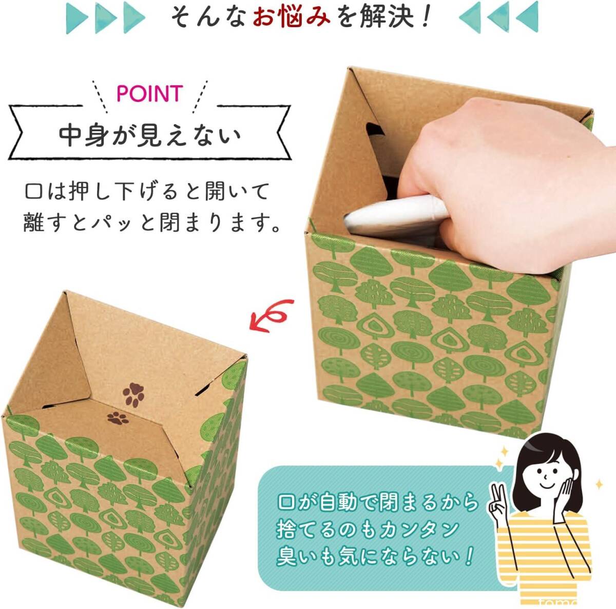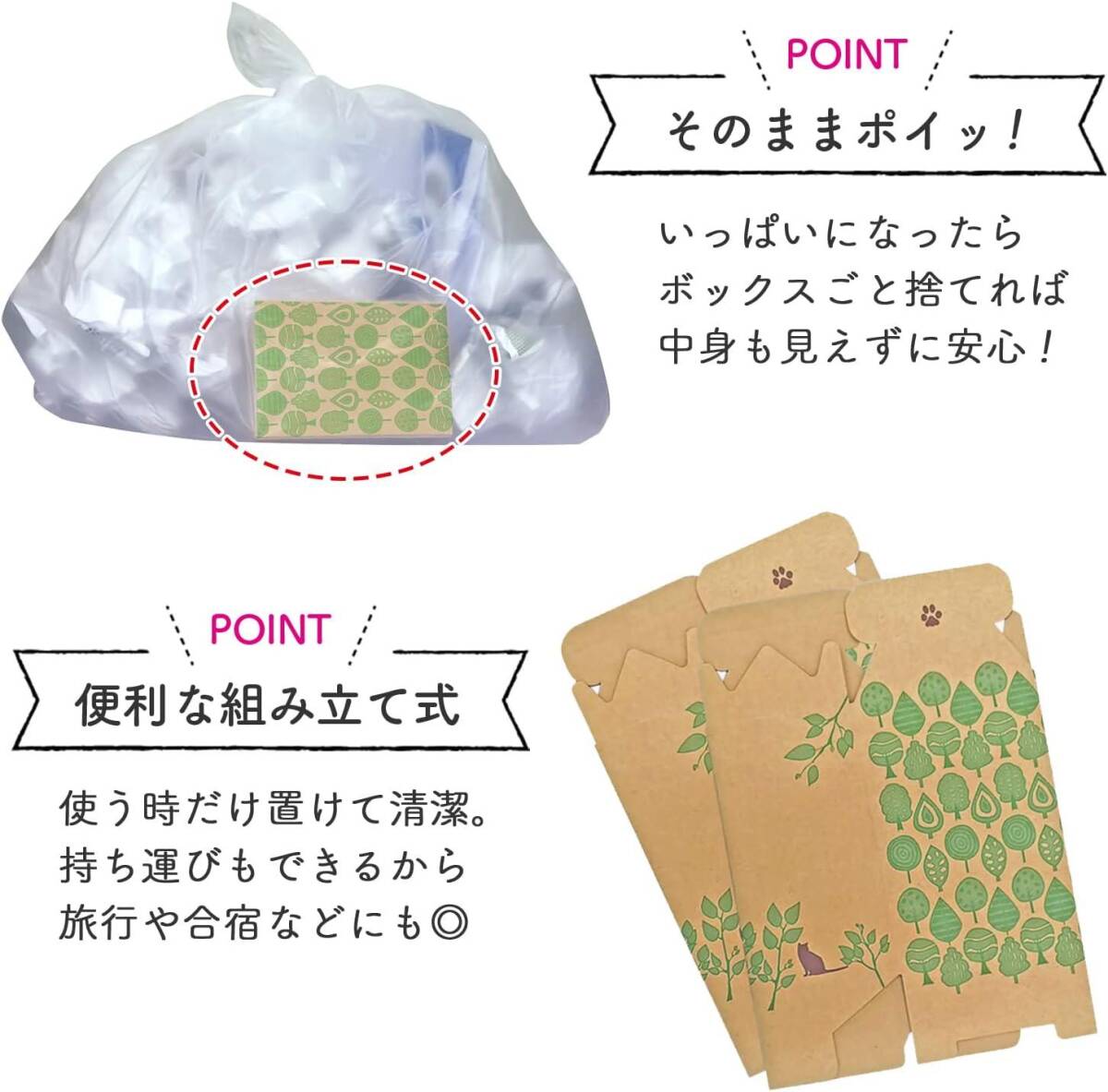 使うときだけ置けて清潔。中が見えない紙製なので、いっぱいになったら箱ごとポイッとごみに捨てられます