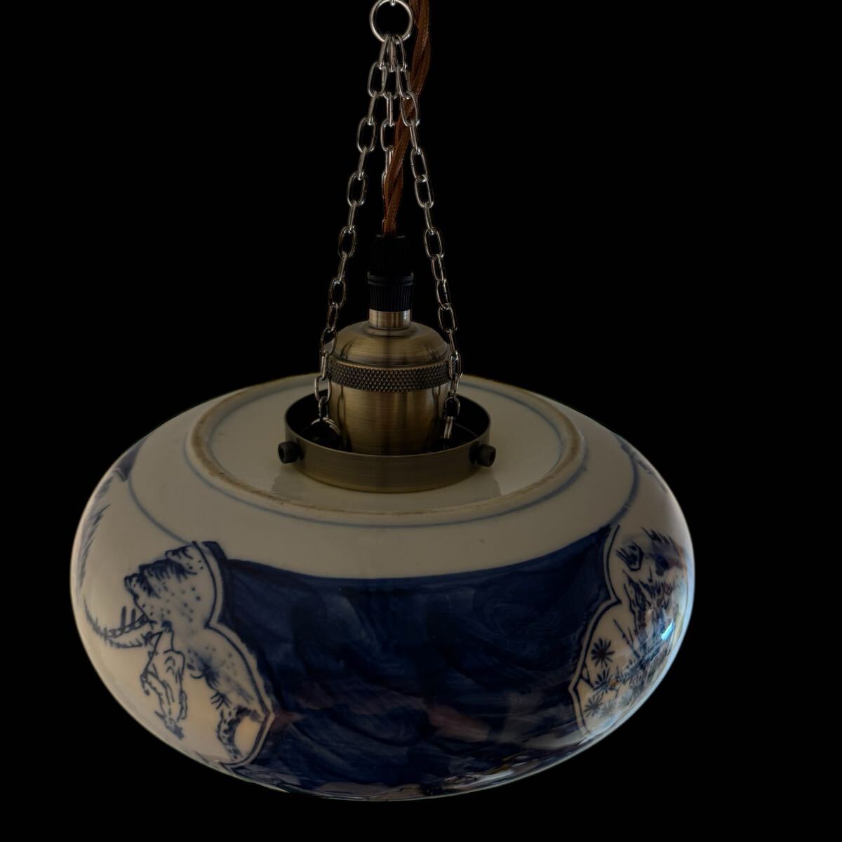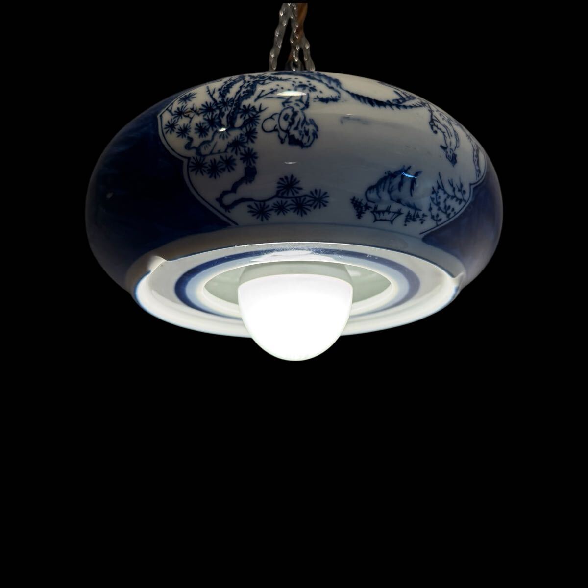 柄陶器のペンダントライトです。味わいのある有田焼の陶器をリメイクして作られています。重量があるため,コードに負荷がかからないように吊元は別に吊れるように作られています。