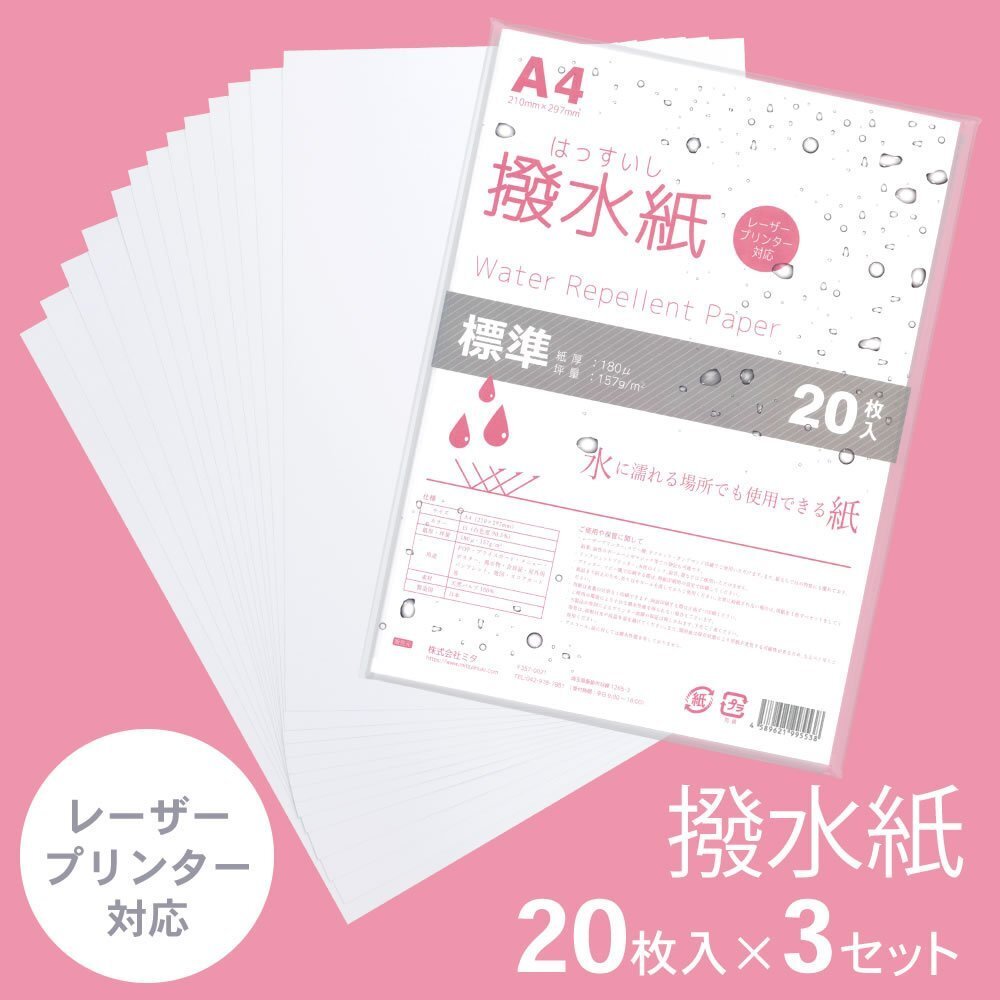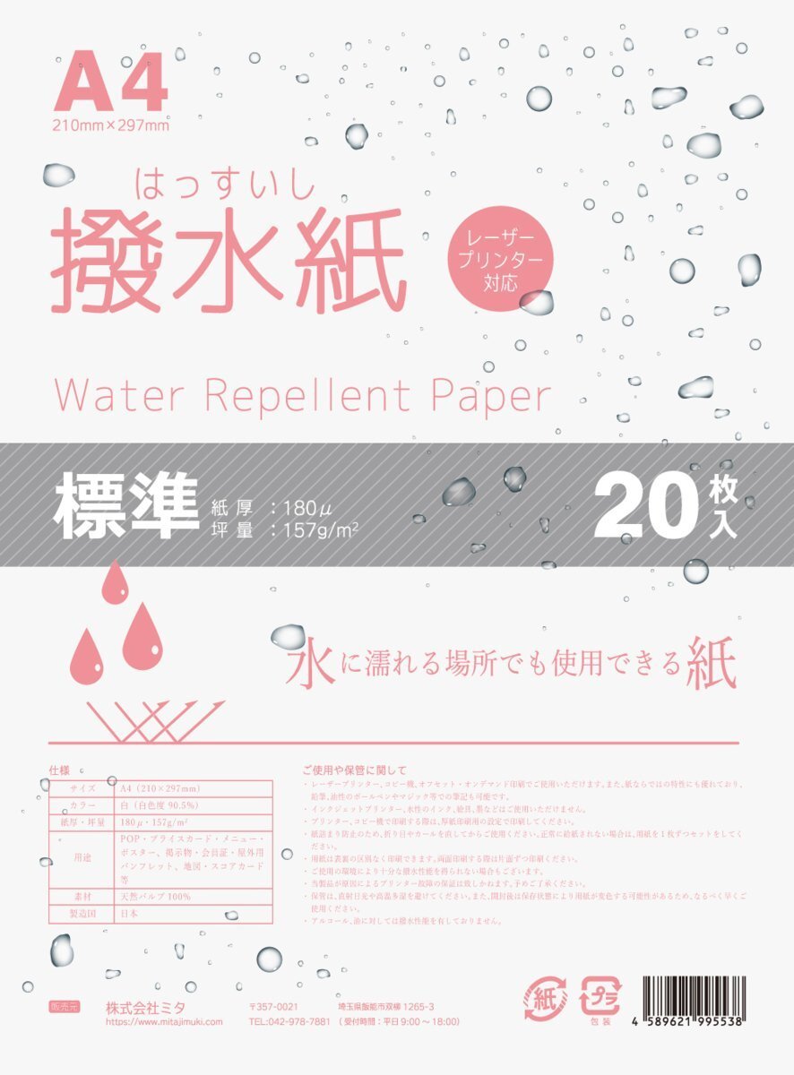 水に濡れる場所でも使用できる印刷用撥水紙 フィルムを併用せず天然パルプ100%使用! ▼▼商品の紹介動画(You Tube)はこちら▼▼ ①ミタ撥水紙と普通紙との撥水効果比較 ②ミタ撥水紙と普通紙を水に浸した状態での筆記性比較 | ||||||||||||||||||||||||||