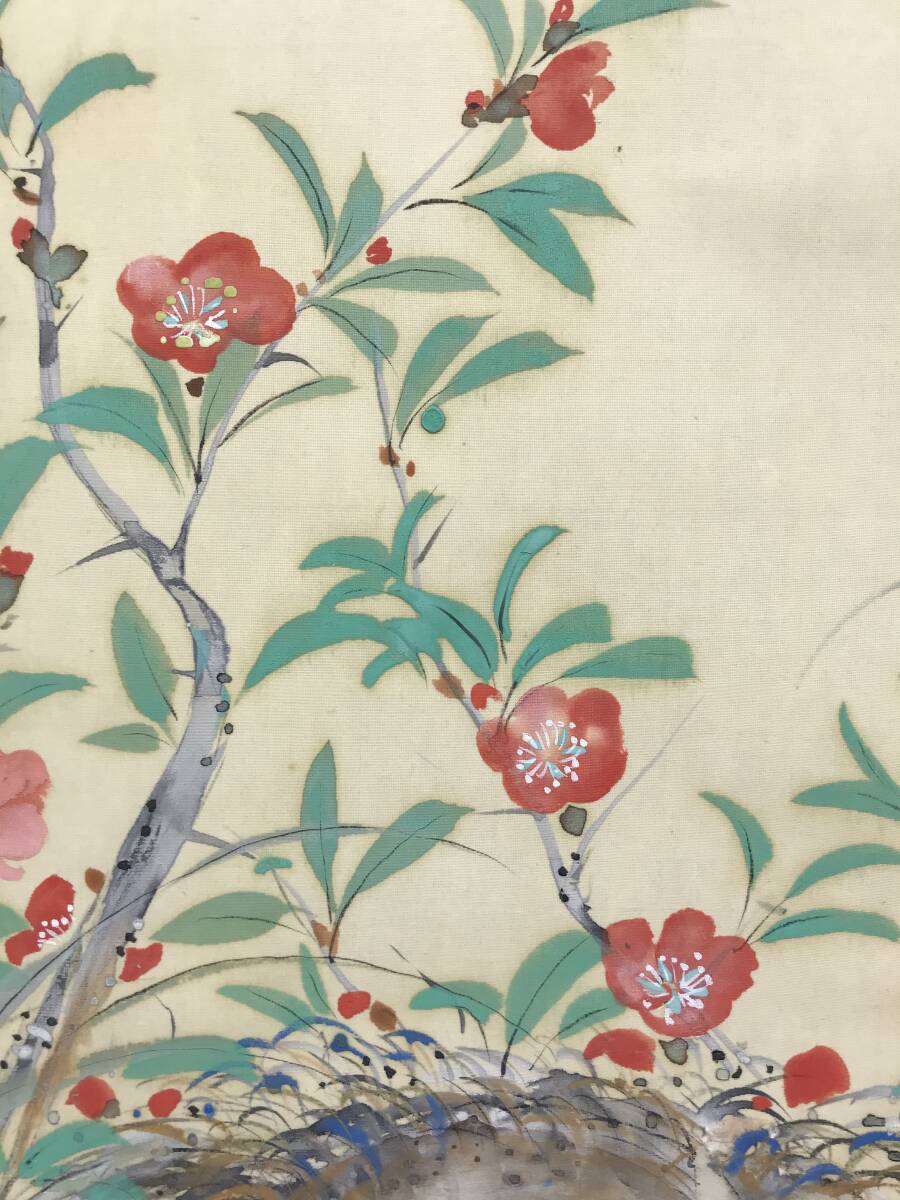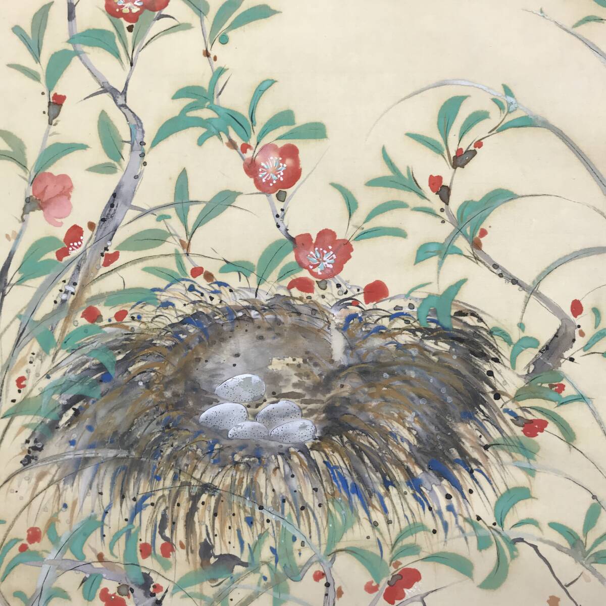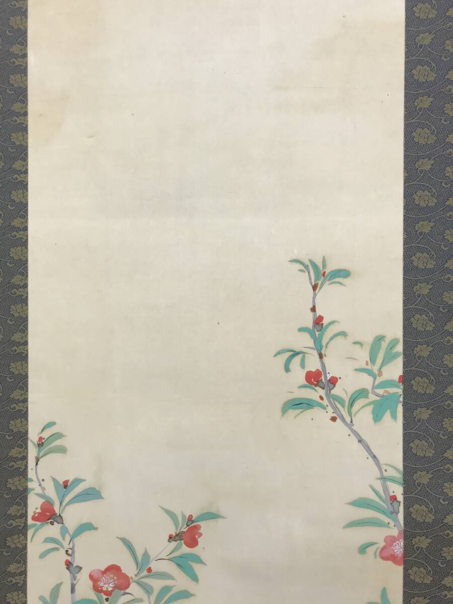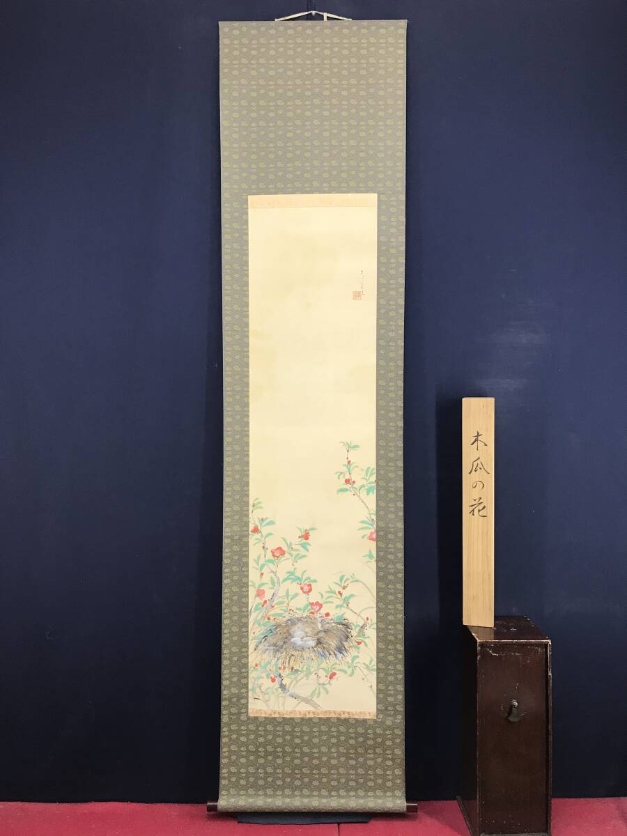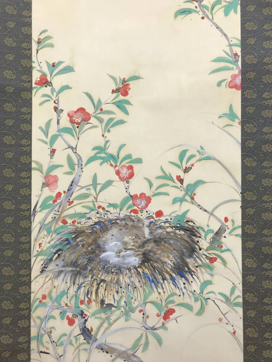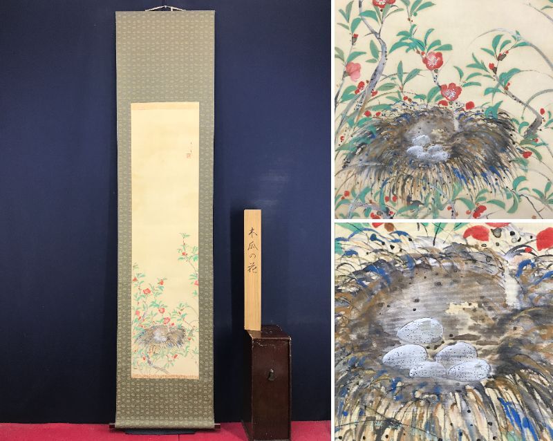 真作/大藪春篁/木瓜の花/ボケ/花木に鳥の巣図/花鳥図/初夏の掛軸/掛軸☆宝船☆AK-108