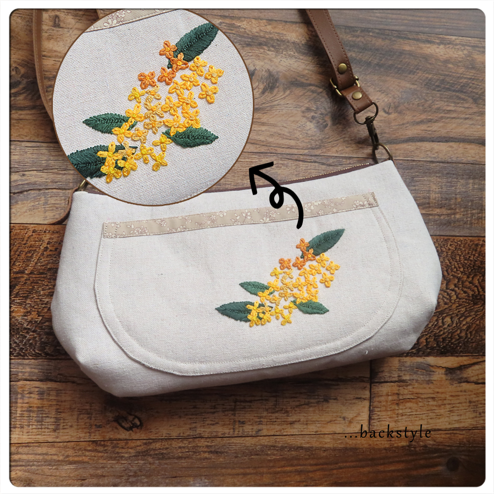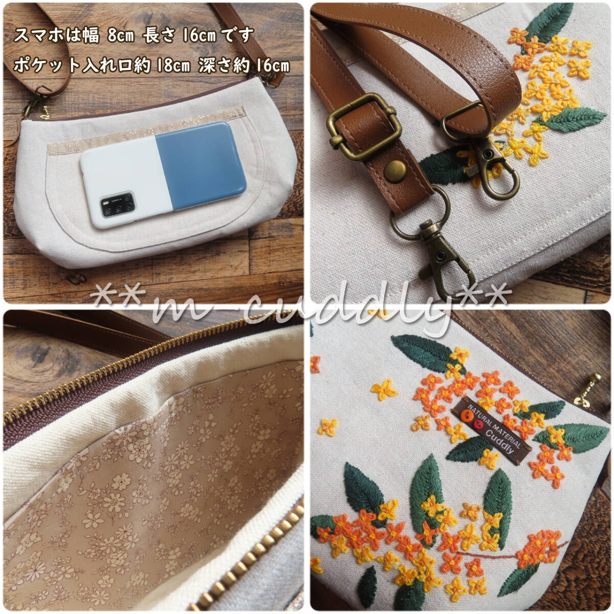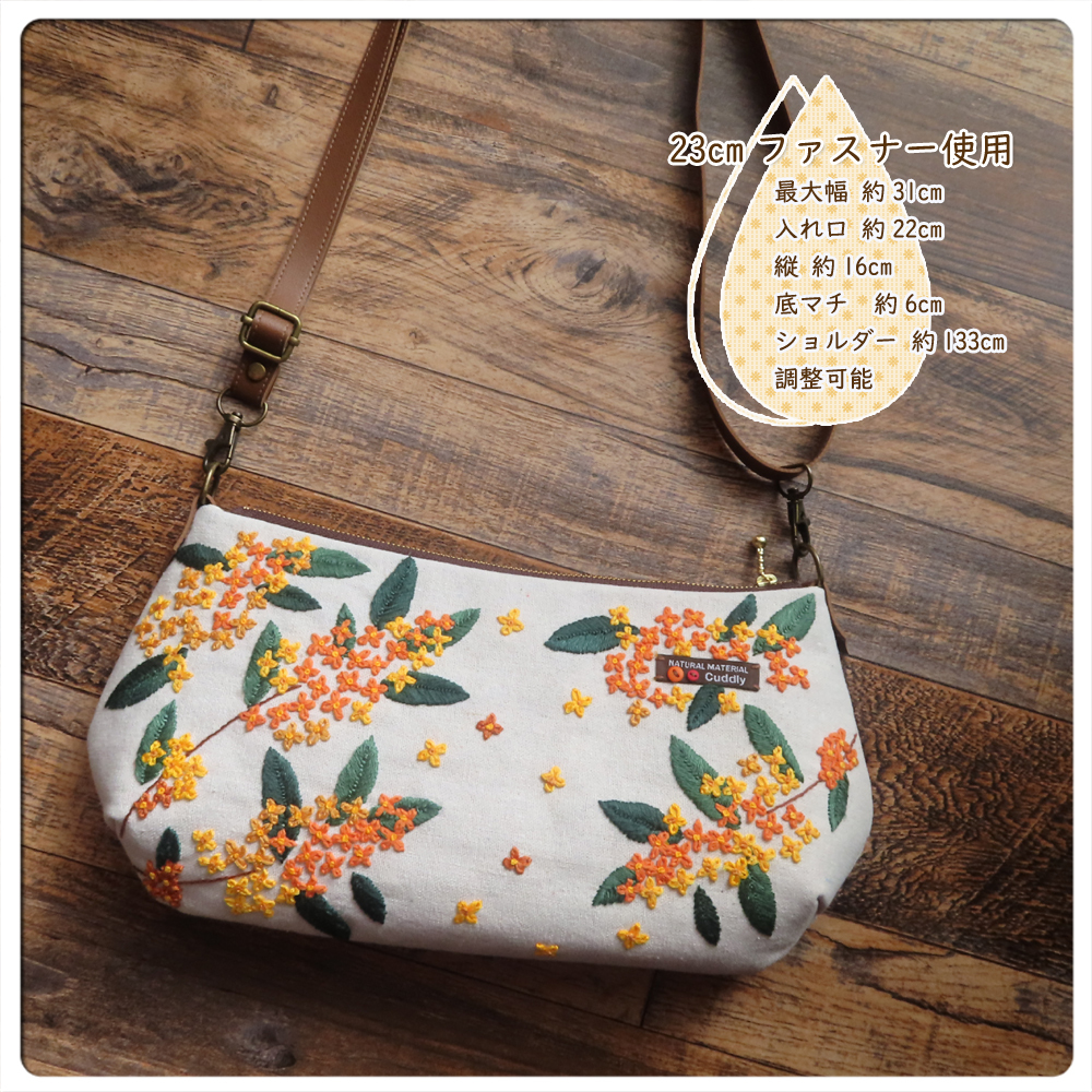 手刺繍 キンモクセイ 23cmファスナー *+ 軽量 リネン ポシェット +* ハンドメイド ショルダーバッグ 刺繍 金木犀 サコッシュ