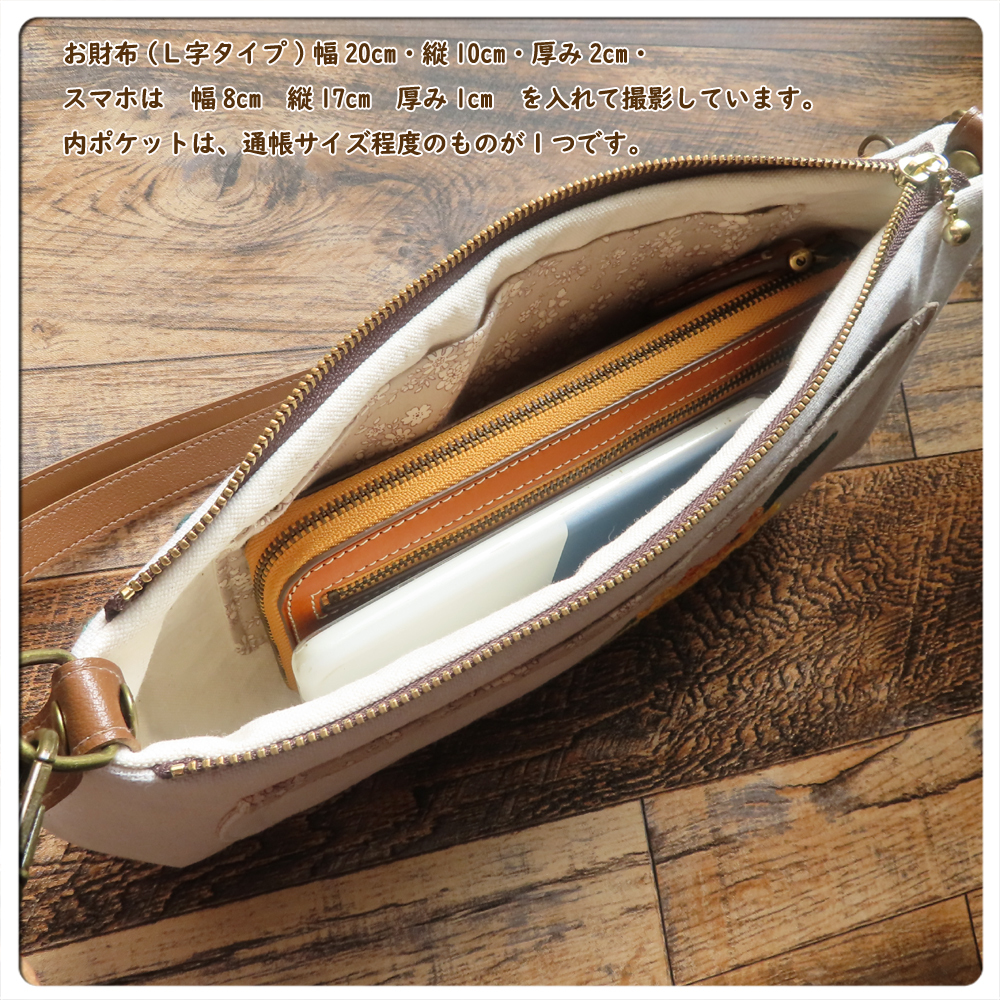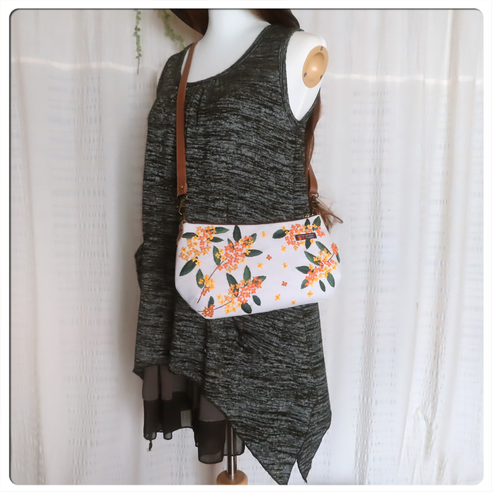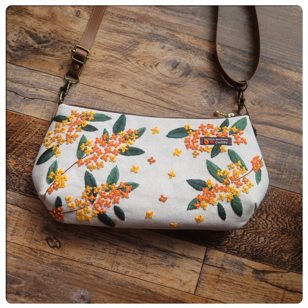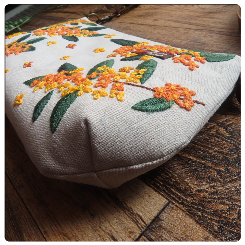手刺繍 キンモクセイ 23cmファスナー *+ 軽量 リネン ポシェット +* ハンドメイド ショルダーバッグ 刺繍 金木犀 サコッシュ
