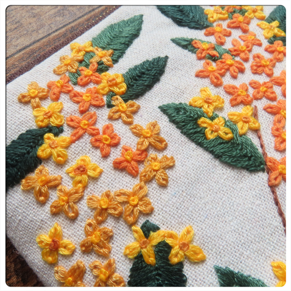 リネンにキンモクセイをイメージして刺繍した小さなバッグです^^