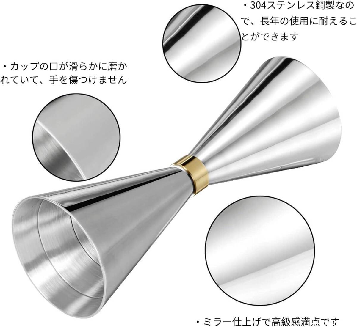 【ジガーカップ仕様】ダブル計量カップ一体型デザイン、小さなヘッドカップは30mlで、内部の目盛り線は10ml、20mlです;大きなカップは45mlで満たされ、内部スケールは15ml、30mlです。そのため、暗い場所でも正確な測定が保証されます。ステンレス製素材を使用し、頑丈で耐久性があります。