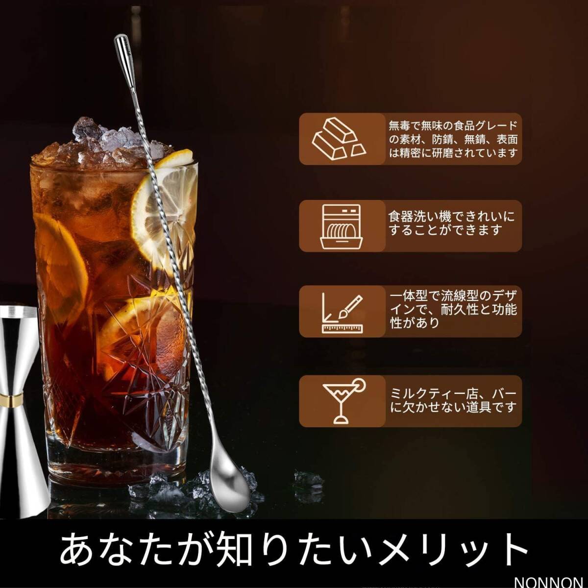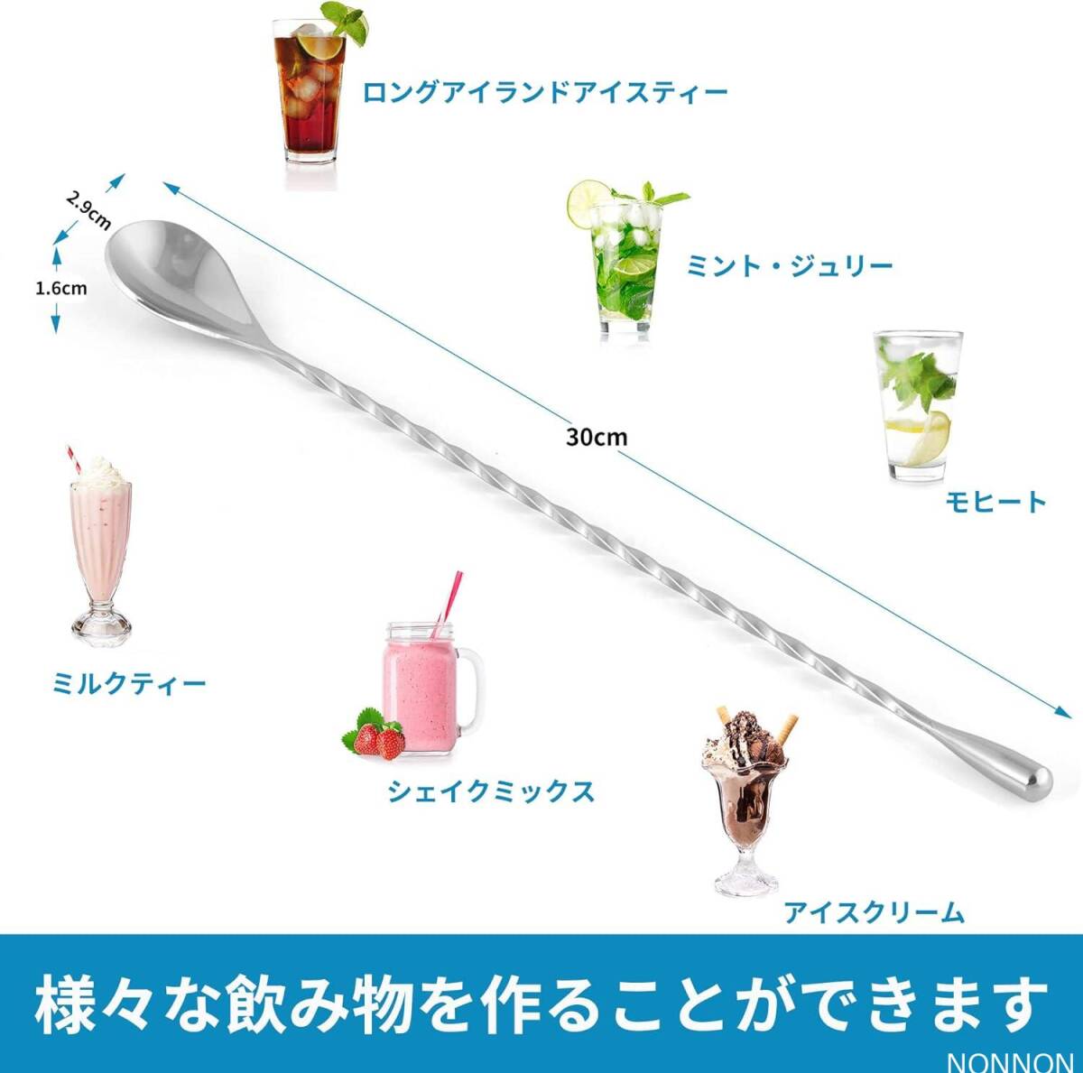 【バースプーン仕様】バースプーンの長さは30cmで、ねじ柄ハンドル、滑りにくい使い心地がいいです。ステンレス製なので耐久性があり、硬度が高く、変形しにくく、持ちやすく、バランスも取りやすく、カクテルも楽しみやすいです。