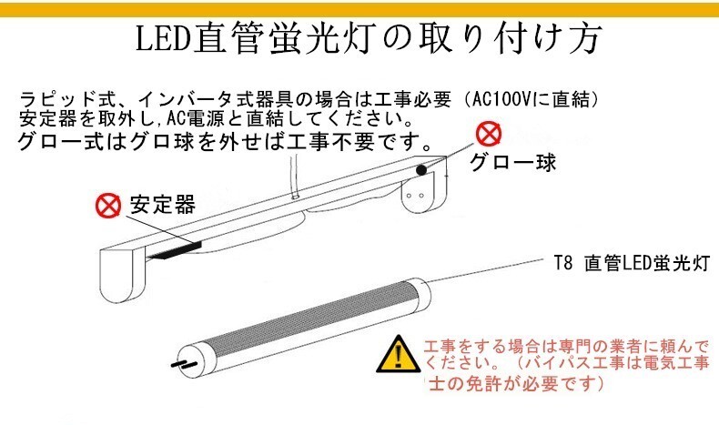 (一般蛍光管と交換するだけで使用できます。ただし、ひとつの灯具に一般蛍光管や他のLED蛍光灯と混ぜて使用しないでください)