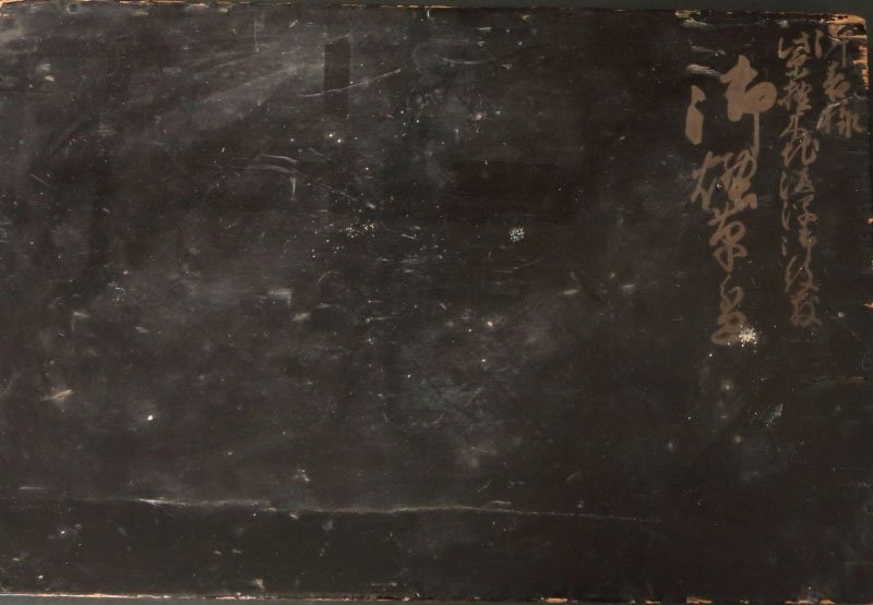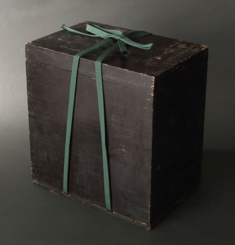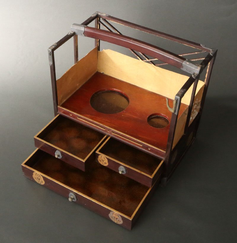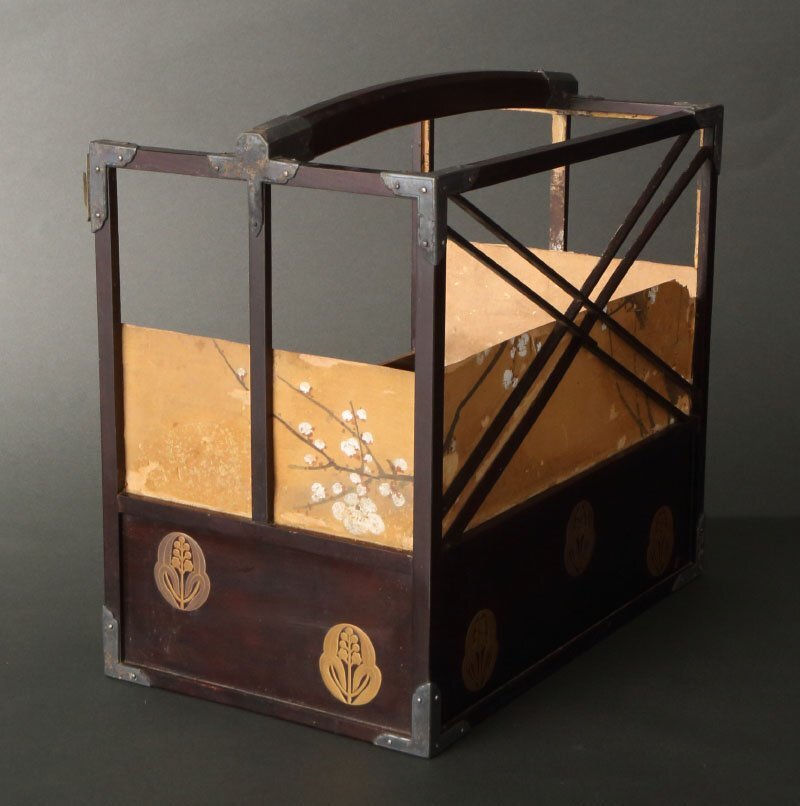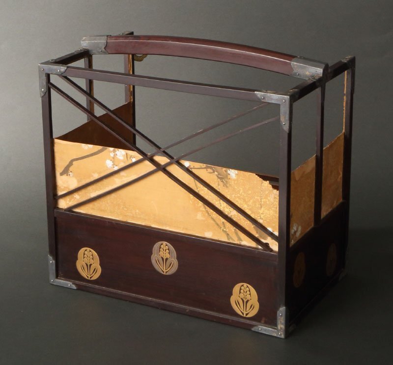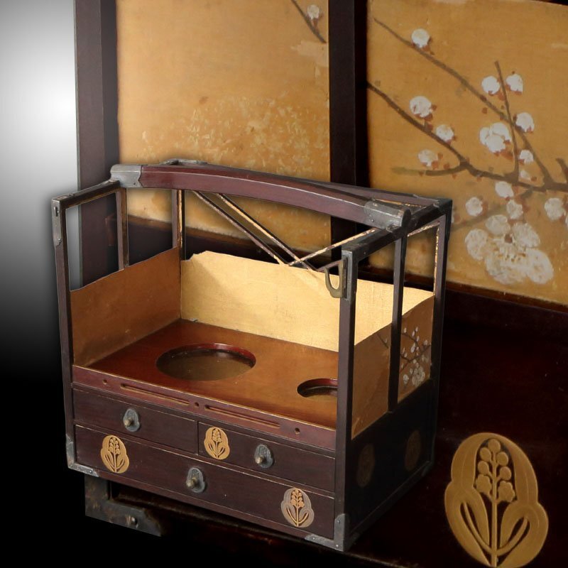 江戸中期の煙草盆です。 「御表様(藩主)」用に特注された沢瀉御紋散の煙草盆です。風覆には梅樹が描かれ、箪笥の金具まで沢瀉の意匠が用いられております。 江戸期には貴顕の用いる煙草盆にも細かな仕来りがあり、江戸城大奥では昼は風景を蒔絵したもの、朝夜は家紋を用いたものを用い、枕元にも煙草盆と枕弁当(非常時の食糧)を置くが喫煙はしないなど、失火の原因となりうる煙草盆は慎重に扱われたことが判ります。本作は参勤の途上でも一服ができるように工夫され、火事を戒めるべく累代の武門の誇りである家紋蒔絵を施したものでしょう。 洒脱な感性とそれに応える精緻な仕事が愉しめる逸品です。 付属:識箱(蔵判貼付)がございます。 寸法:高さ24cm、幅17cm、奥行26cm(最大幅。若干の誤差はご了承下さい) 状態:経年のイタミ、金具一部欠、漆ハゲ、ワレ、キズがございます。 |