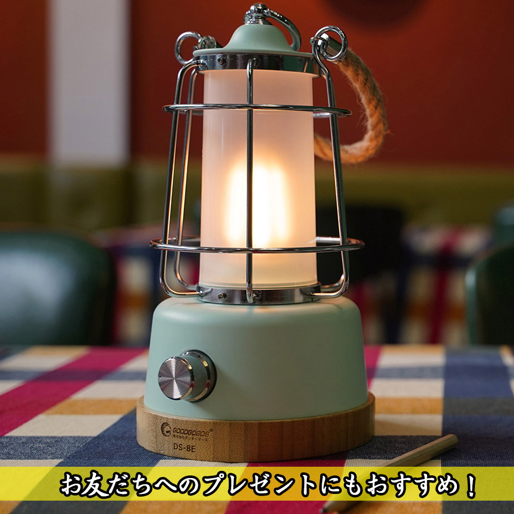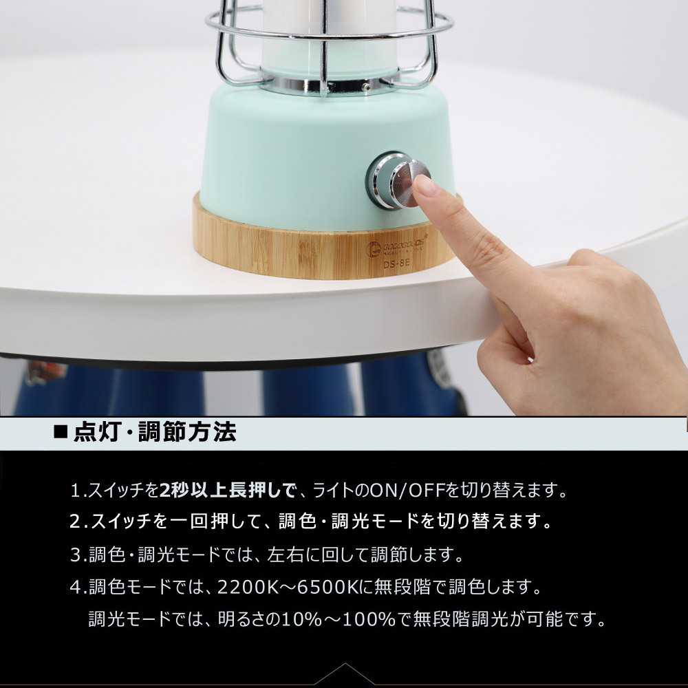 ★オススメポイント★ 無段階で調光調色できるアンティーク調ランタンです。 キャンプランタンとしては勿論、インテリアとしてもおススメです。 充電式で、乾電池も使用できますので、防災グッズとして、災害の備えにもおススメです。 可愛いパステルグリーン 一目ぼれしてしまう、レトロなデザインと可愛らしい色味。 無段階調光&調色 明るさは10~400lmまで。色温度は2200K(電球色)~6500K(昼光色)まで、ダイヤル式ボタンで自在に調節できます。 USB充電式&電池式 USB充電式と電池式の2種類給電方式があります。 ●USB充電式: USB充電ケーブルは付属していますので、ノートパソコンやモバイルバッテリーなどから簡単に充電できます。 ●電池式: 単3乾電池でも使用できます。 汎用性に優れた単三乾電池*3本を使用し、突然の停電や充電切れにも安心です。 ※単3乾電池は別売りです。 常用点灯時間は驚異の最大75時間 最大400ルーメンの出力で5時間、10ルーメンで75時間以上点灯できます。 アウトドアや停電時にも優しくしっかり灯ります。 高いデザイン性 ハンドル部分に麻紐を、土台部分には竹素材を使用しています、お部屋や玄関先などインテリアの一つとしても存在感のあるデザインです。 ●便利な持ち手: ハンドル部分は麻紐で、持ち運びのほか、ランタンポールやテント内などに吊り下げるのも可能です。 ●USB出力ポート: アウトドアや緊急時、スマホなどUSB機器の充電用モバイルバッテリーとしても使えます。 ●防眩加工: 2重防眩カバーで光源を包み眩しさを軽減し、目に優しく温もりのある空間を演出します。 充電池・乾電池兼用式 ミニドライバー付属していますので、充電池の交換や乾電池での使用は簡単にできます。 |