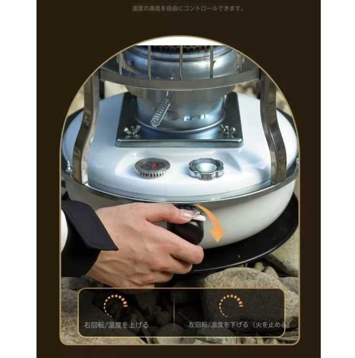 ★温度調整、右に回す/温度を上げる、(左に回す/温度を下げる(火を止める))。
