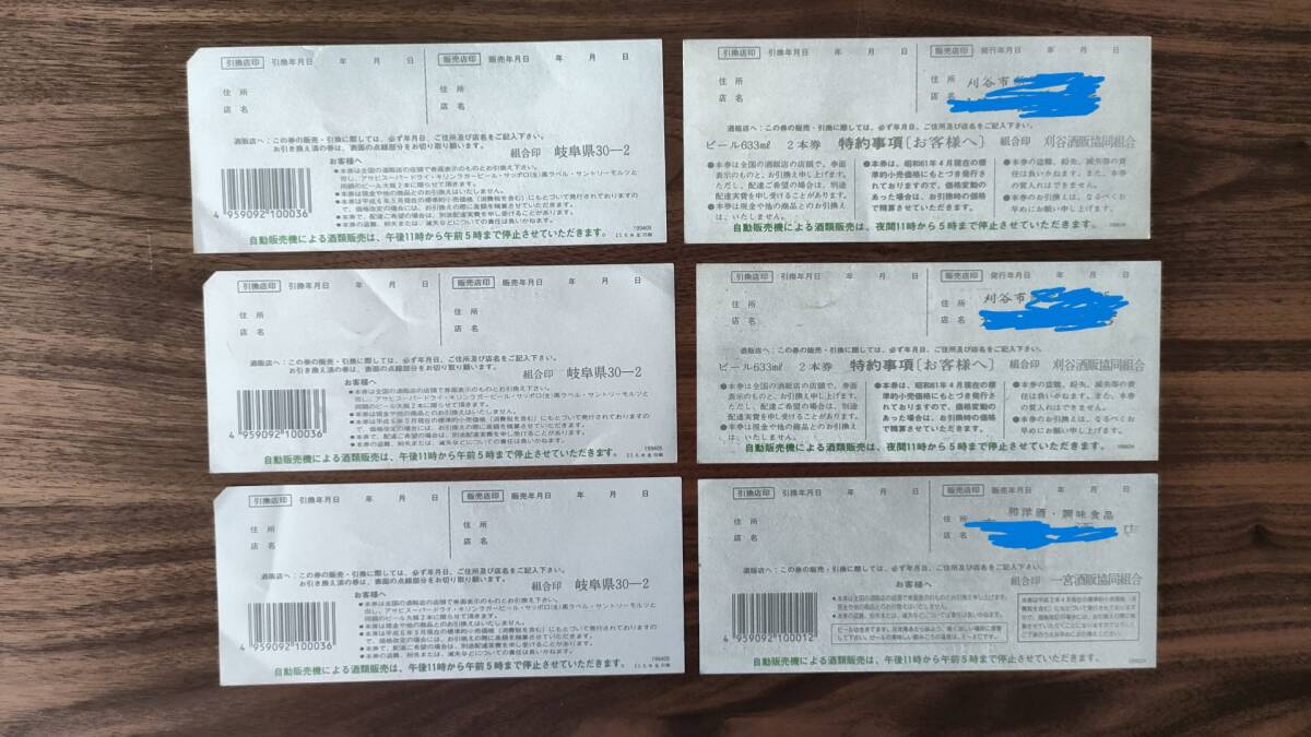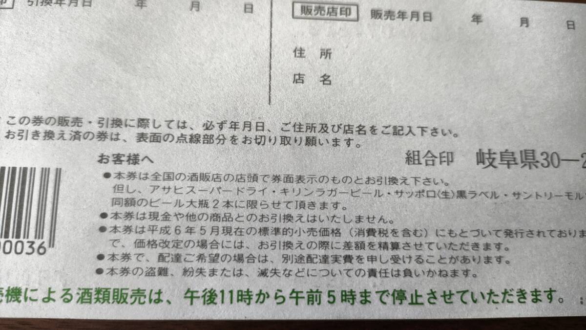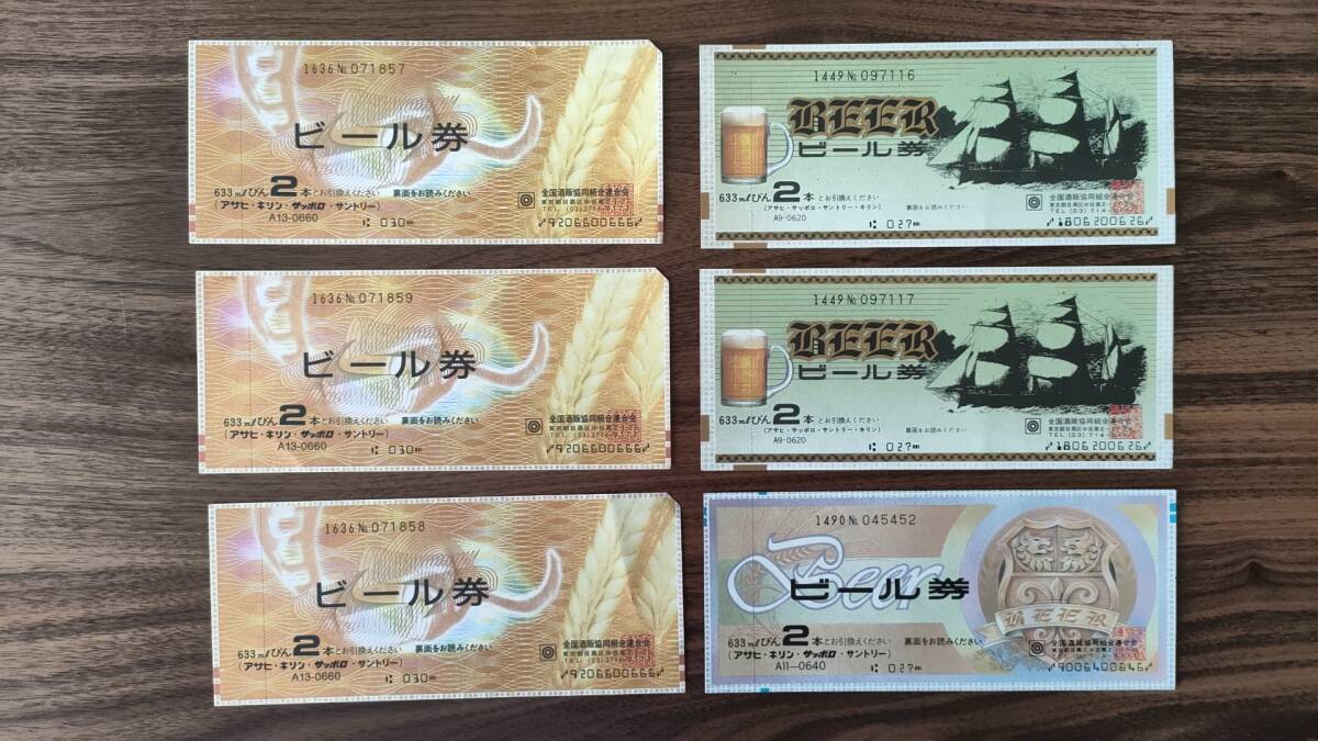 【未使用】ビール共通券 633ml瓶2本分 ×6枚 昭和61年 平成2年 平成6年発行 全国共通券