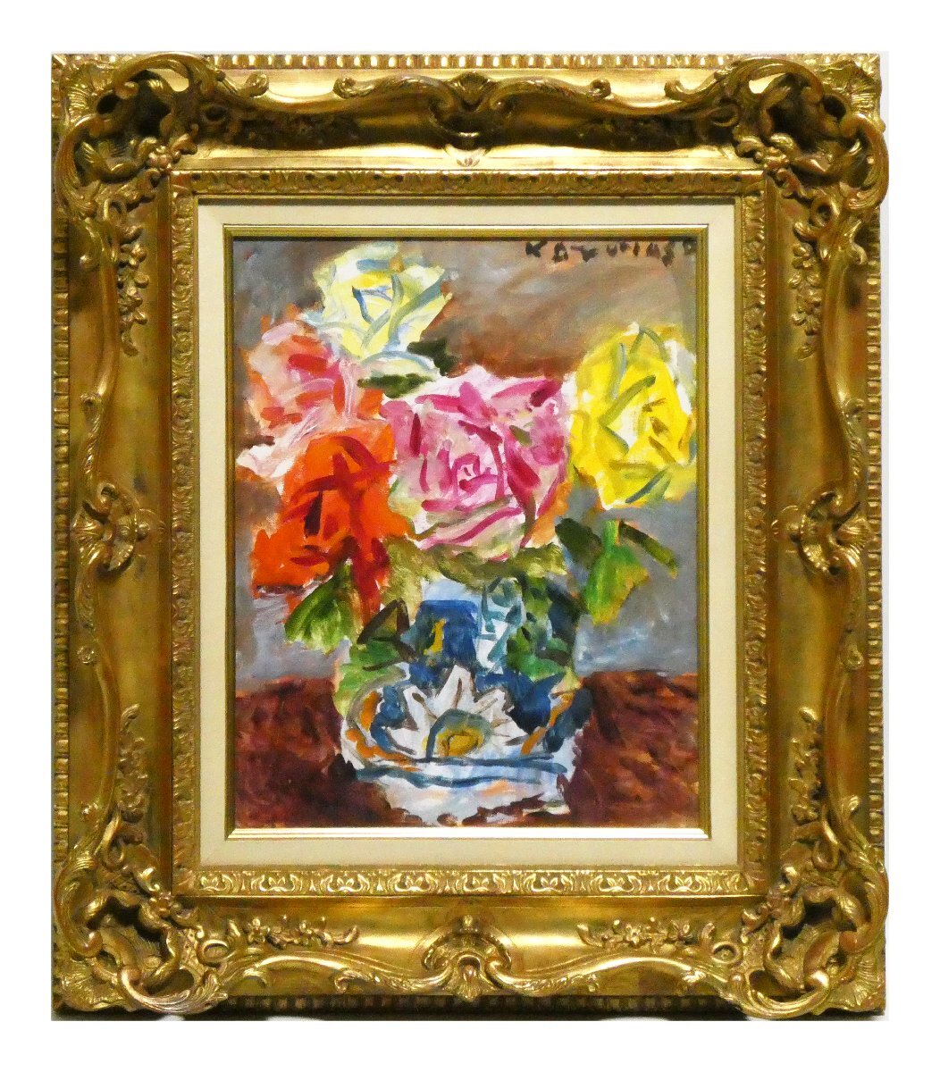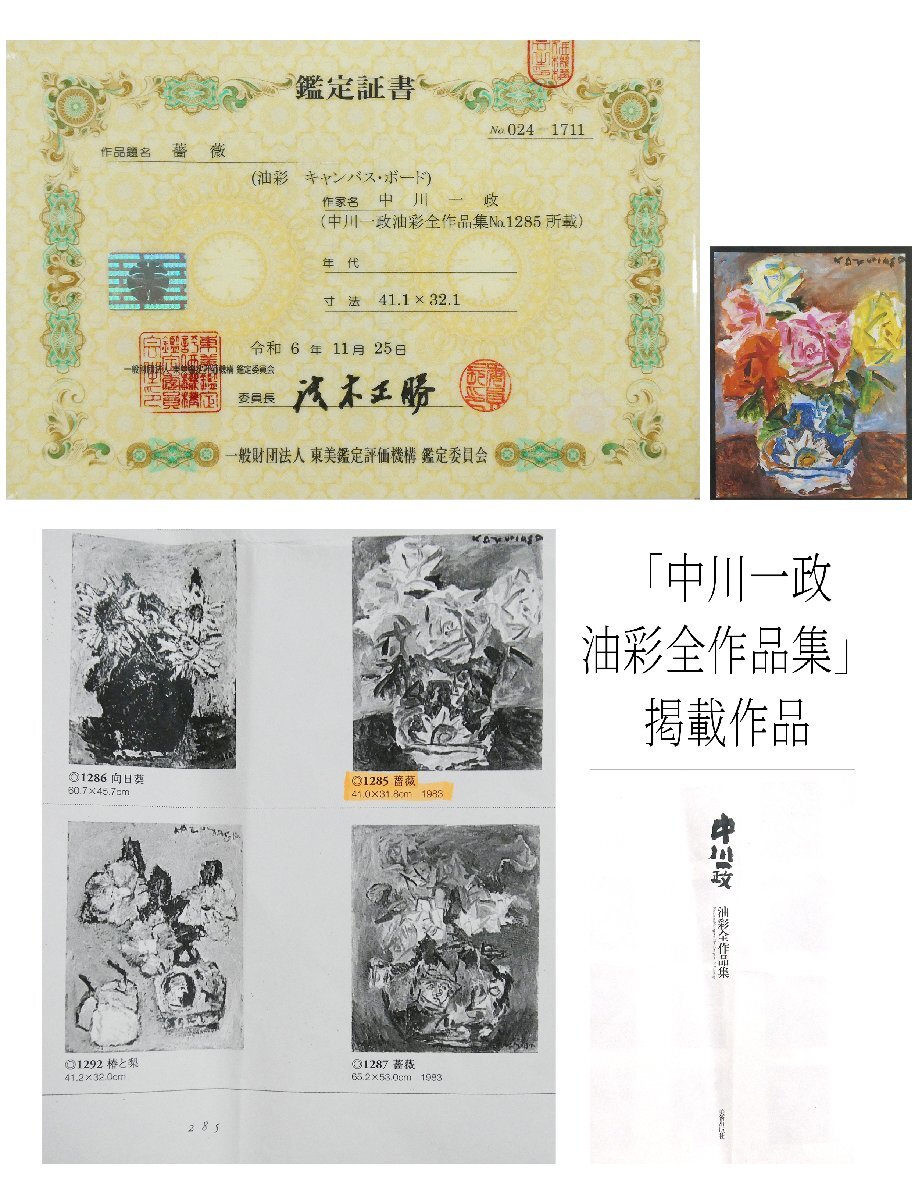 「中川一政 油彩全作品集」285項 No.1285掲載作品 豪快な筆致と鮮やかな原色が魅力の画家・中川一政画伯。 画伯の魅力があふれんばかりに詰め込まれた薔薇の花。 鮮烈な色彩の花々からほとばしる生命力は、私たちを明るく元気づけてくれます。 東京美術倶楽部の鑑定証書が付属します。キャンバスボードに油彩で丹念に描かれた逸品です! |